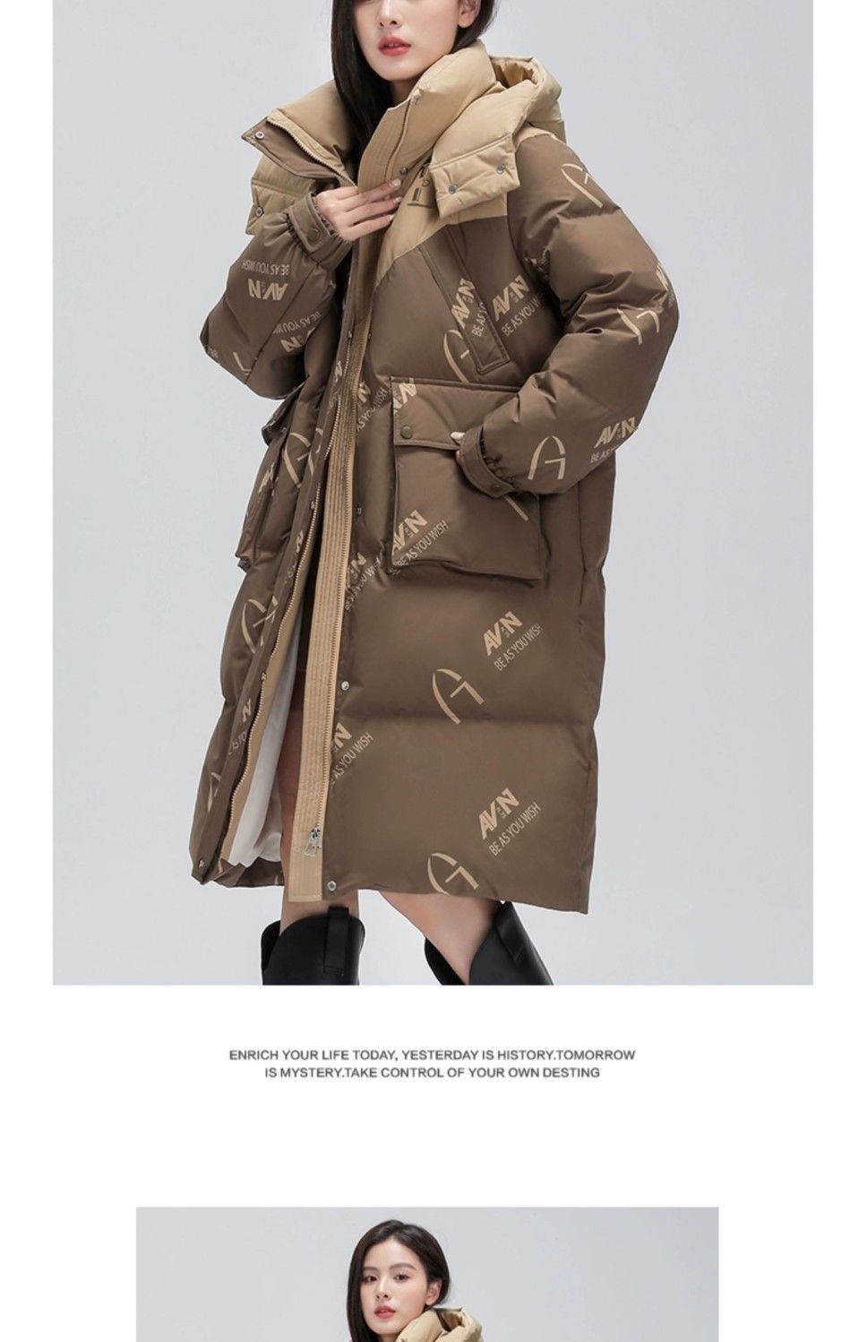 새로운 따뜻한 무릎 위 다운 재킷 여성의 중간 길이 패션 인쇄 두꺼운 후드 겨울 클리어런스 재킷 309스토어 가기