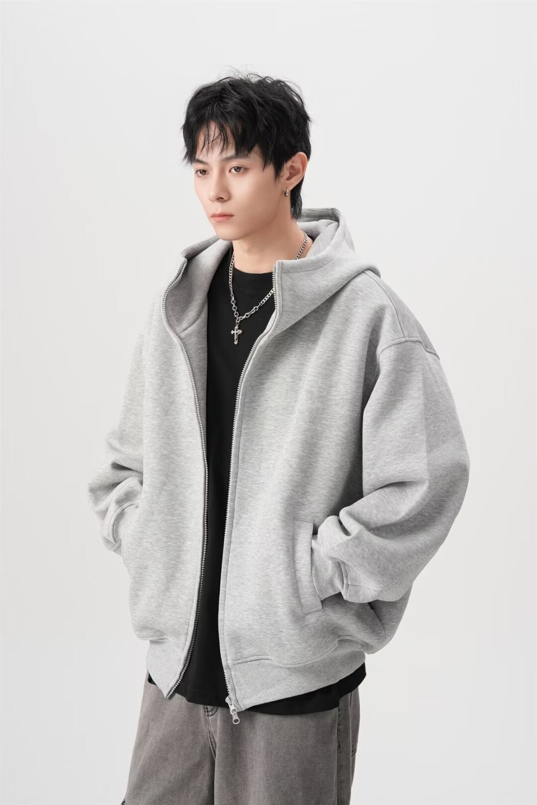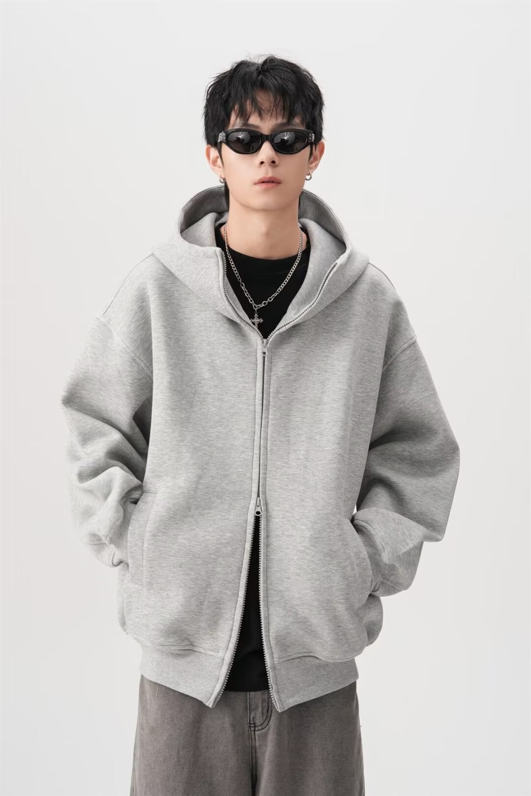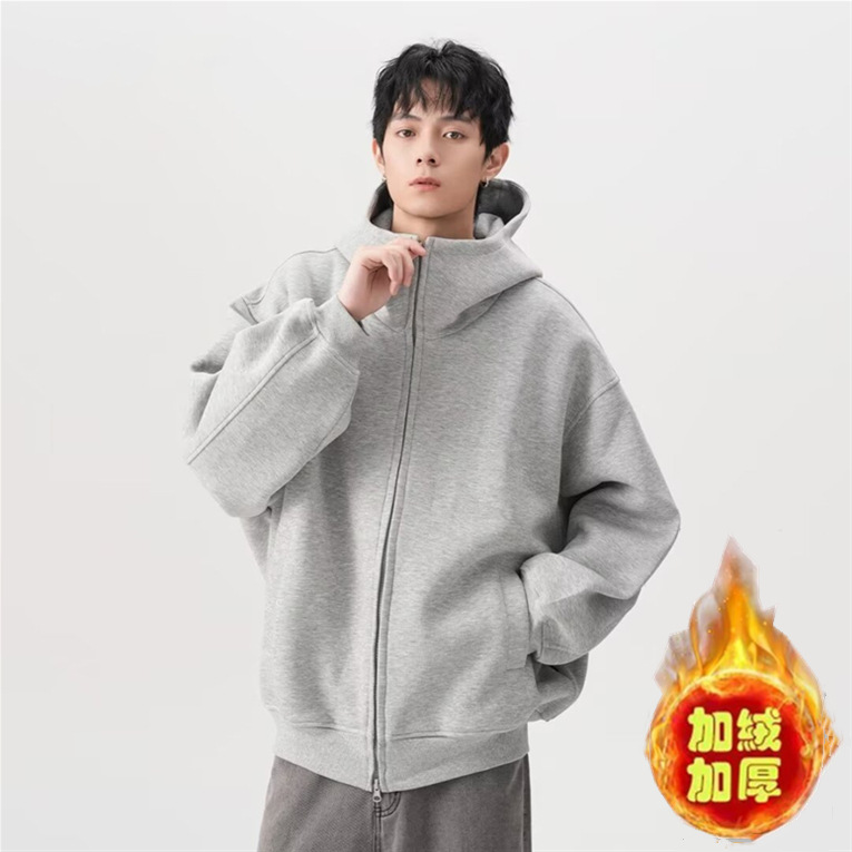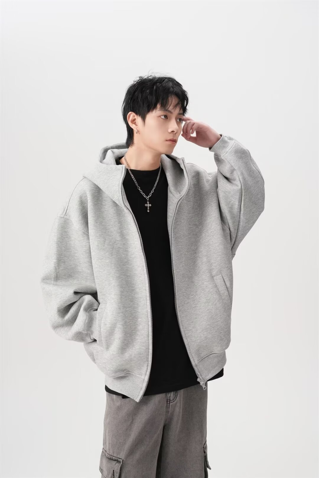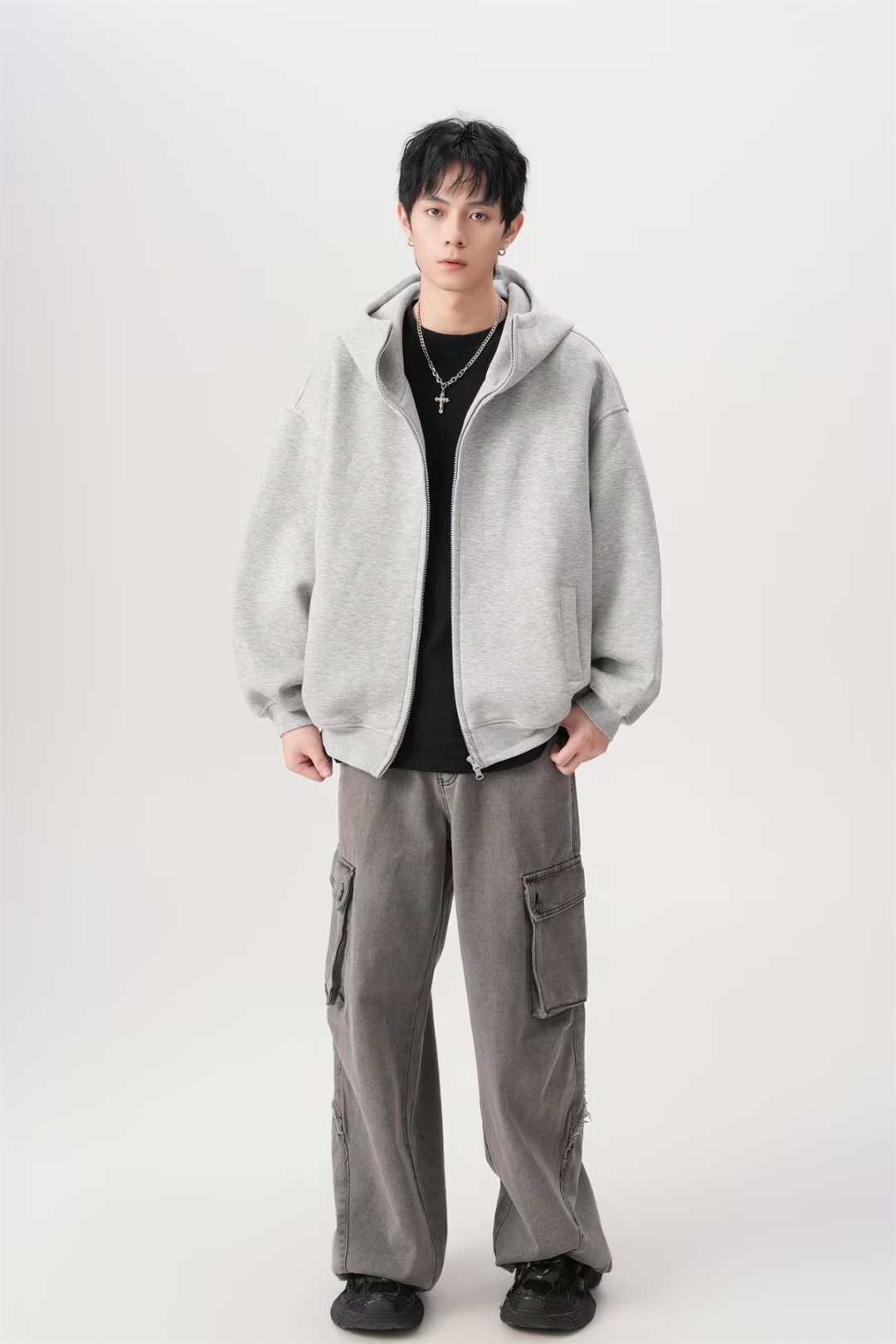 아메리칸 스타일 레트로 프로필 에어 레이어 그레이 후드 기모 스웨터 재킷 남성과 여성을위한 가을과 겨울 느슨한 무거운 카디건 트렌디스토어 가기