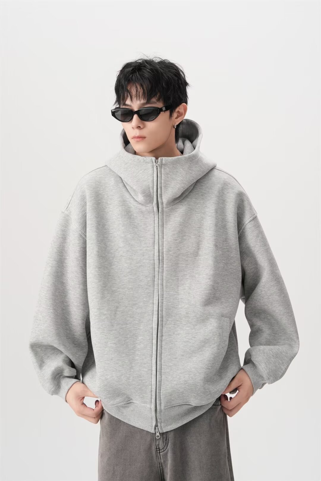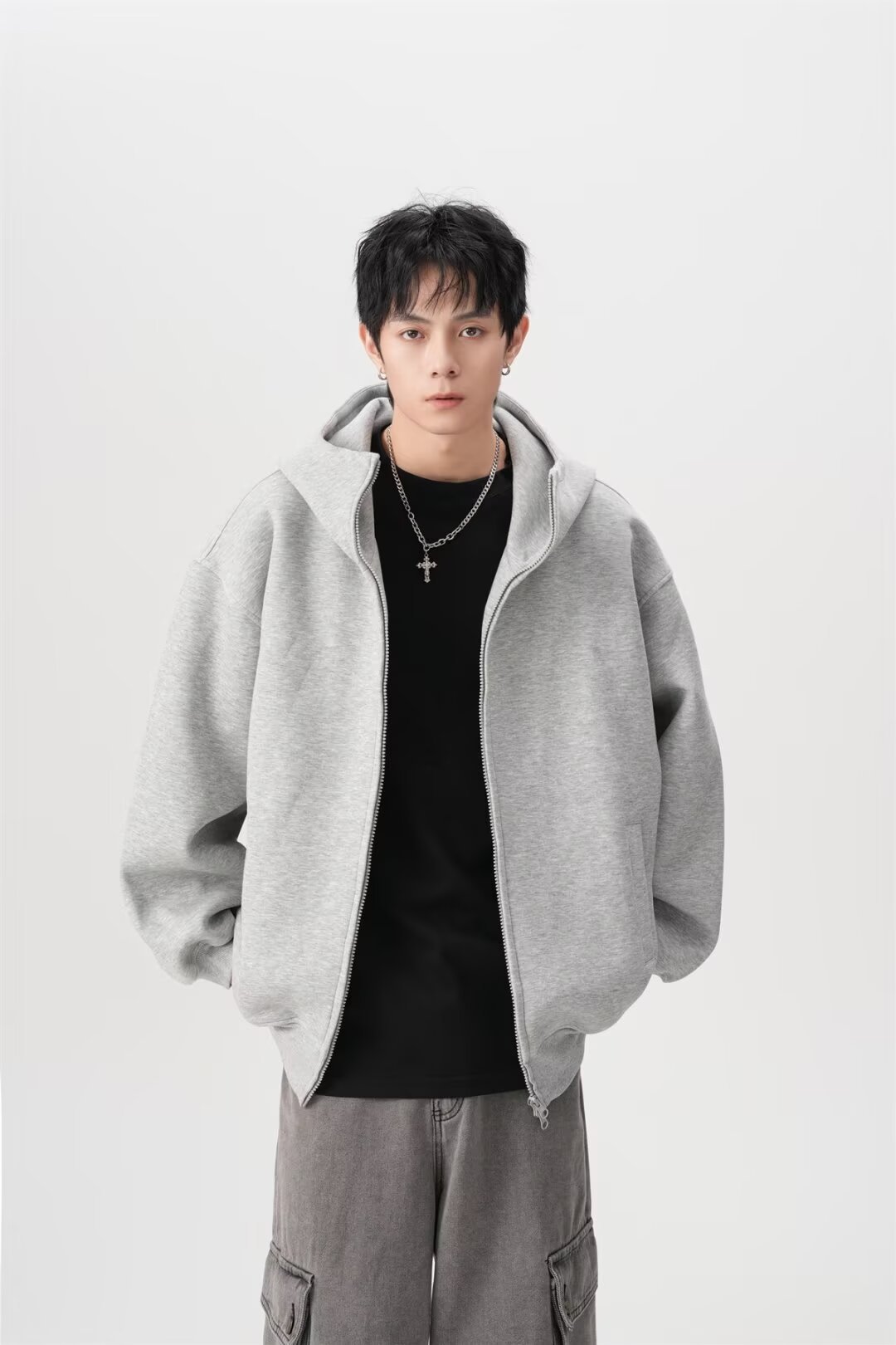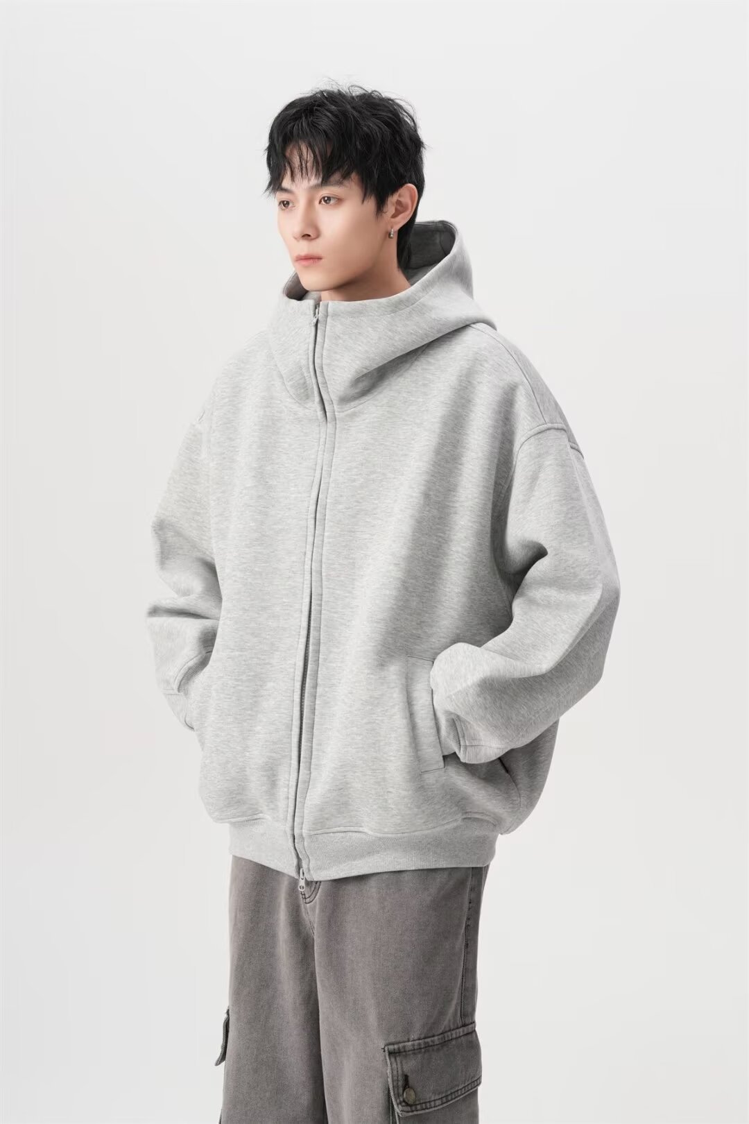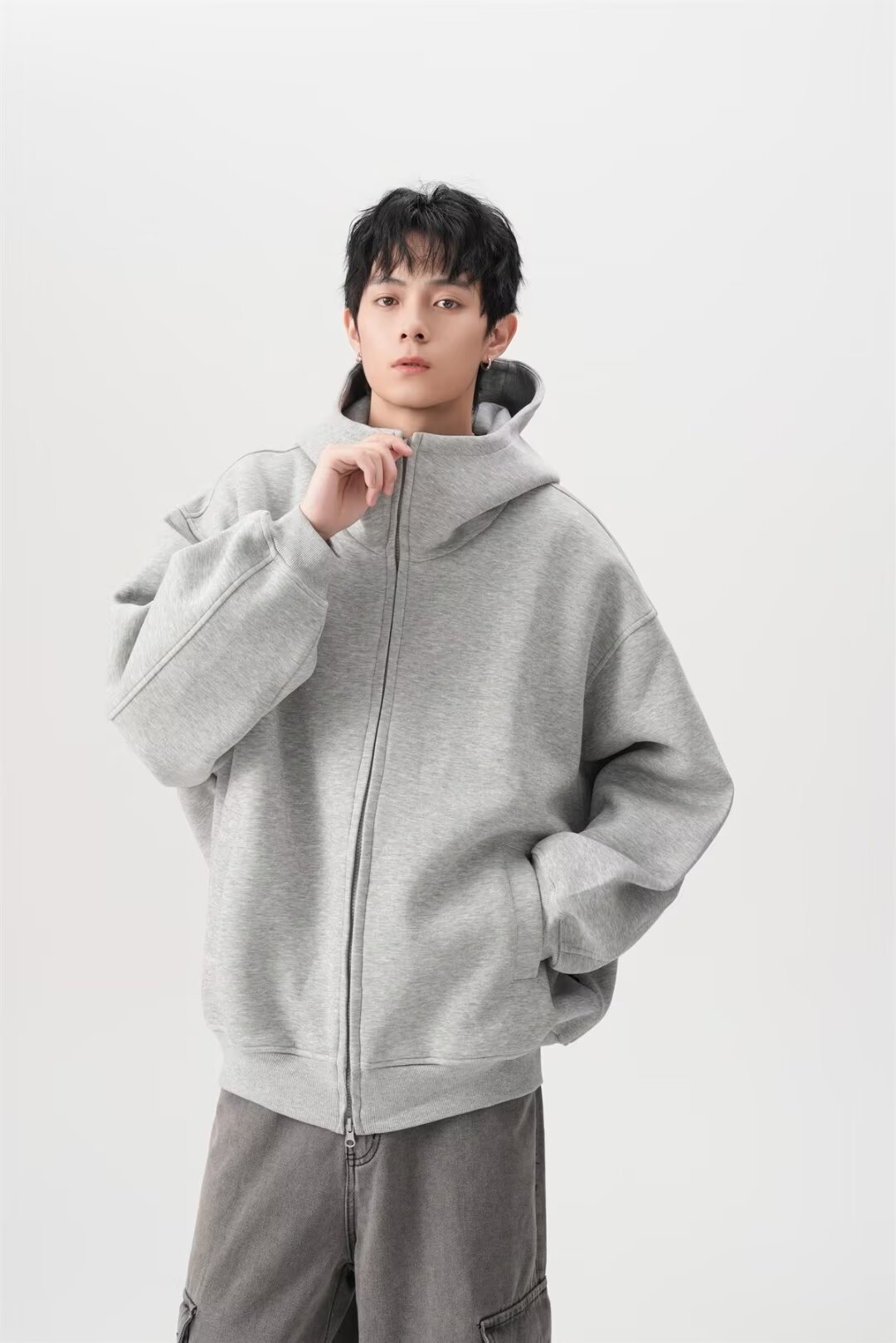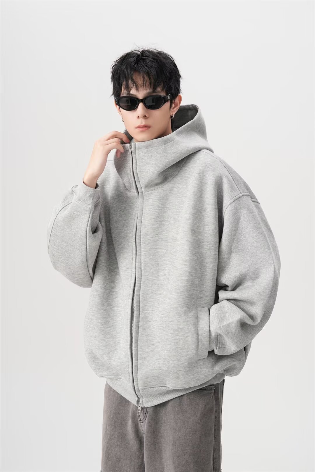 아메리칸 스타일 레트로 프로필 에어 레이어 그레이 후드 기모 스웨터 재킷 남성과 여성을위한 가을과 겨울 느슨한 무거운 카디건 트렌디스토어 가기