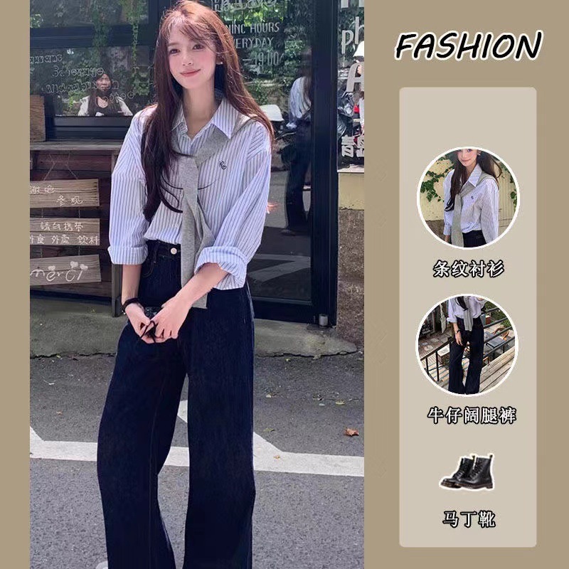 세트 여자 2025 년 초봄 한국 시대 감소 긴팔 줄무늬 셔츠 탑 목도리 높은 허리 와이드 레그 바지 3 피스 세트스토어 가기