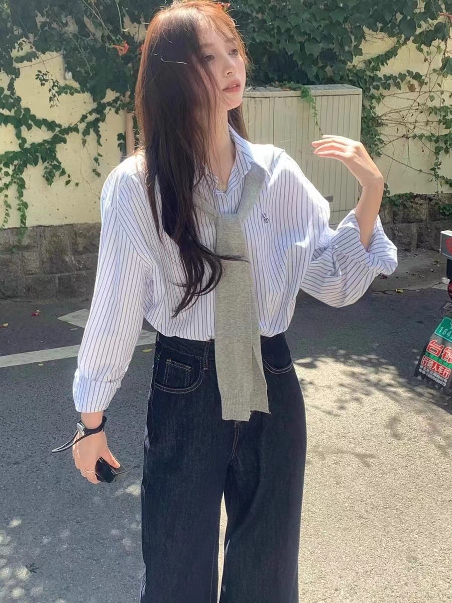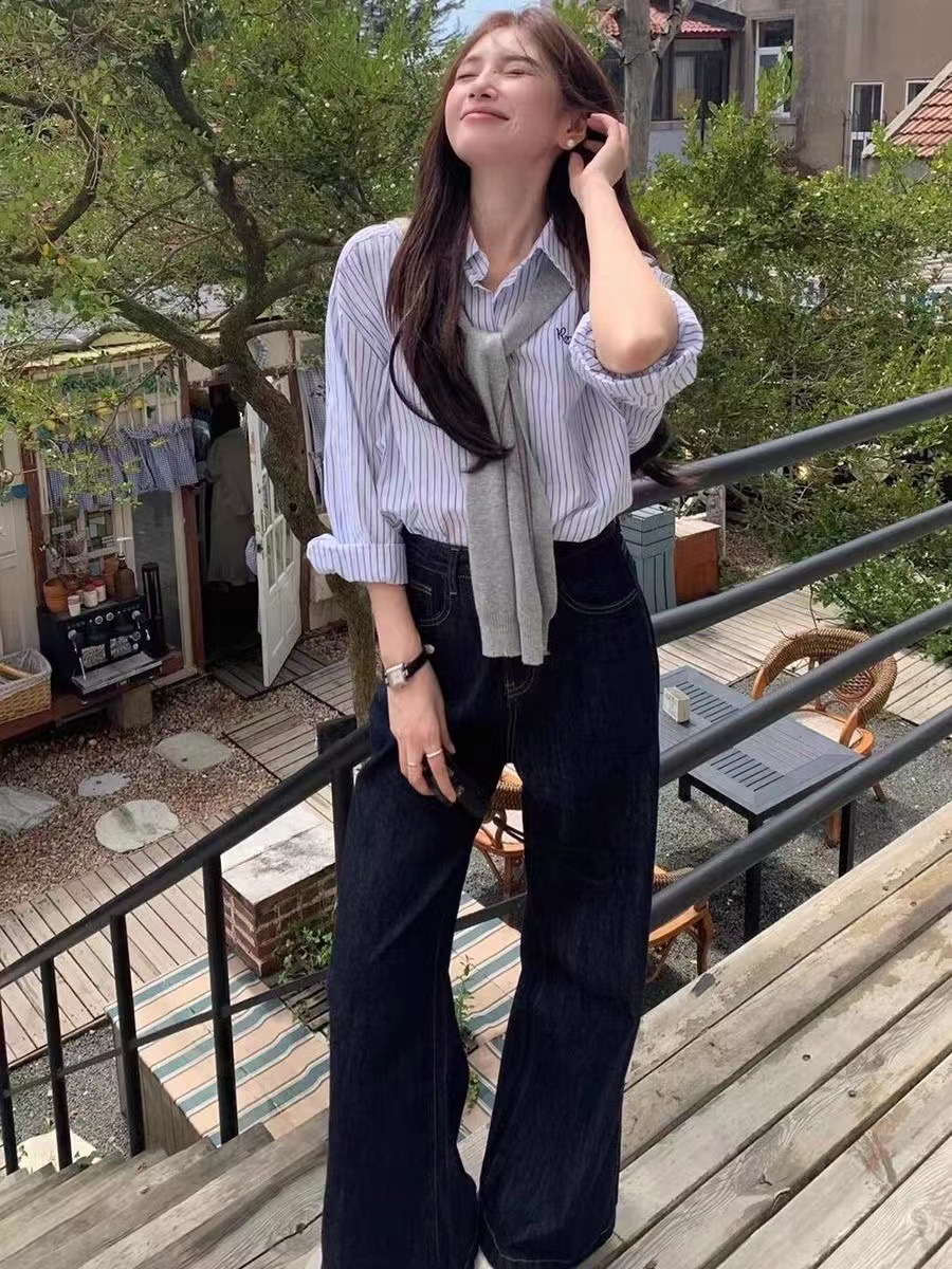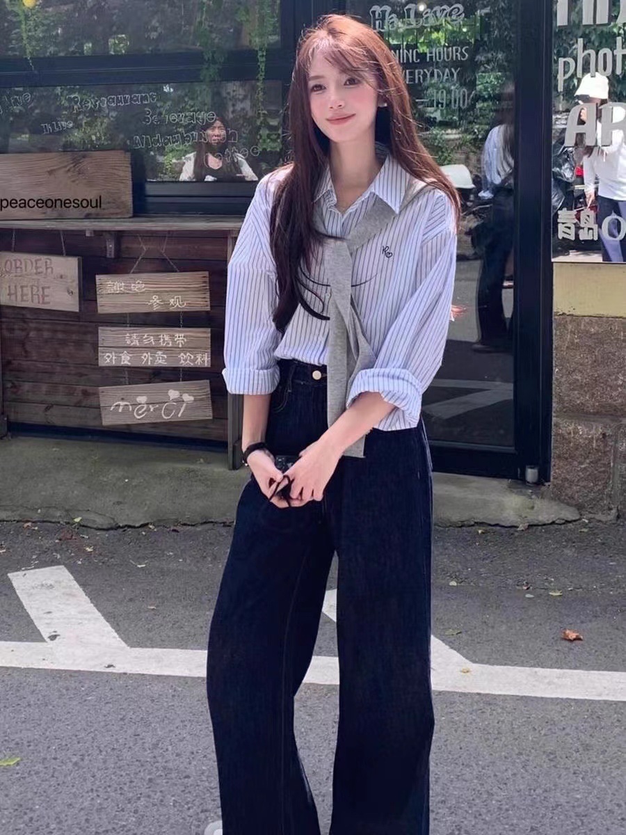 세트 여자 2025 년 초봄 한국 시대 감소 긴팔 줄무늬 셔츠 탑 목도리 높은 허리 와이드 레그 바지 3 피스 세트