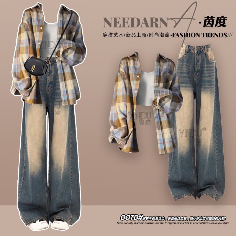 가을 세트 여자 2025 새로운 한국식 느슨한 격자 무늬 셔츠 카미솔 높은 허리 청바지 3 종 세트스토어 가기