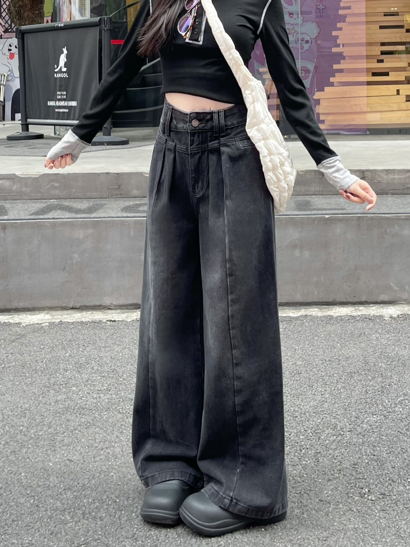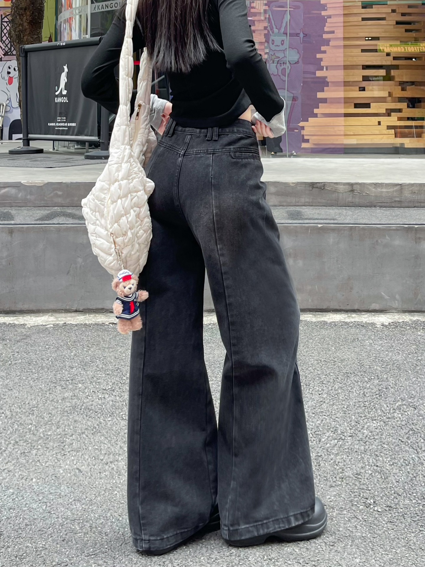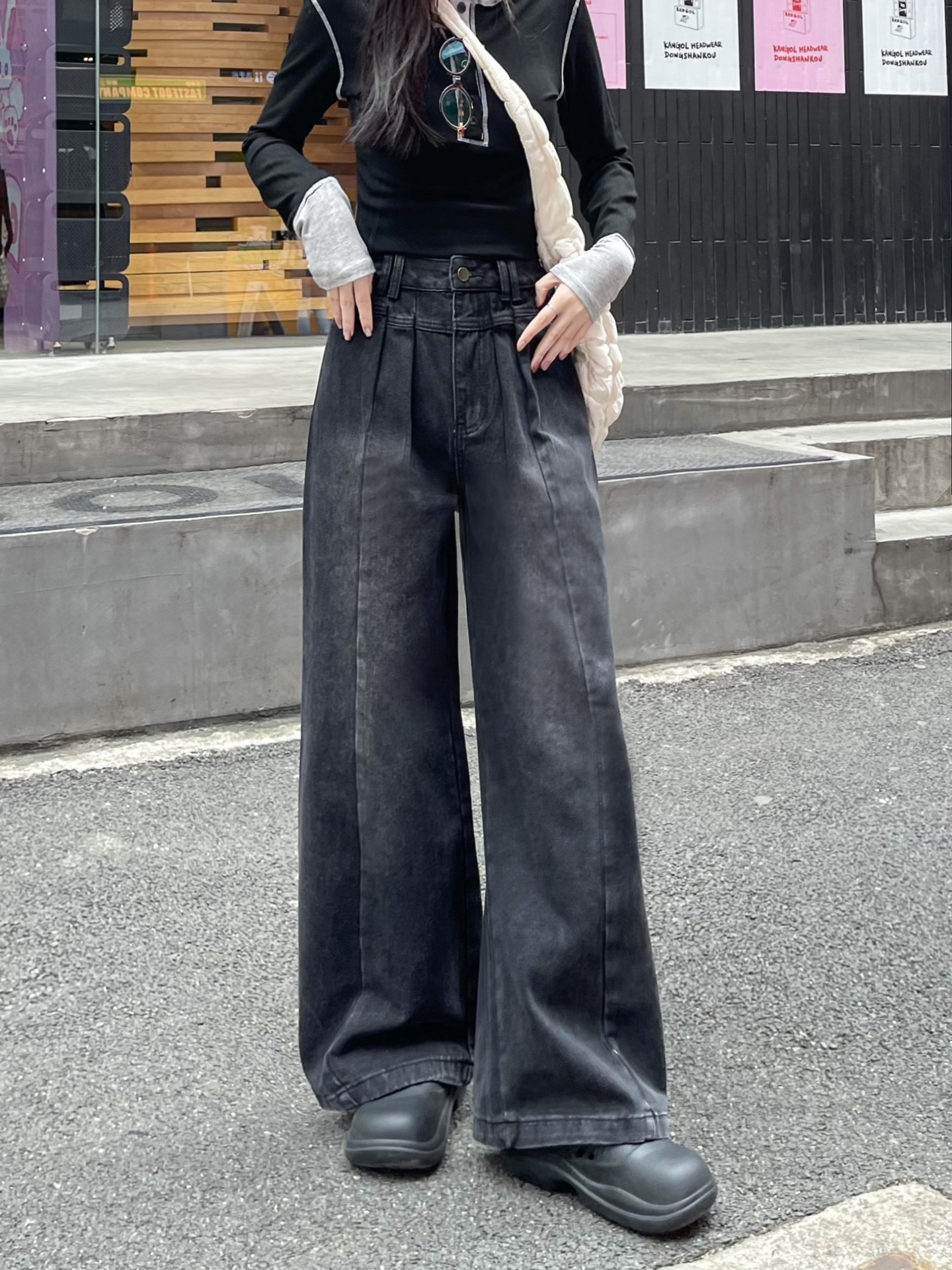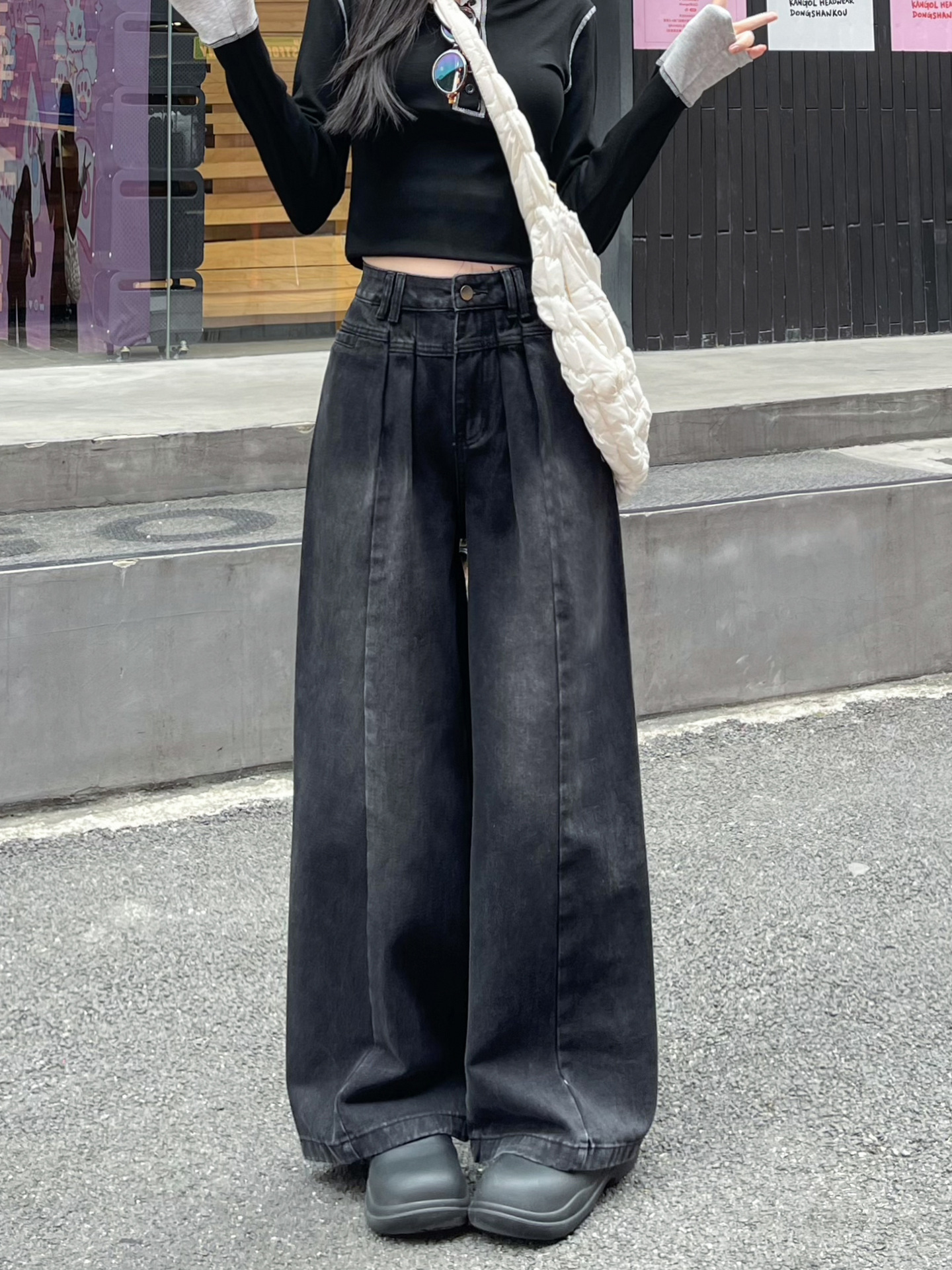 블랙 그레이 딥 와이드 레그 청바지 여성의 이른 봄 새로운 레트로 하이 웨이스트 루즈 스트레이트 트렌디 2025 트렌디 팬츠스토어 가기