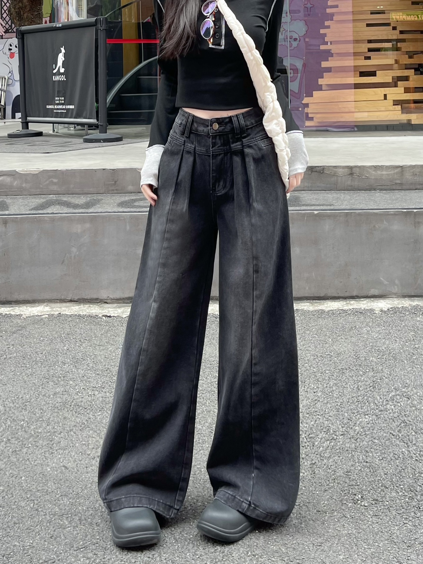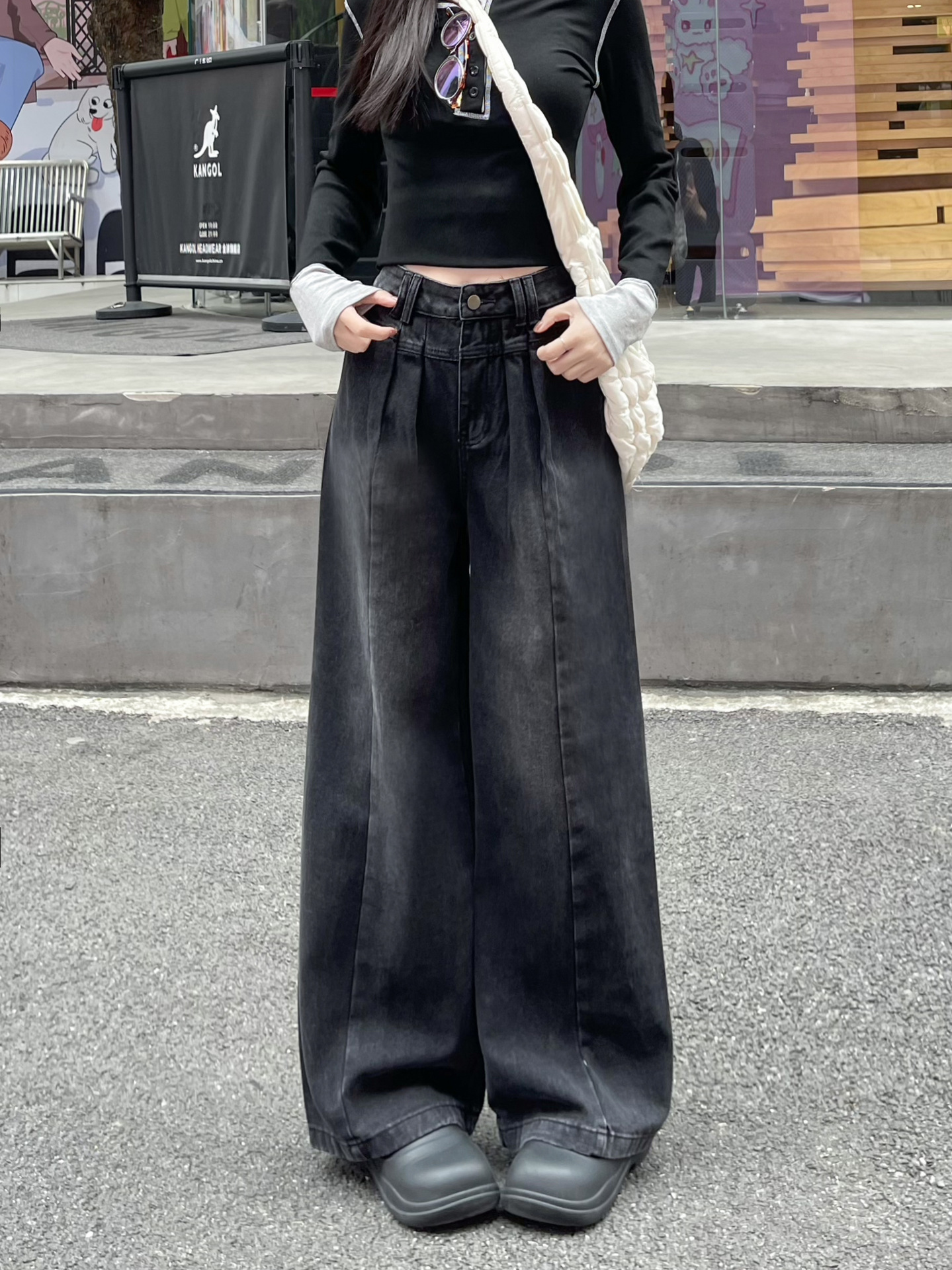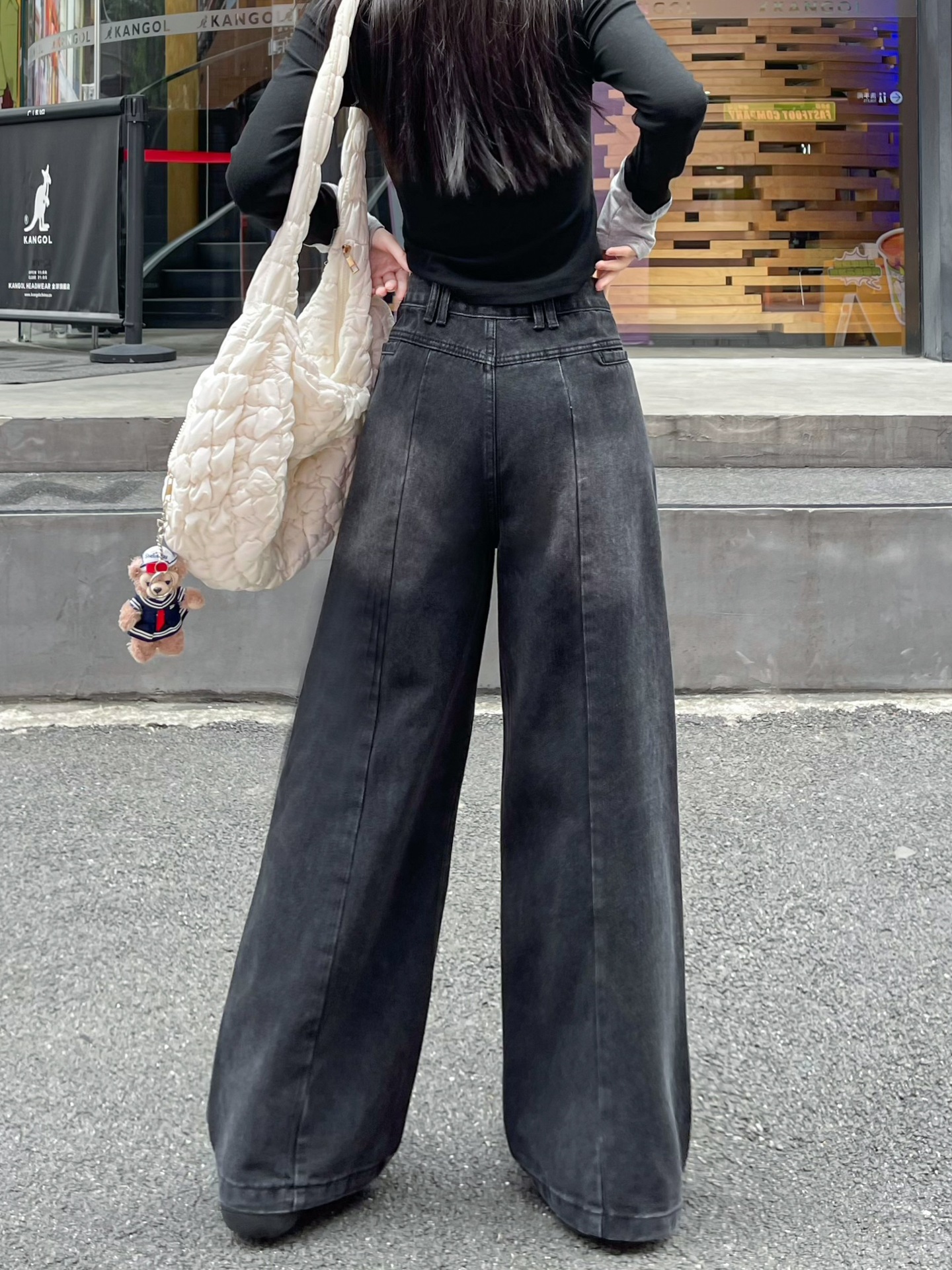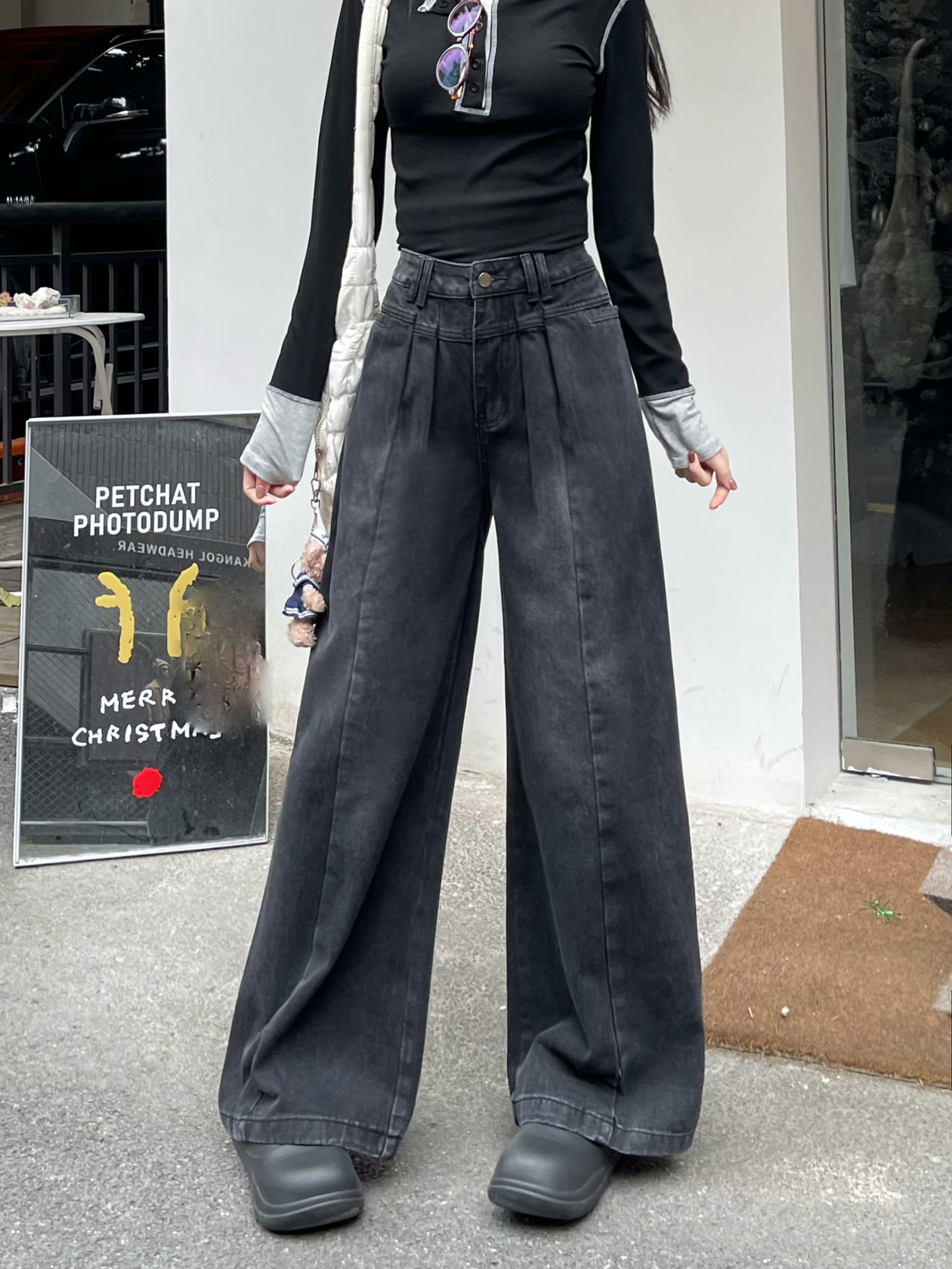 블랙 그레이 딥 와이드 레그 청바지 여성의 이른 봄 새로운 레트로 하이 웨이스트 루즈 스트레이트 트렌디 2025 트렌디 팬츠스토어 가기
