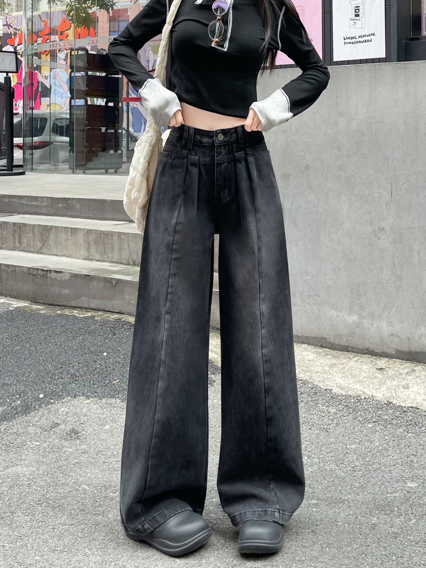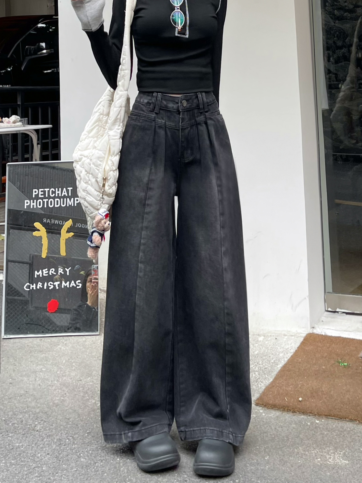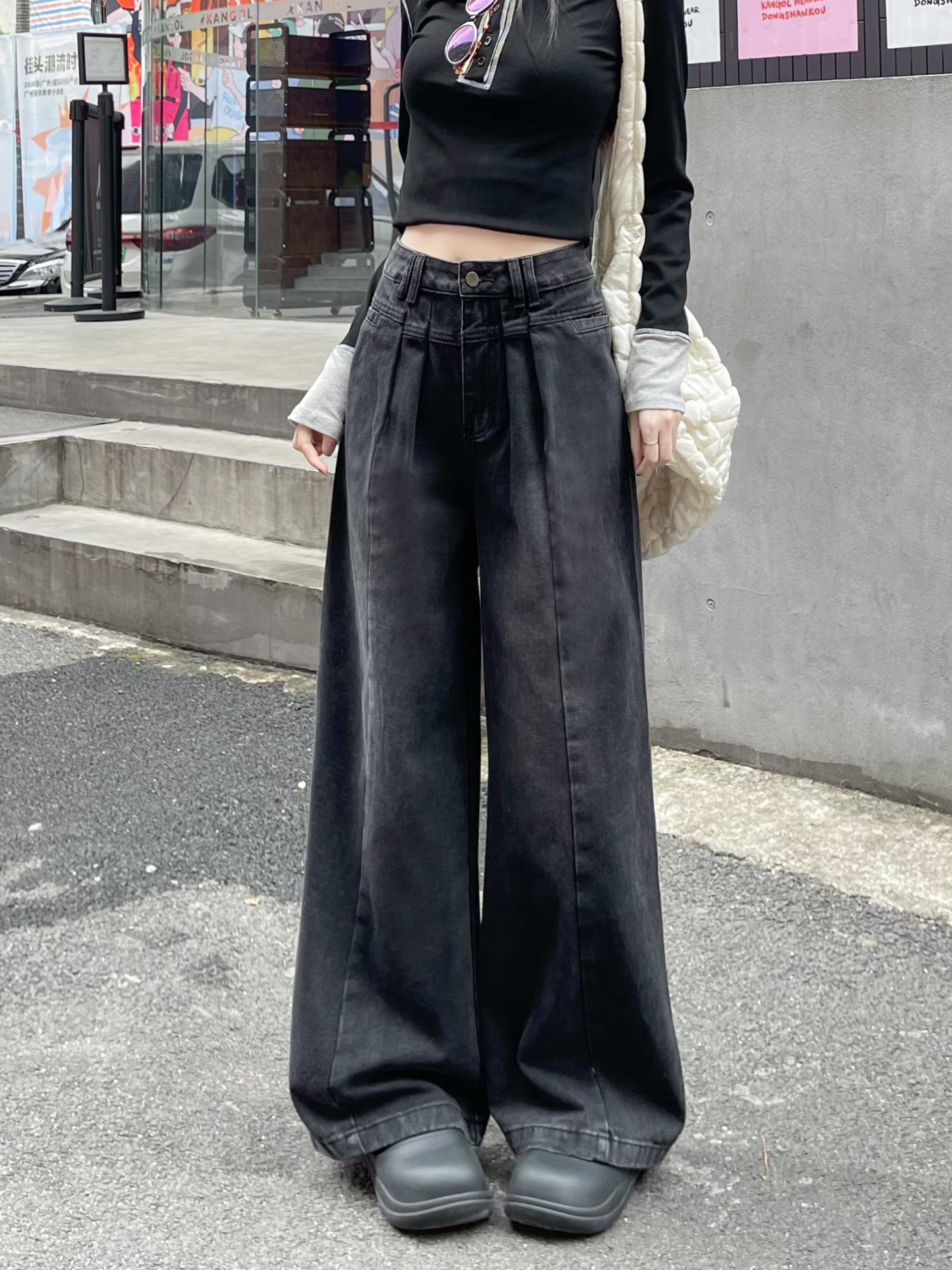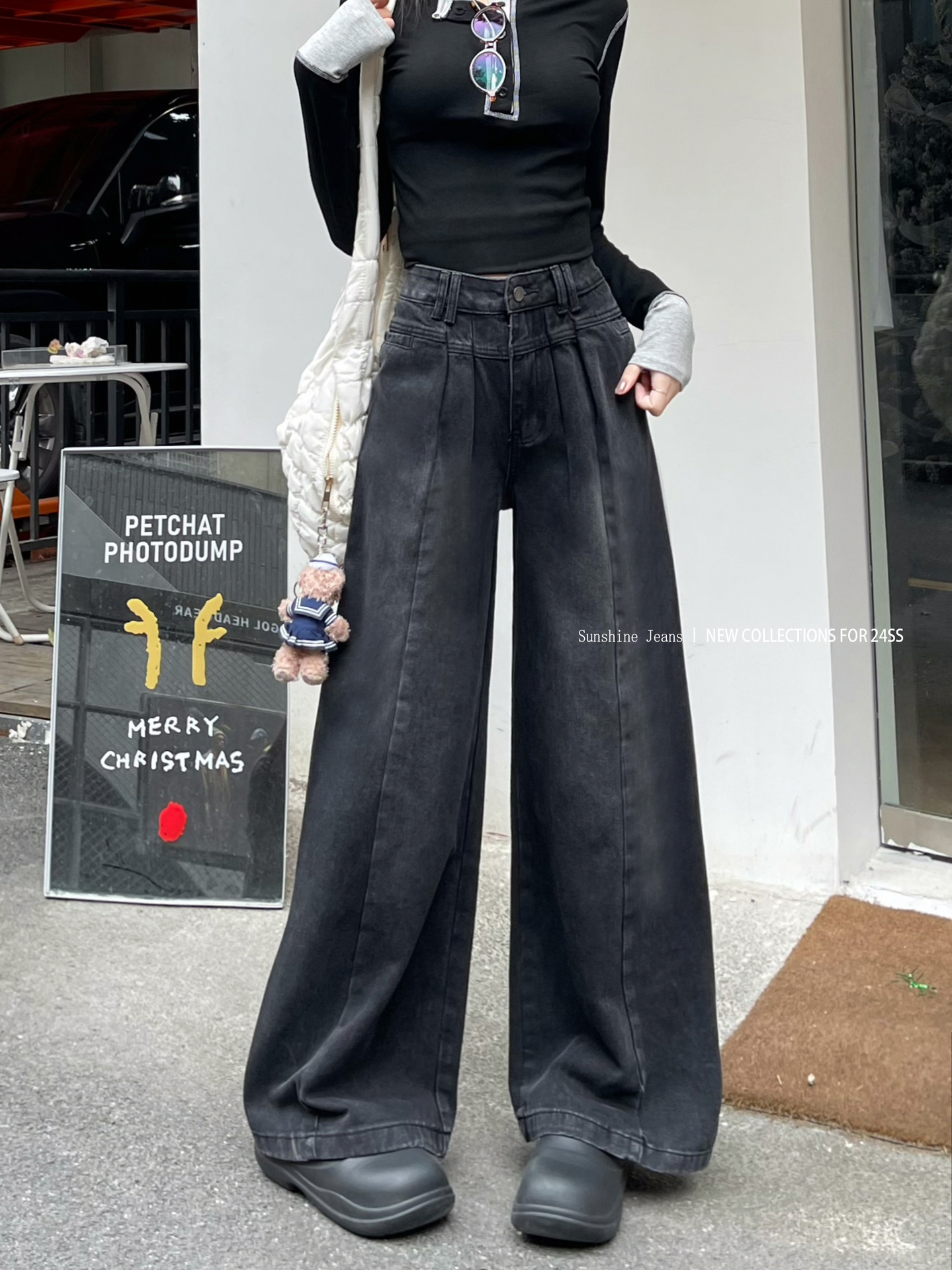 블랙 그레이 딥 와이드 레그 청바지 여성의 이른 봄 새로운 레트로 하이 웨이스트 루즈 스트레이트 트렌디 2025 트렌디 팬츠스토어 가기