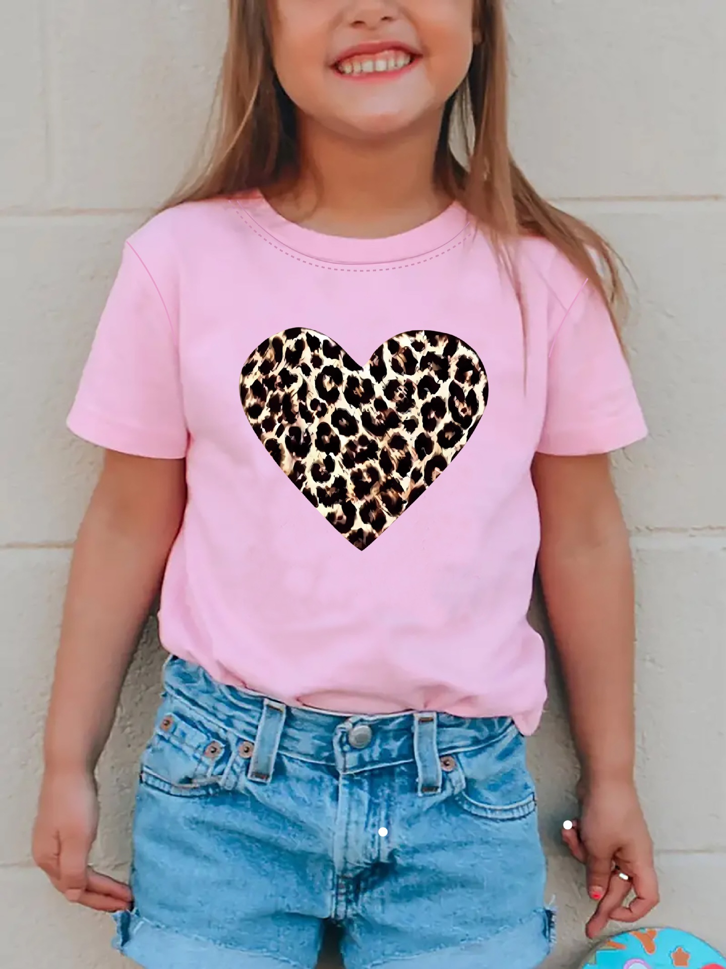 국경 간 대외 무역 INS 소녀 표범 사랑 패턴 소녀 둥근 목 티셔츠 1-8 세에 적합한 어린이 캐주얼 여름스토어 가기