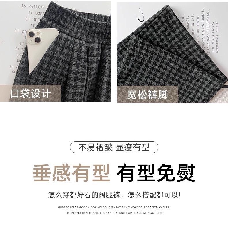 블랙 그레이 플리스 체크 팬츠 여성용 가을 겨울 2024 신상 스트레이트 하이웨이스트 소형 체형용 와이드 팬츠 캐주얼 다용도