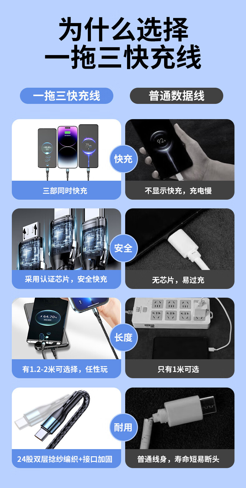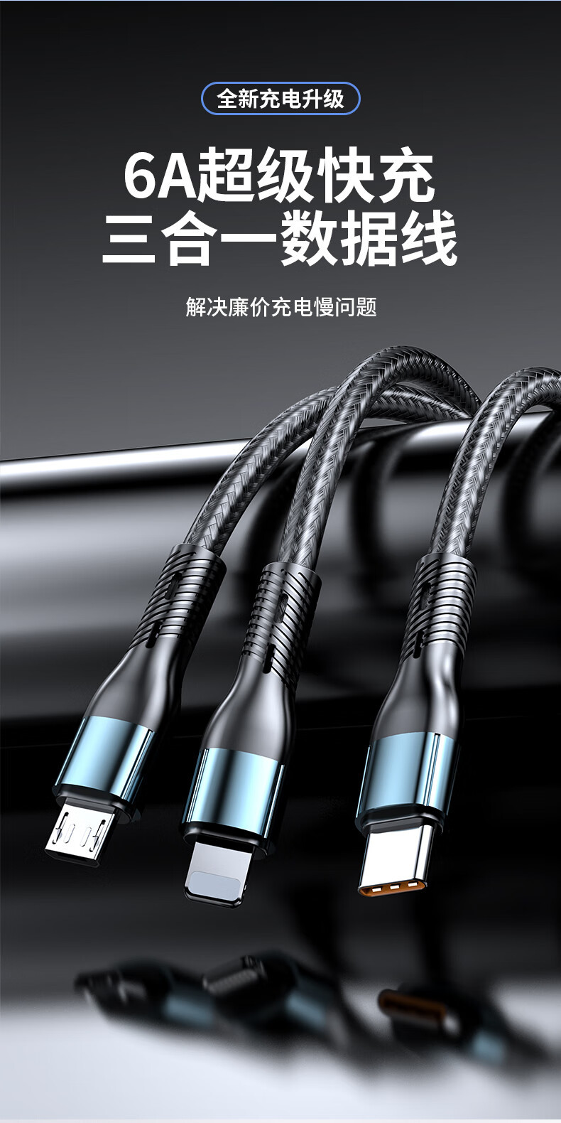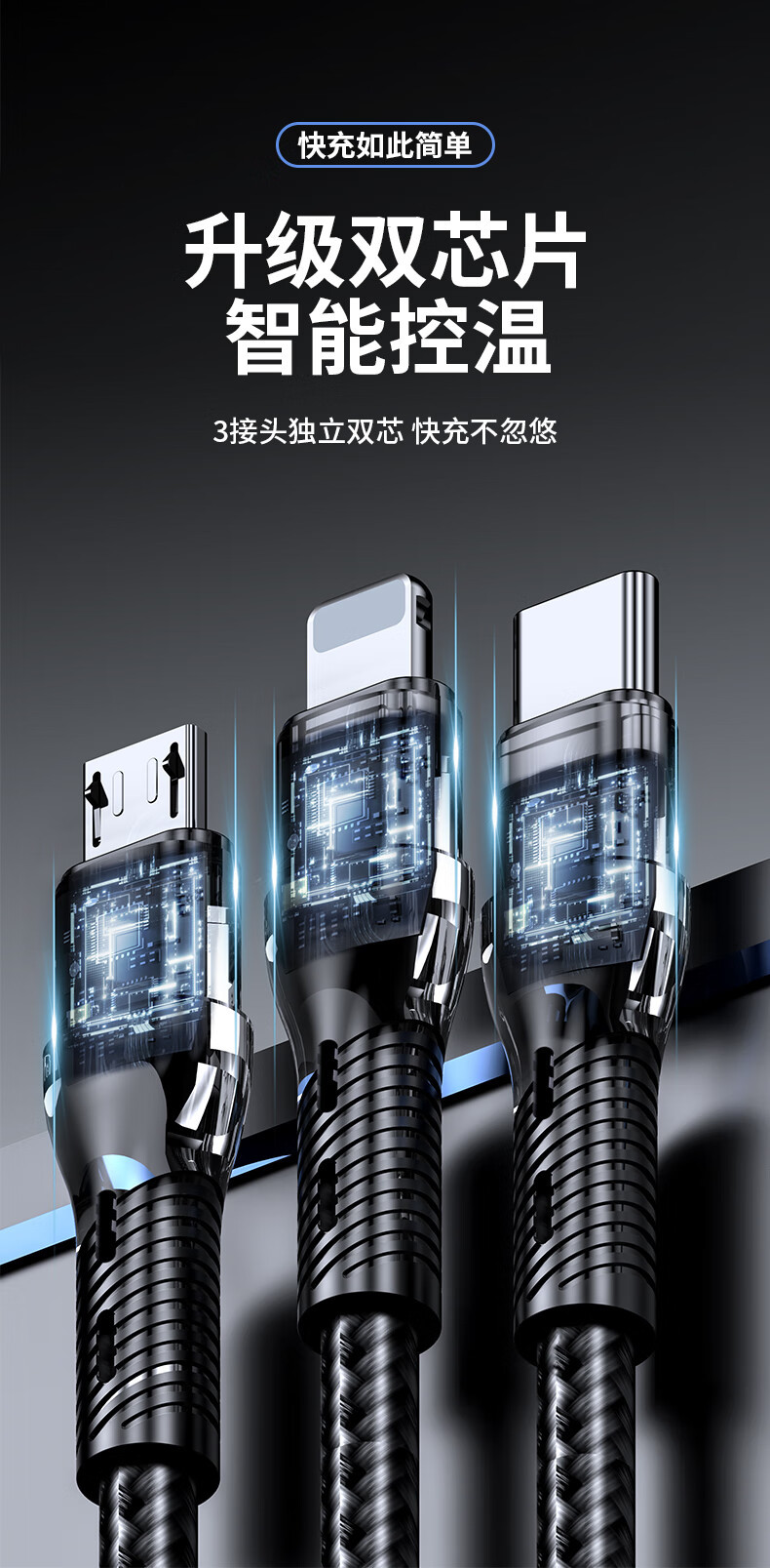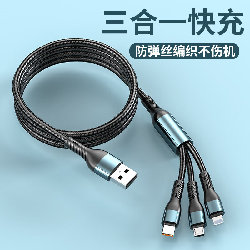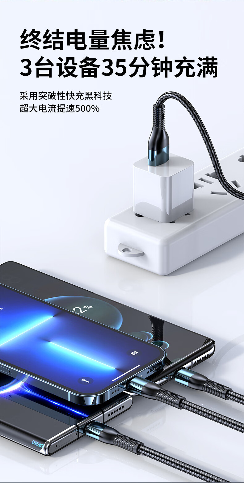 100W 초고속 충전 멀티 포트 충전기 3-in-1 데이터 케이블 1-3 멀티 헤드 기능성 편조 케이블스토어 가기