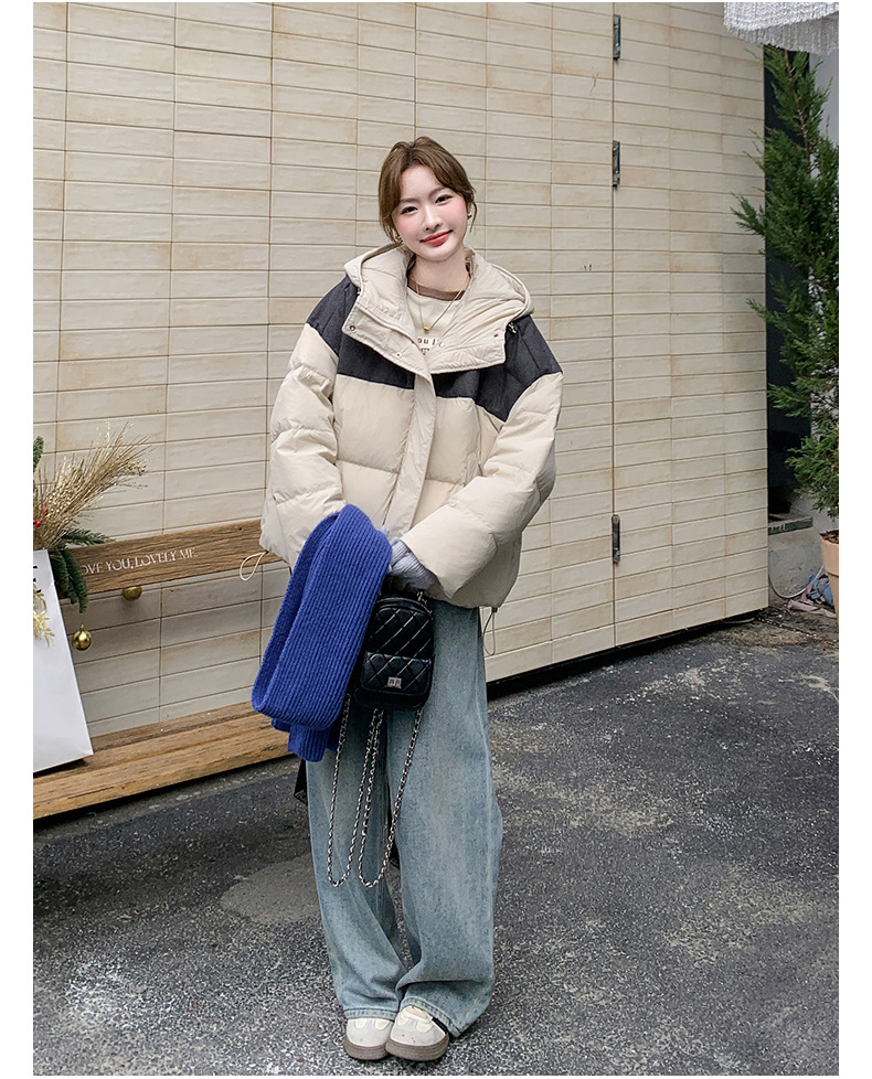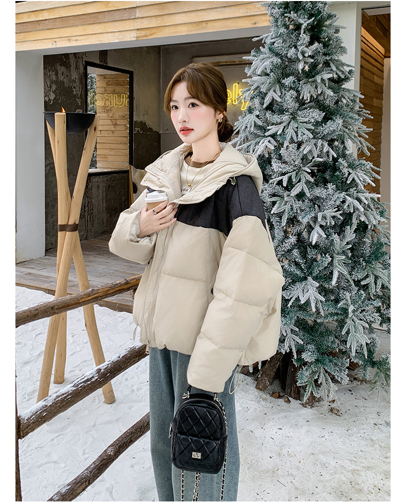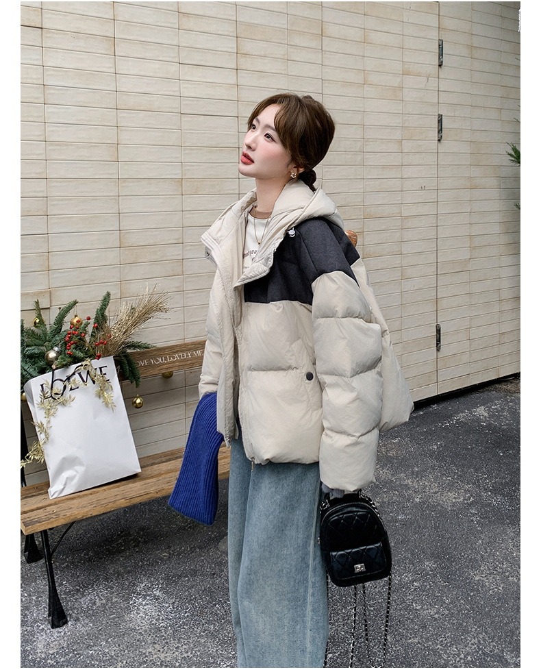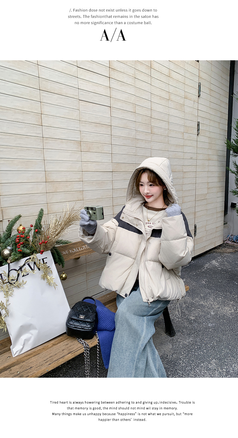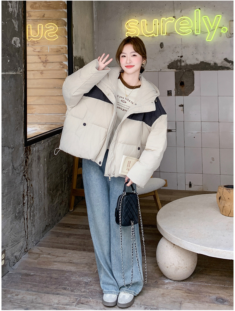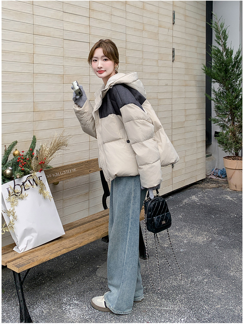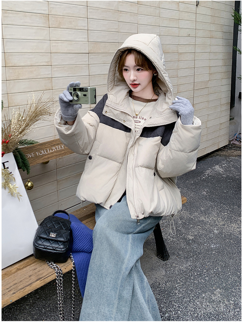 베이지 스티칭 짧은 후드 다운 재킷 한국 스타일 디자인 센스 기질 90 화이트 덕 다운 재킷 6112P295K428스토어 가기