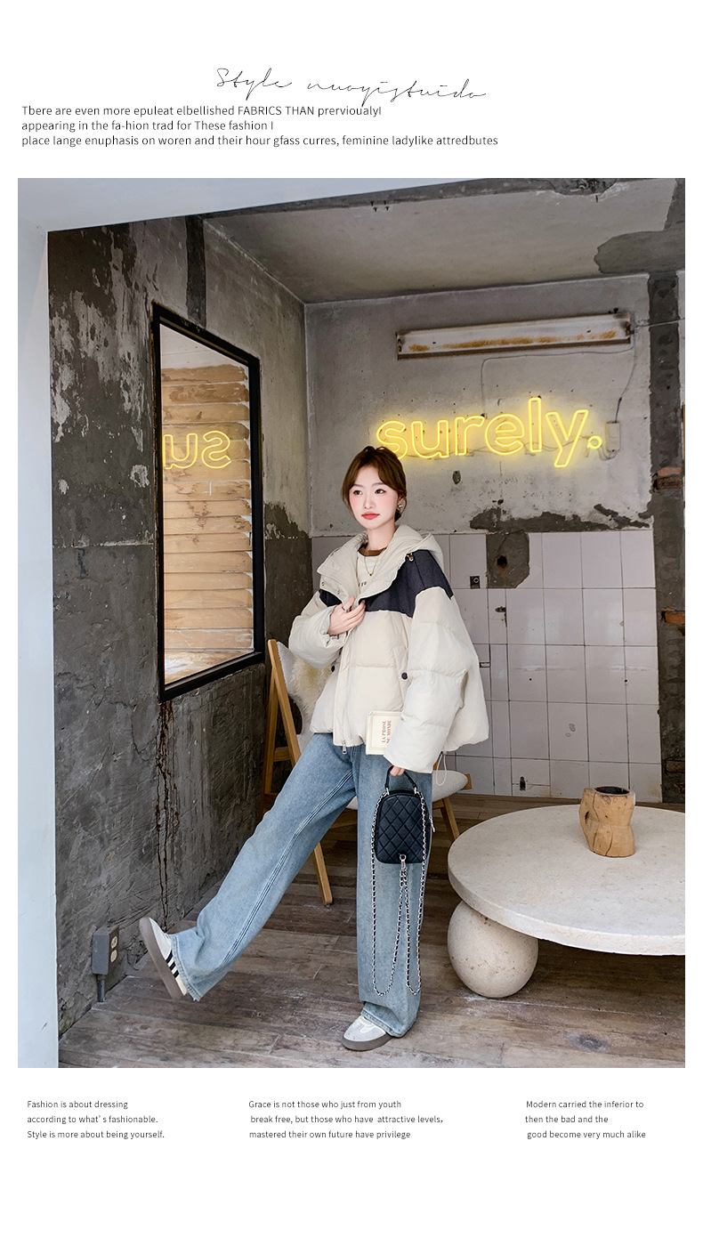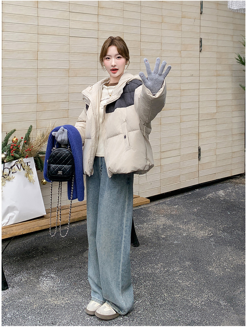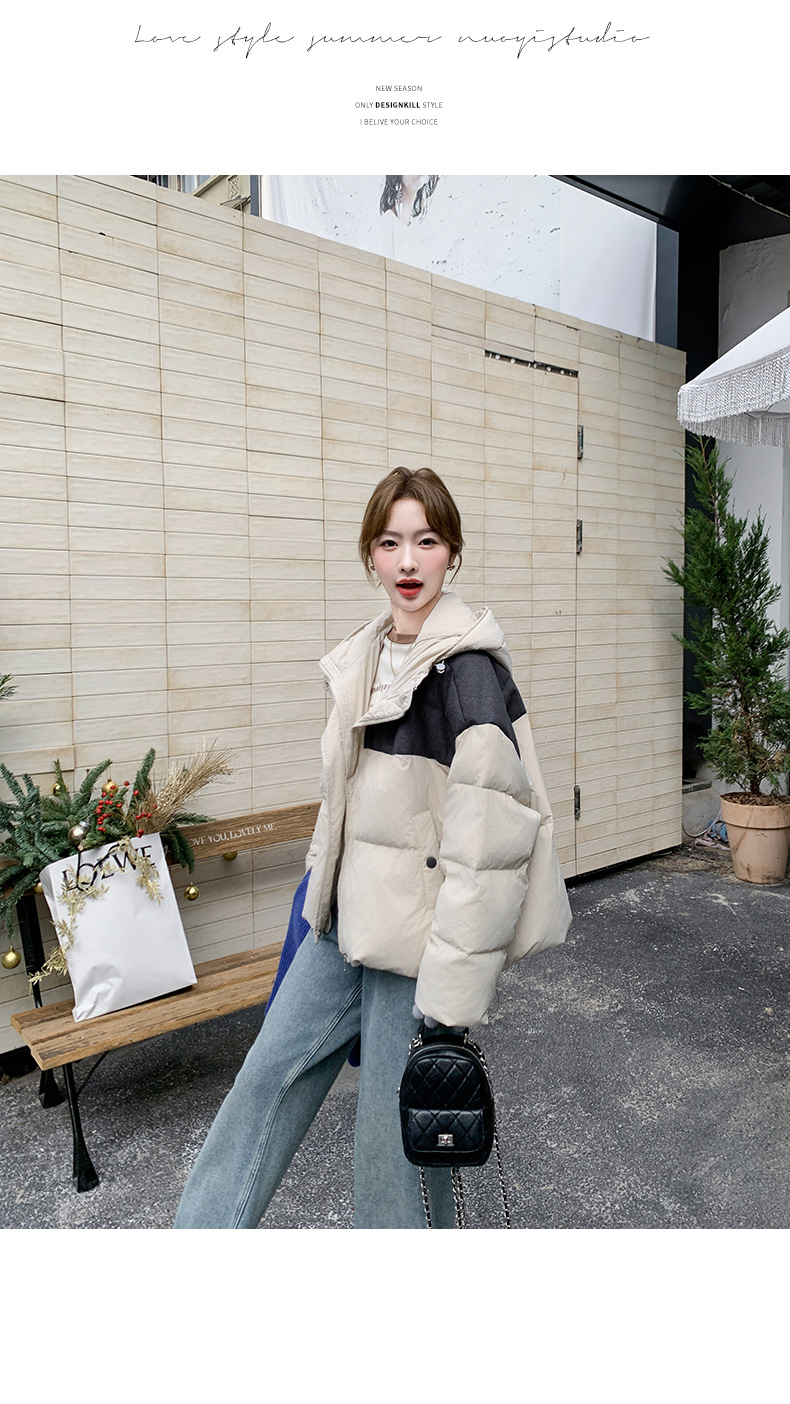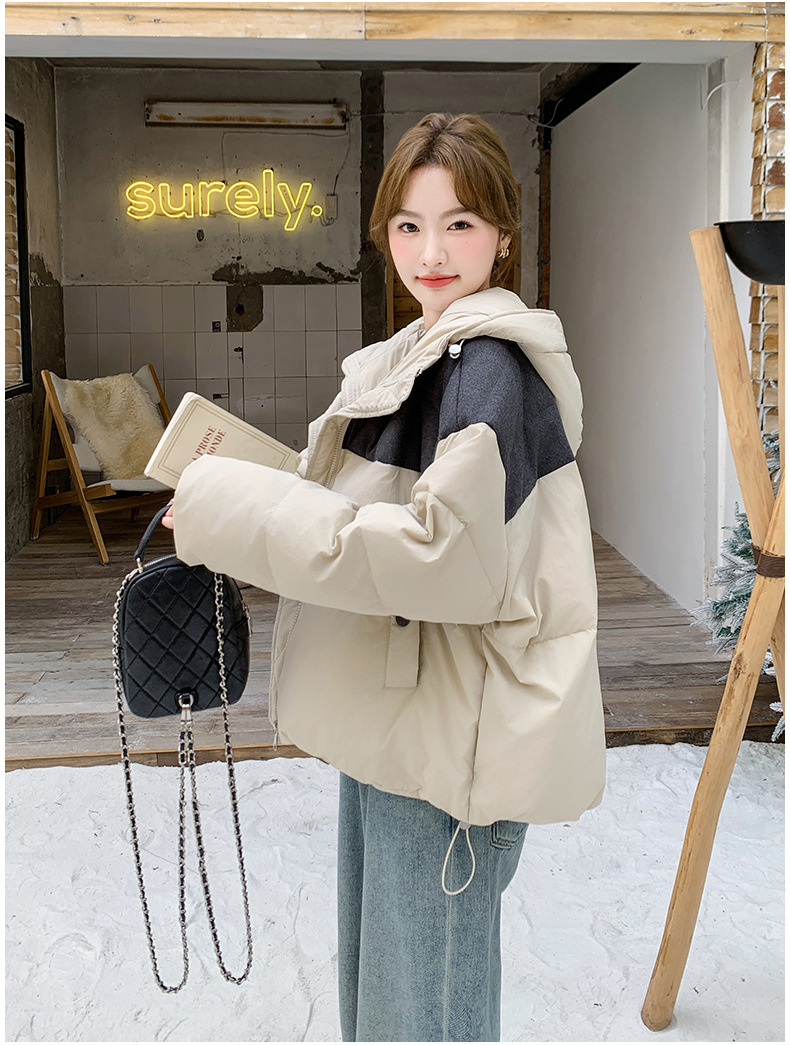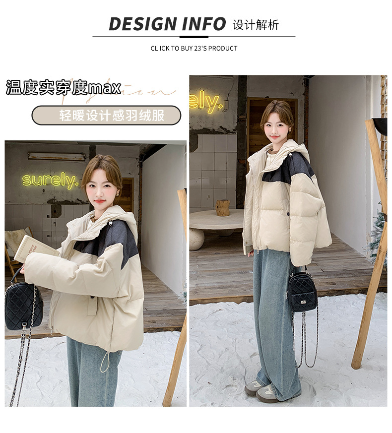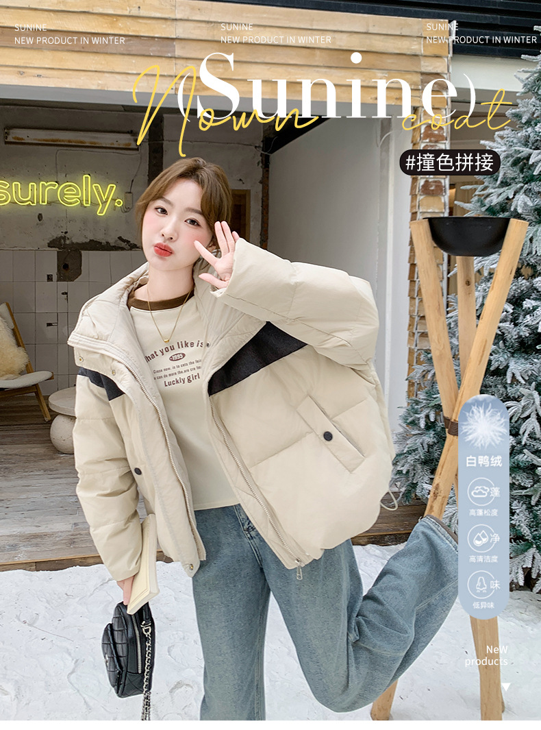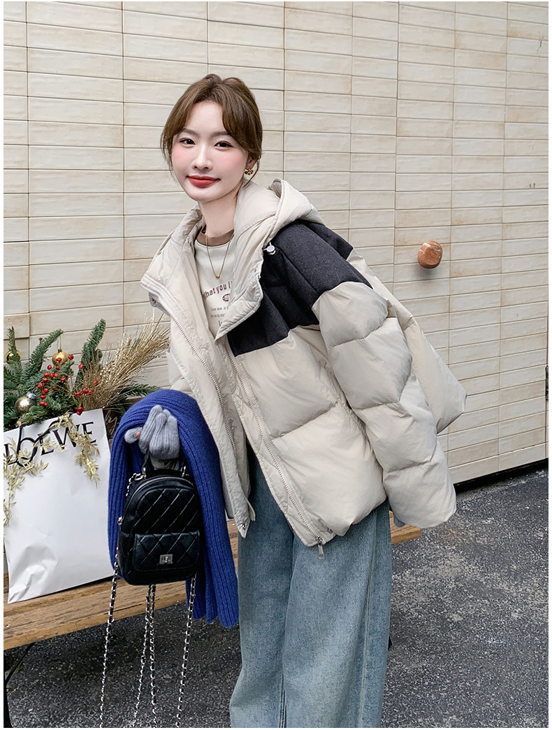베이지 스티칭 짧은 후드 다운 재킷 한국 스타일 디자인 센스 기질 90 화이트 덕 다운 재킷 6112P295K428스토어 가기