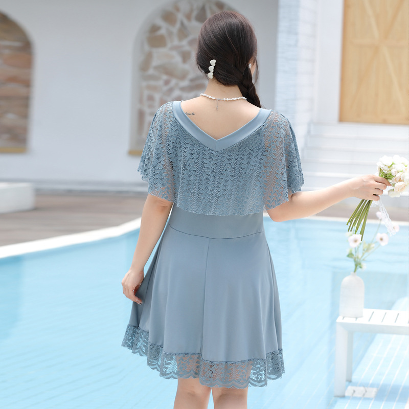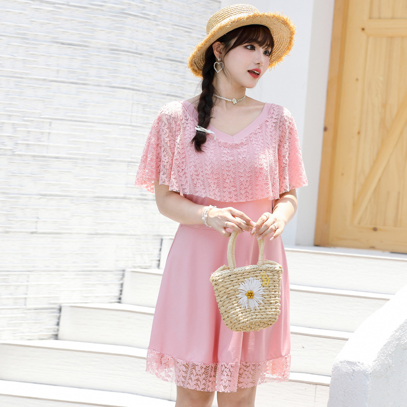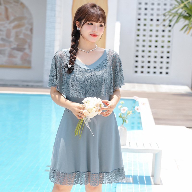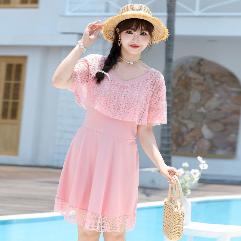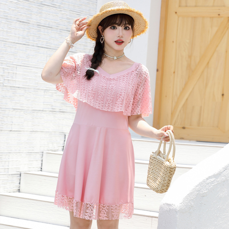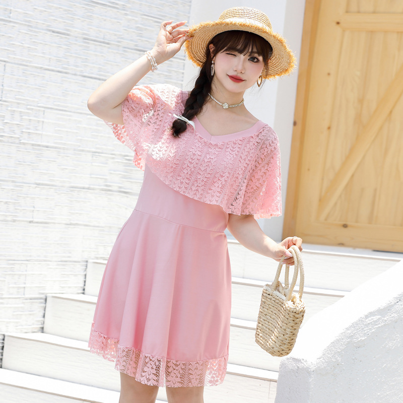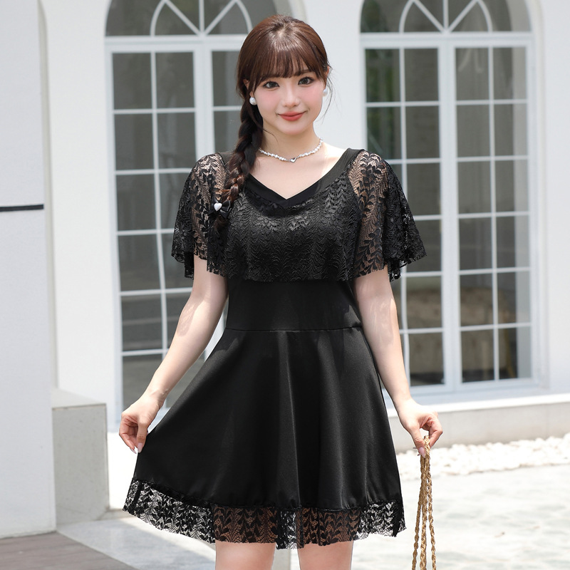 한국 스타일 플러스 뚱뚱한 여성 스플릿 레이스 스커트 2024 새로운 슬림 핏 슬리밍 배꼽 커버 보수 플러스 사이즈 반팔 수영복스토어 가기