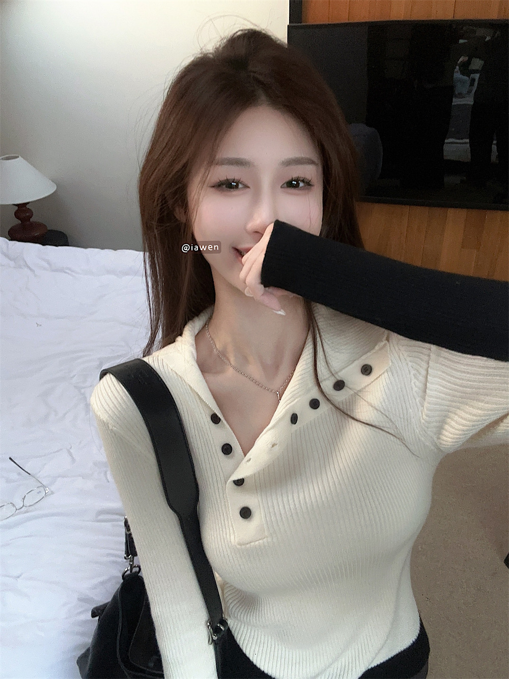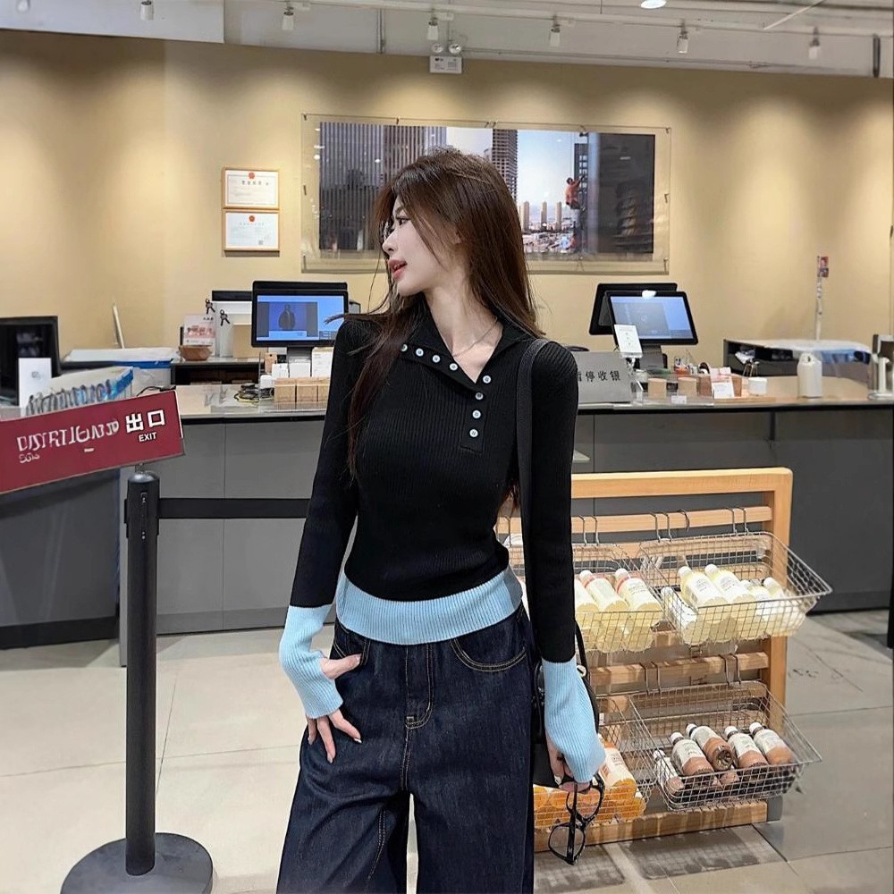 스티칭 콘트라스트 컬러 디자인 옷깃베이스 스웨터 여성의 가을과 겨울 한국 스타일 슬림핏 슬리밍 우아한 내부 스웨터스토어 가기