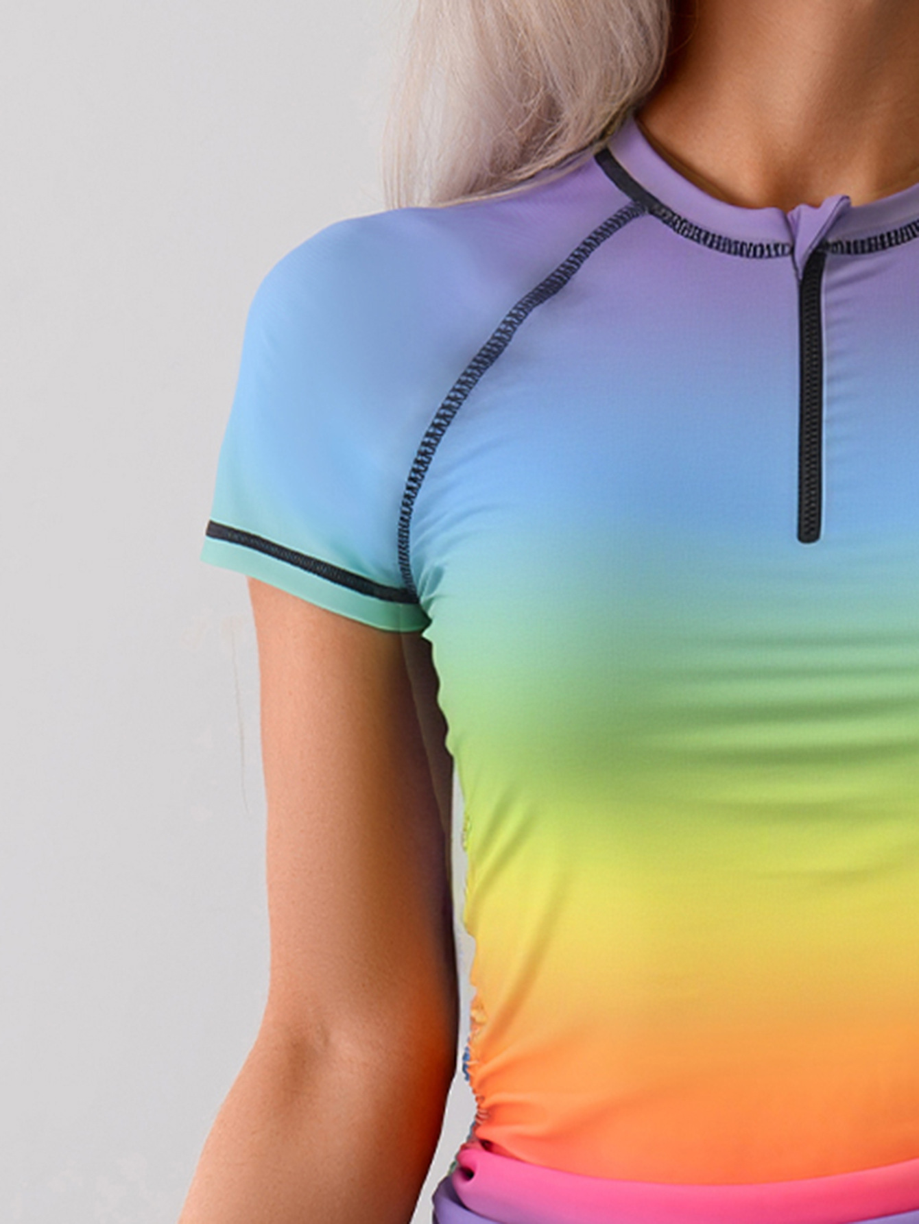 유럽과 미국의 국경 간 새로운 여성 패션 그라디언트 인쇄 지퍼 벨리 반팔 박스 탄 키니 투피스 세트스토어 가기