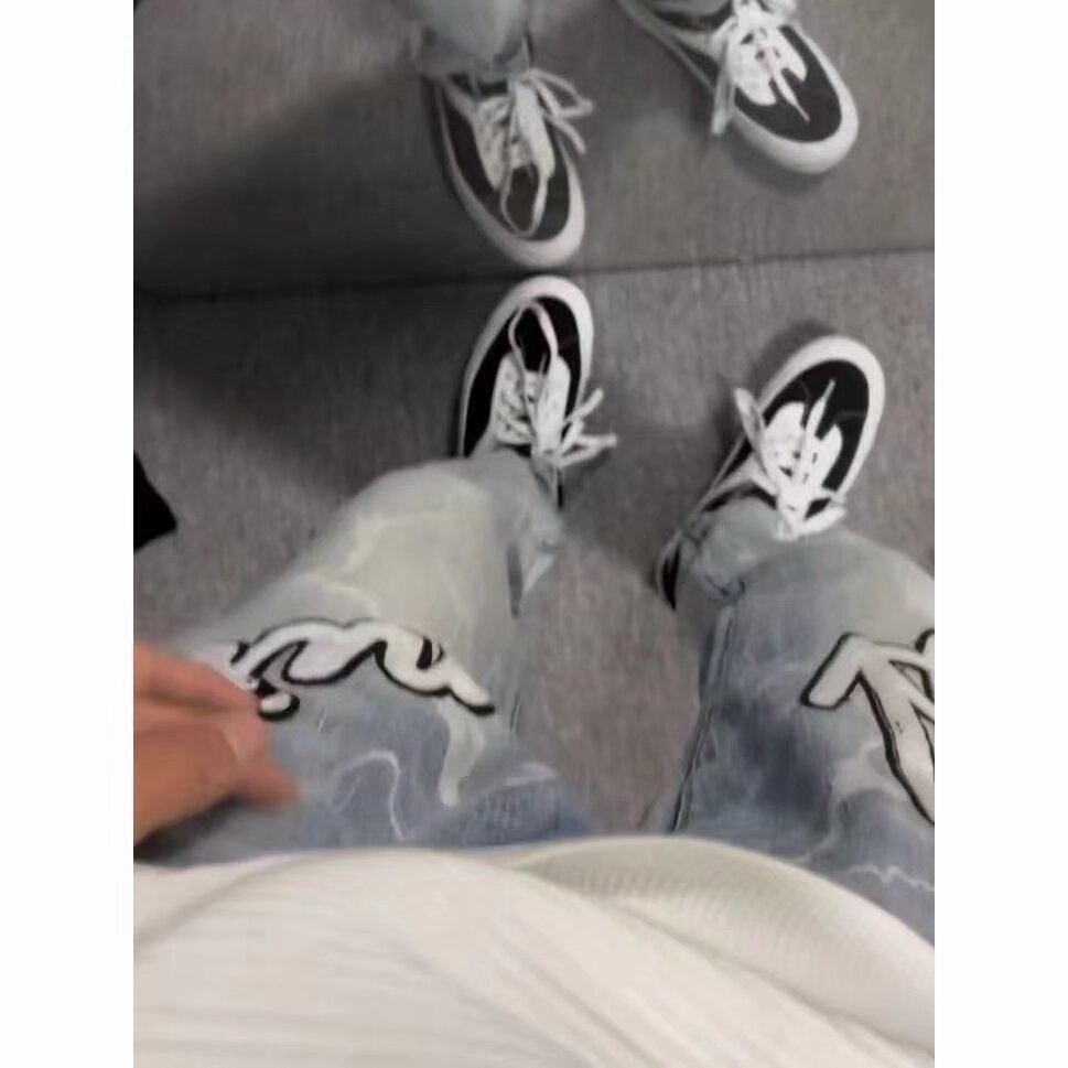 아메리칸 스타일 하이 스트리트 인터넷 인기있는 동일 스타일 하이 퀄리티 AM 편지 자수 청바지 남성 올 매치 슬림 스트레이트 바지스토어 가기