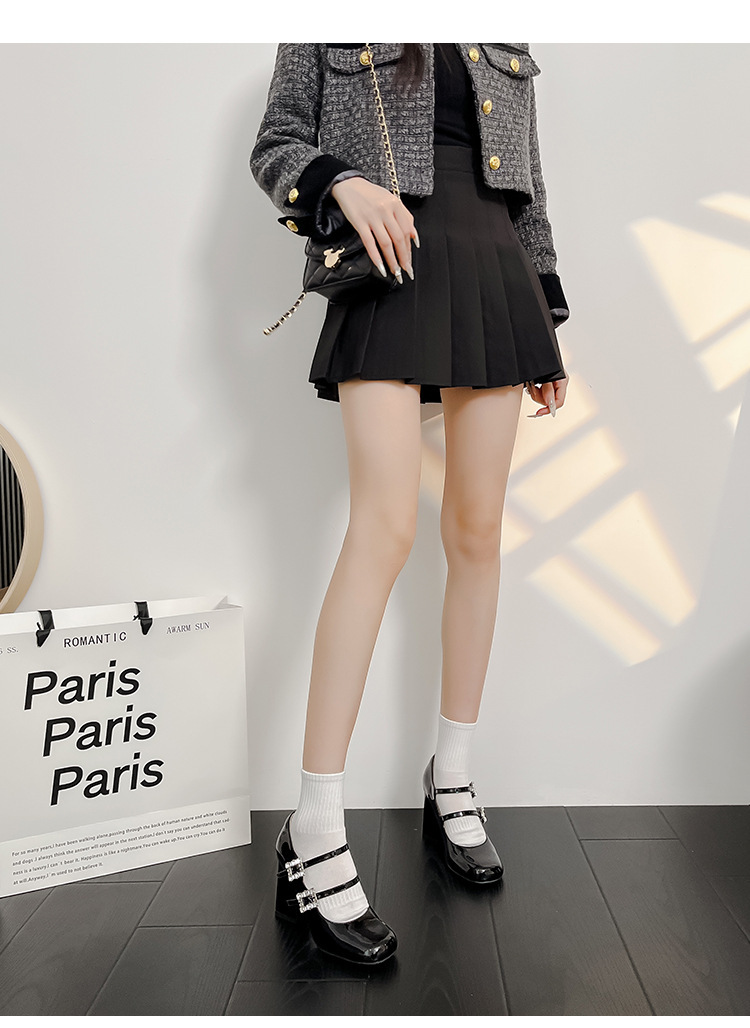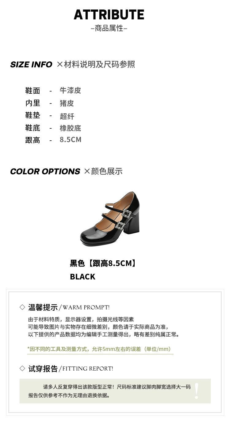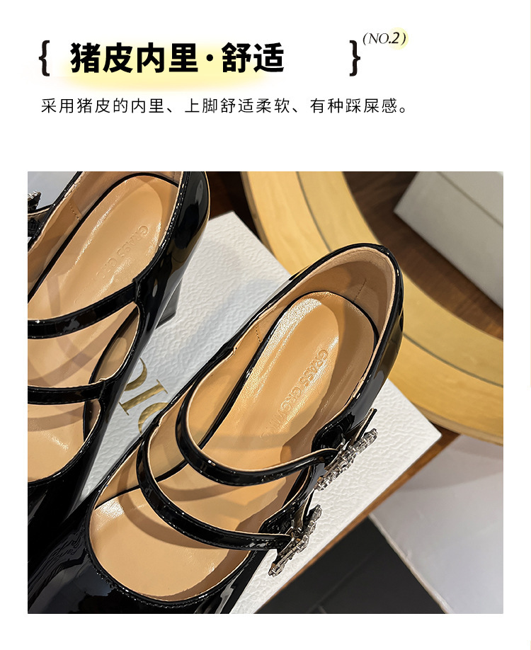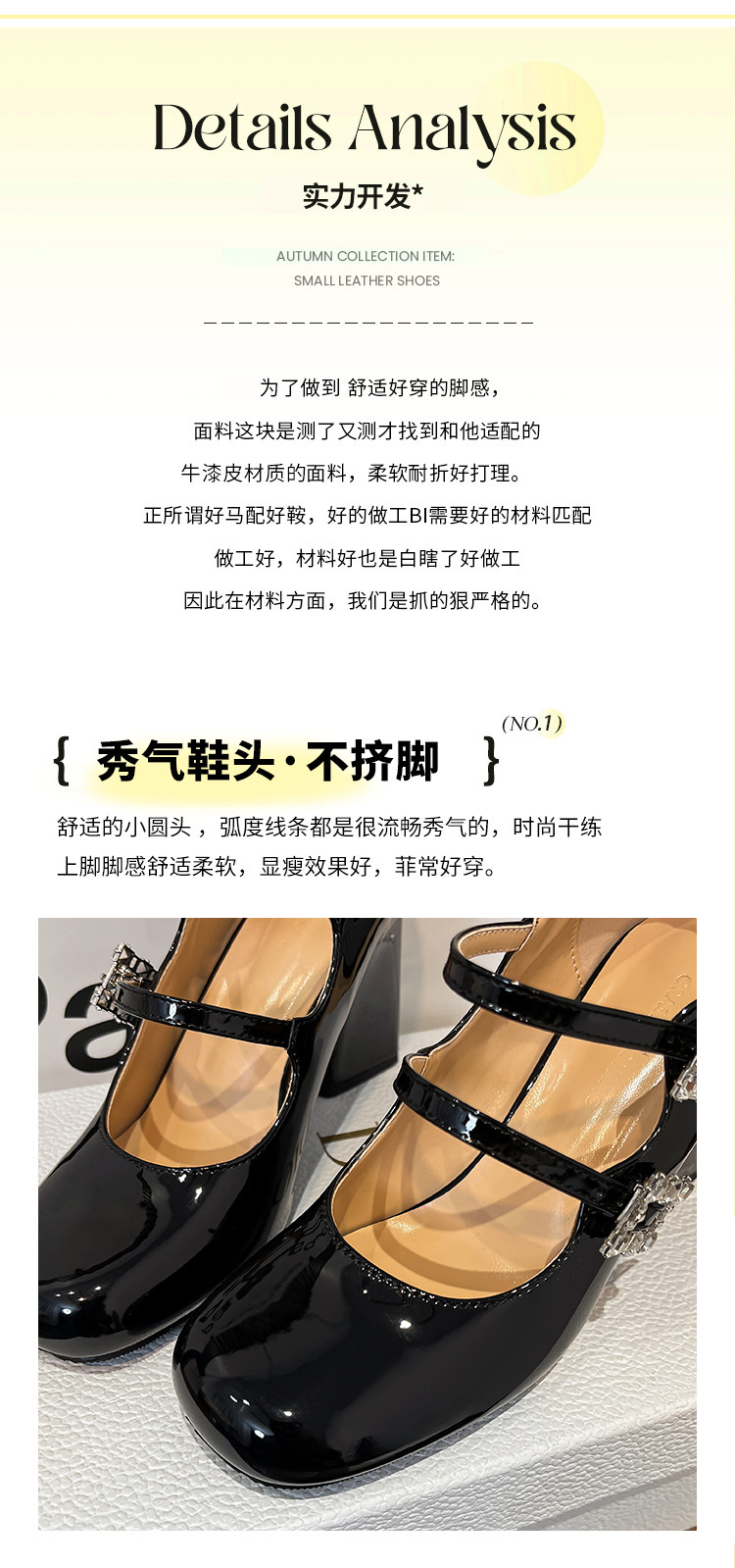 재고 레트로 프랑스 스타일 우아한 통근 메리 제인 신발 여성 두꺼운 힐 블랙 하이힐 작은 가죽 신발 얕은 입 라인스톤