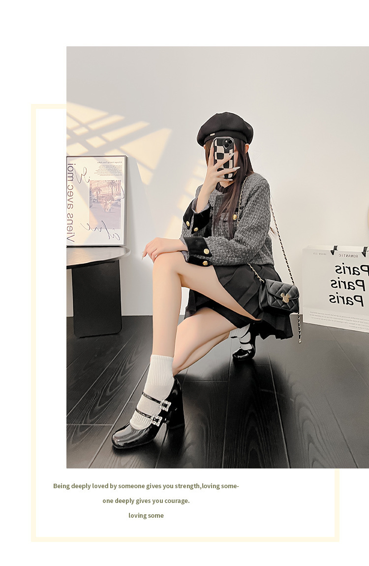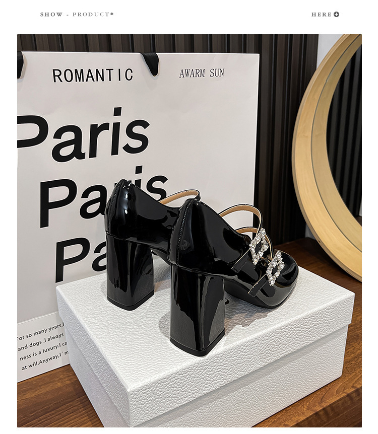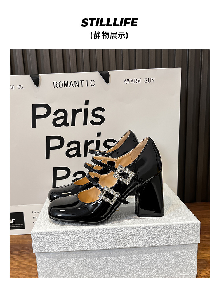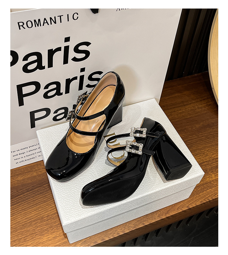 재고 레트로 프랑스 스타일 우아한 통근 메리 제인 신발 여성 두꺼운 힐 블랙 하이힐 작은 가죽 신발 얕은 입 라인스톤스토어 가기