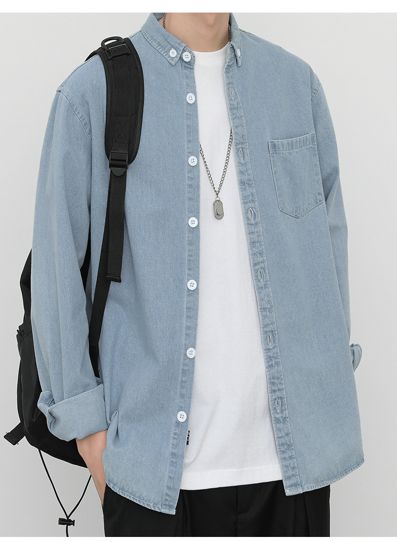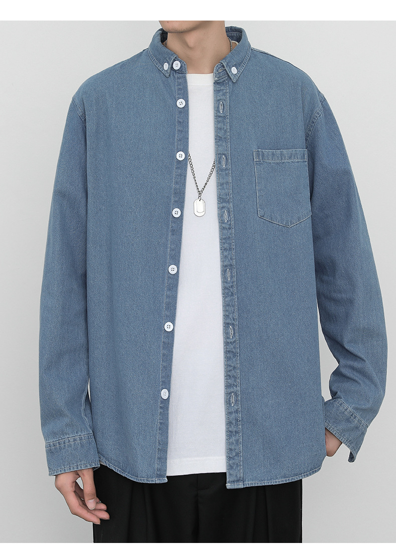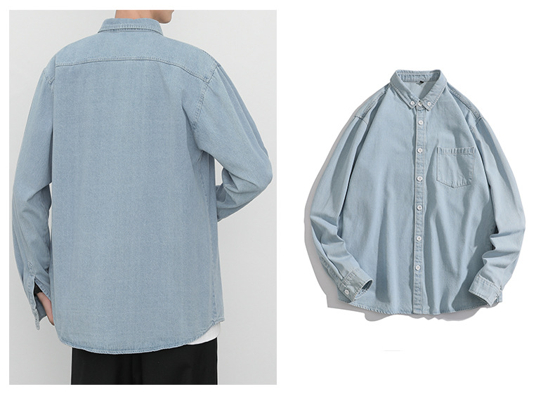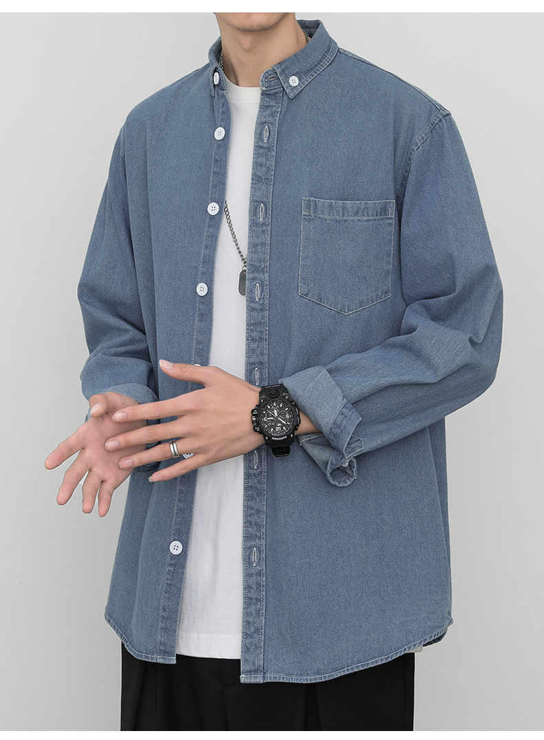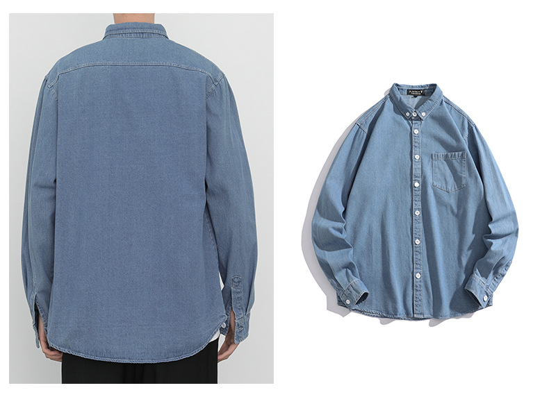 미니멀리스트 솔리드 컬러 세탁 데님 셔츠 남성용 긴팔 Ins 툴링 셔츠 캐주얼 올 매치 봄과 가을 얇은 자켓스토어 가기