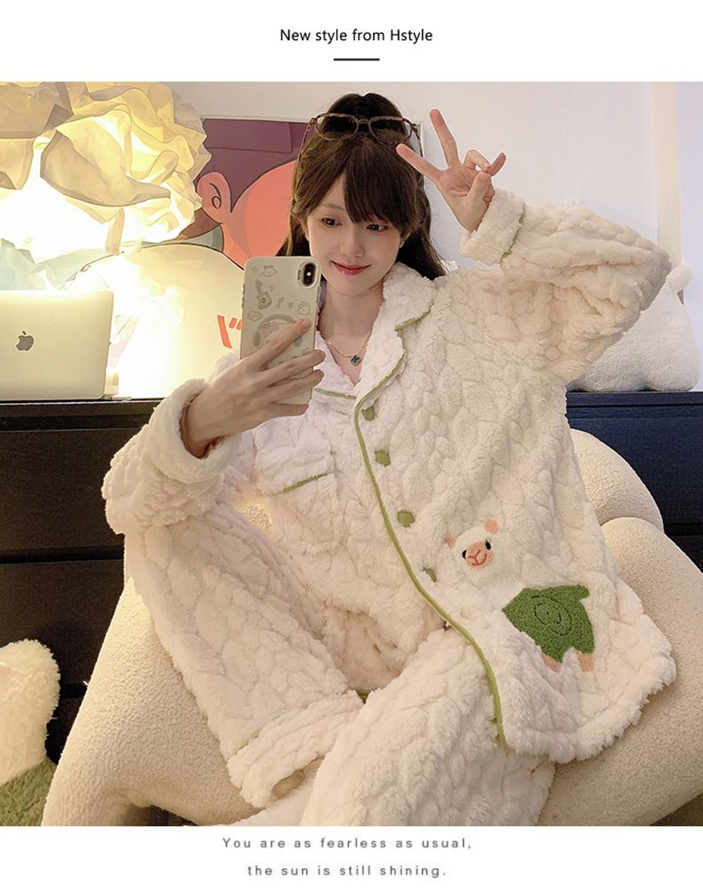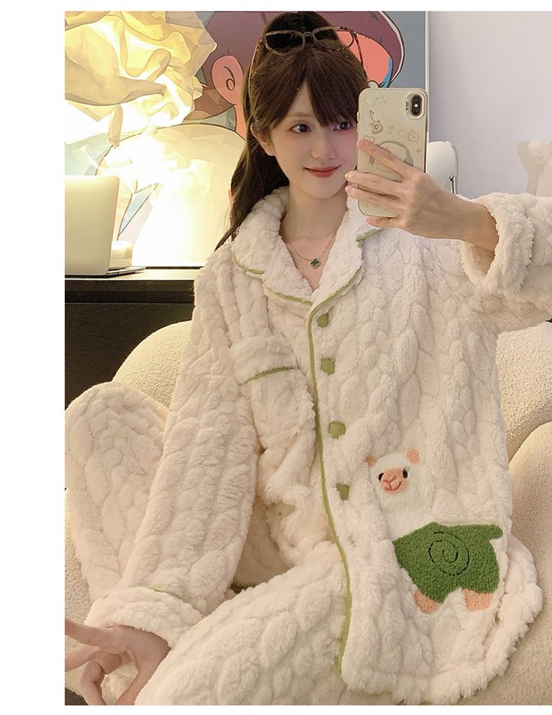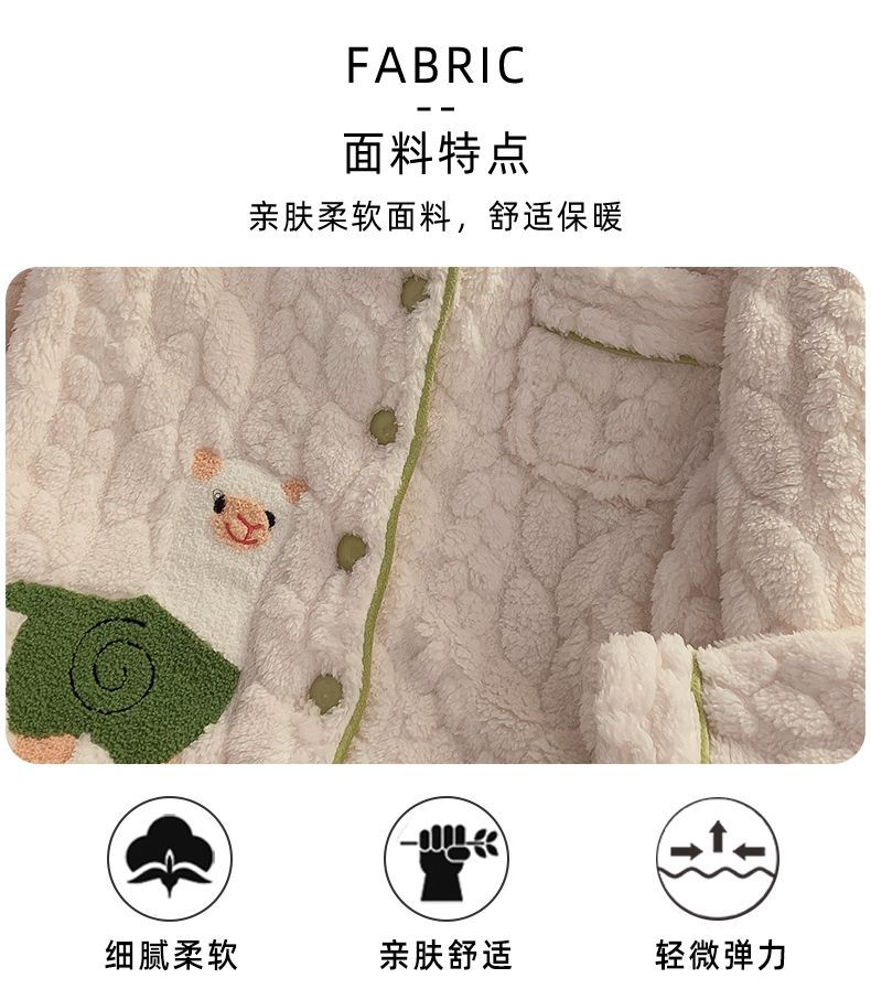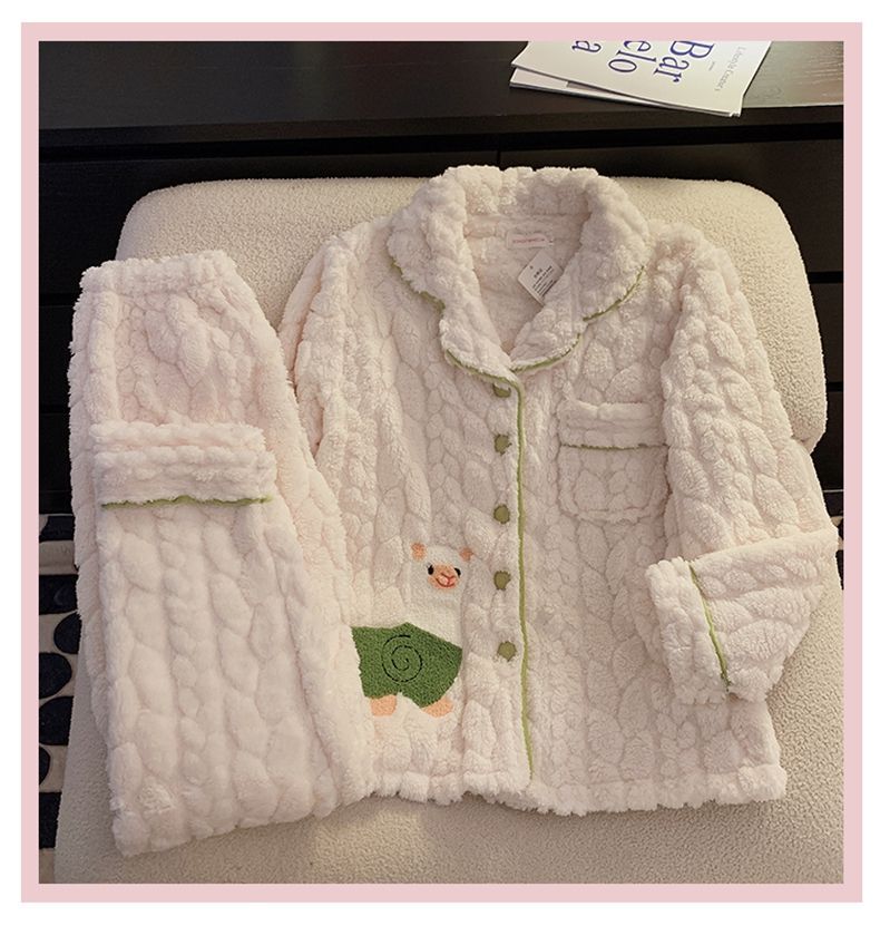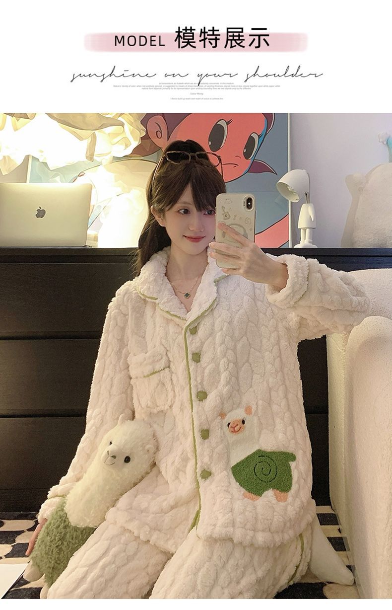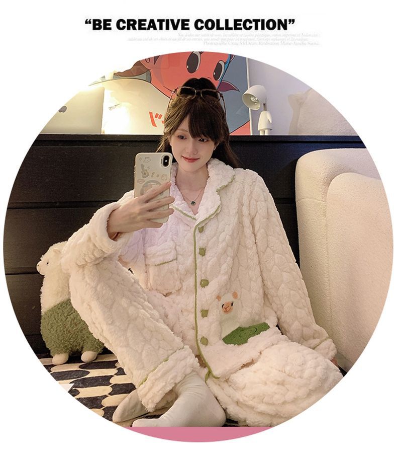 여성을위한 달콤한 산호 양털 잠옷 가을 겨울 만화 알파카 플러스 벨벳 두꺼운 겉옷 세트스토어 가기