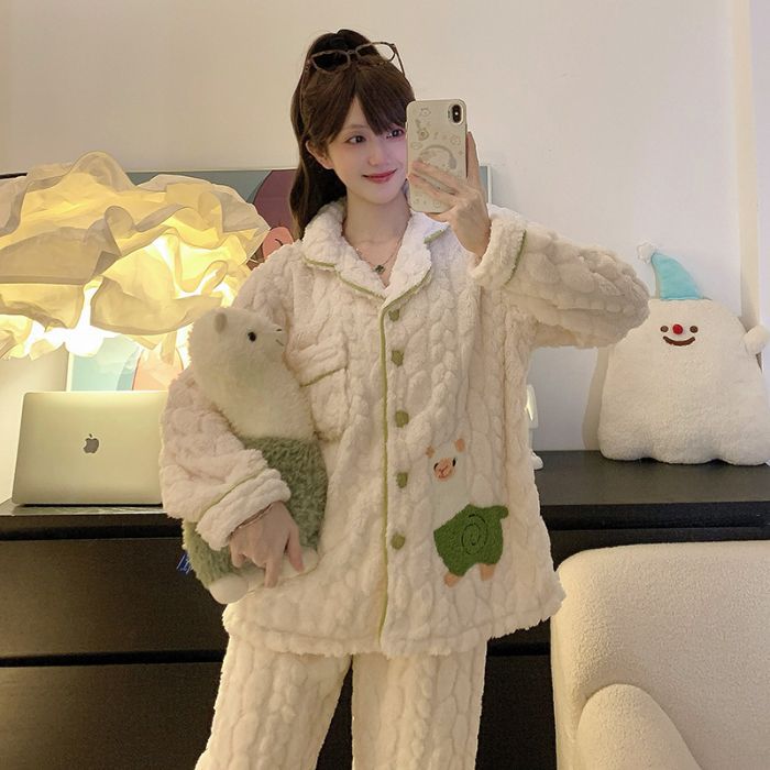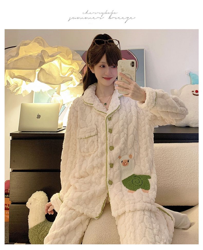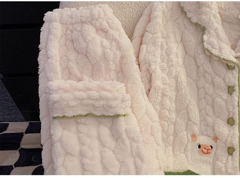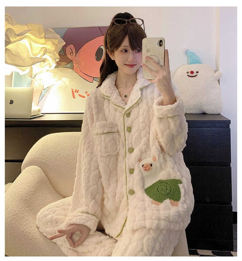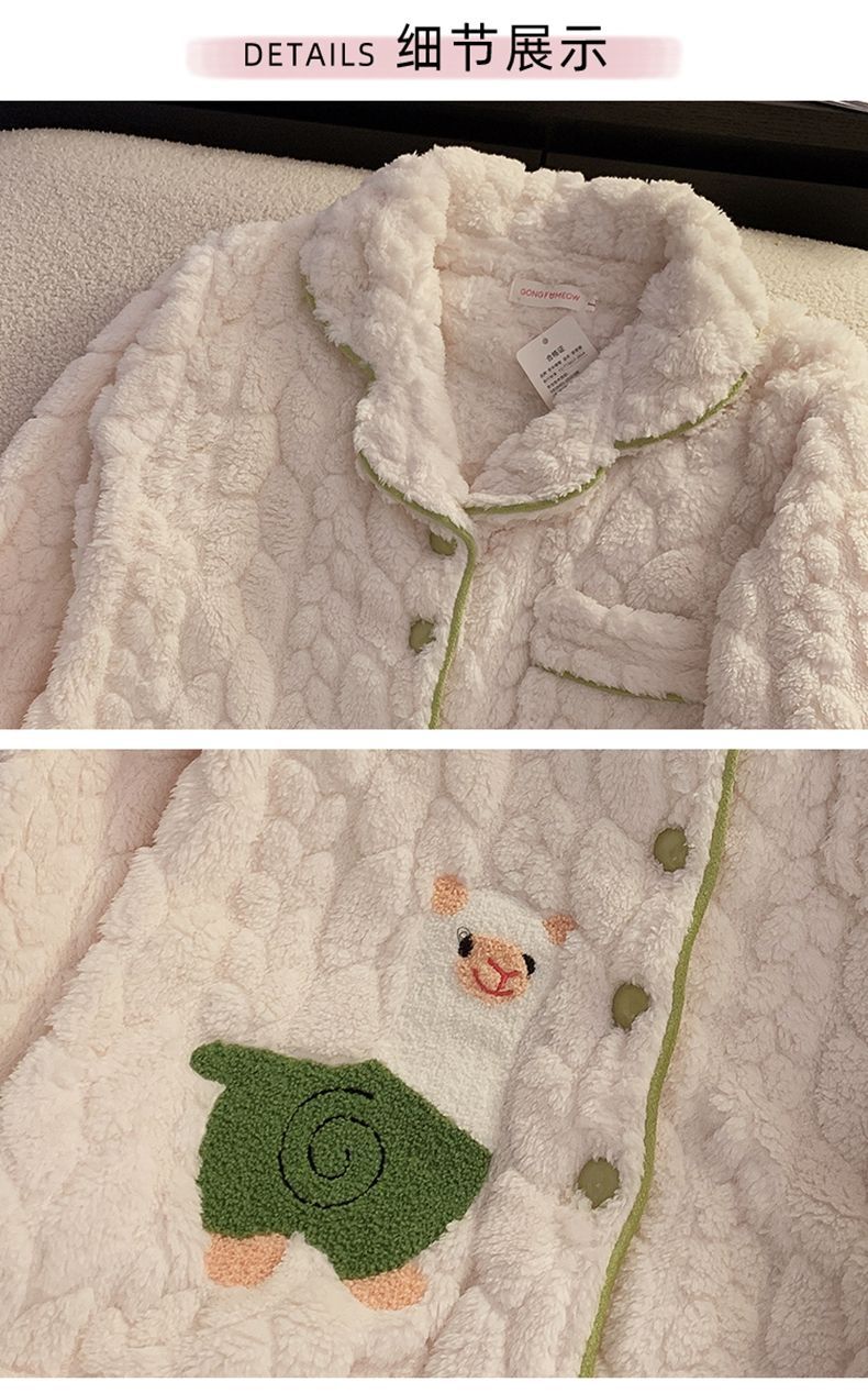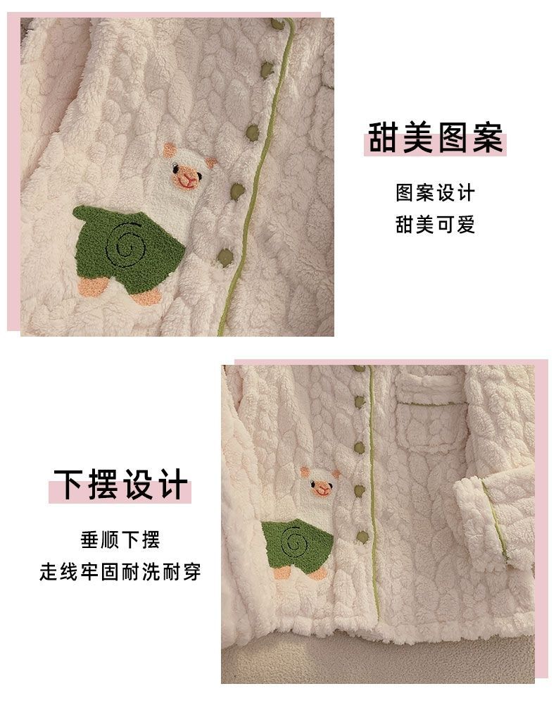 여성을위한 달콤한 산호 양털 잠옷 가을 겨울 만화 알파카 플러스 벨벳 두꺼운 겉옷 세트스토어 가기