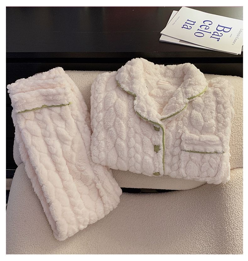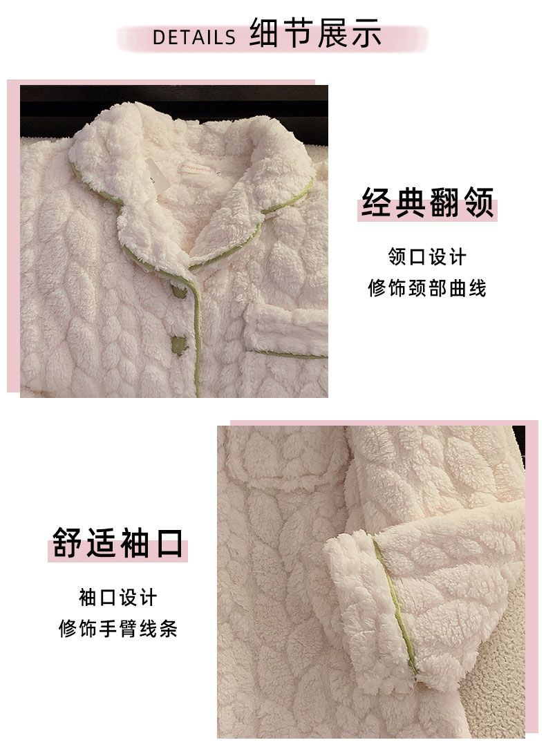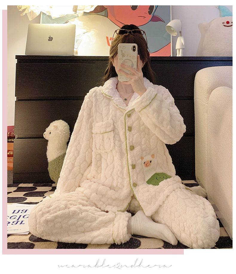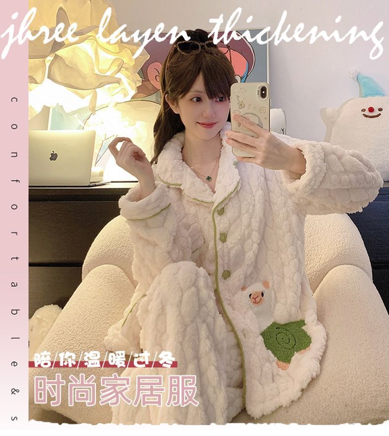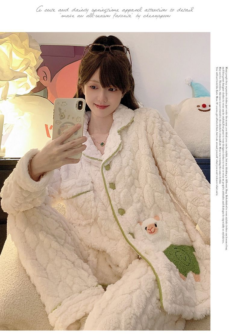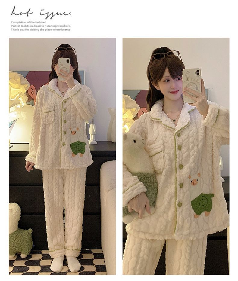 여성을위한 달콤한 산호 양털 잠옷 가을 겨울 만화 알파카 플러스 벨벳 두꺼운 겉옷 세트스토어 가기