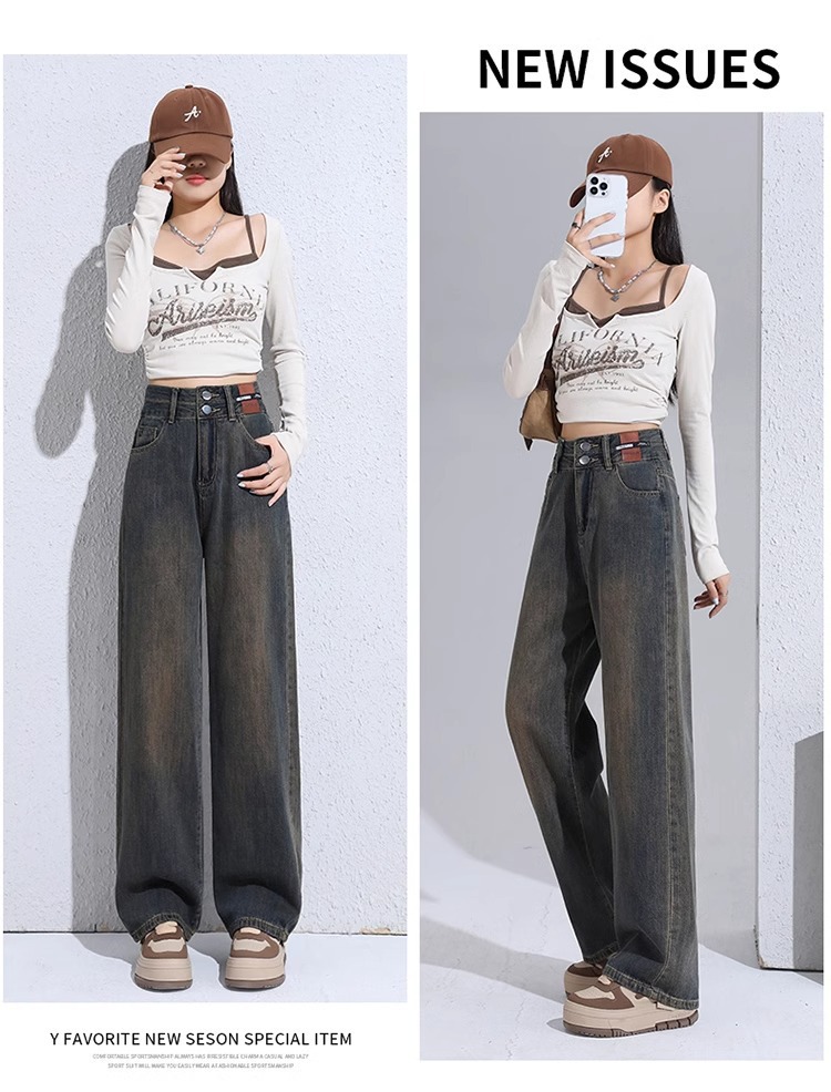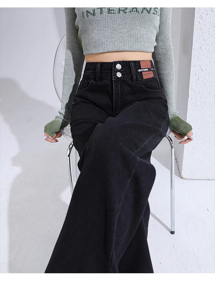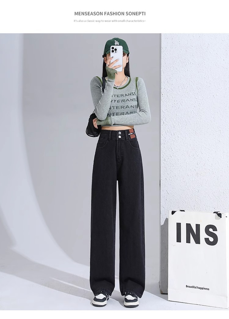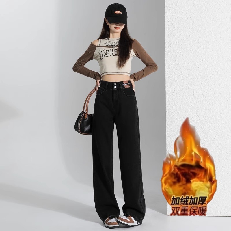겨울 기모 두꺼운 와이드 레그 청바지 여성용 트렌디 올매치 하이 웨이스트 슬리밍 좁은 디자인 센스 캐주얼 스트레이트 팬츠스토어 가기