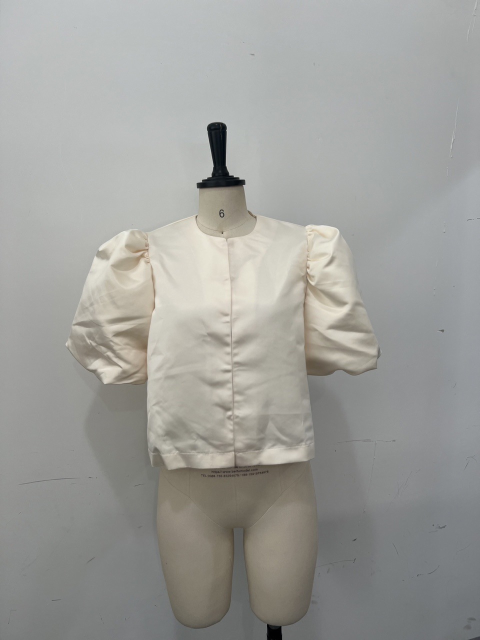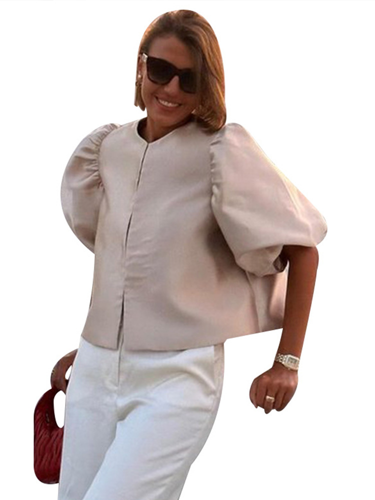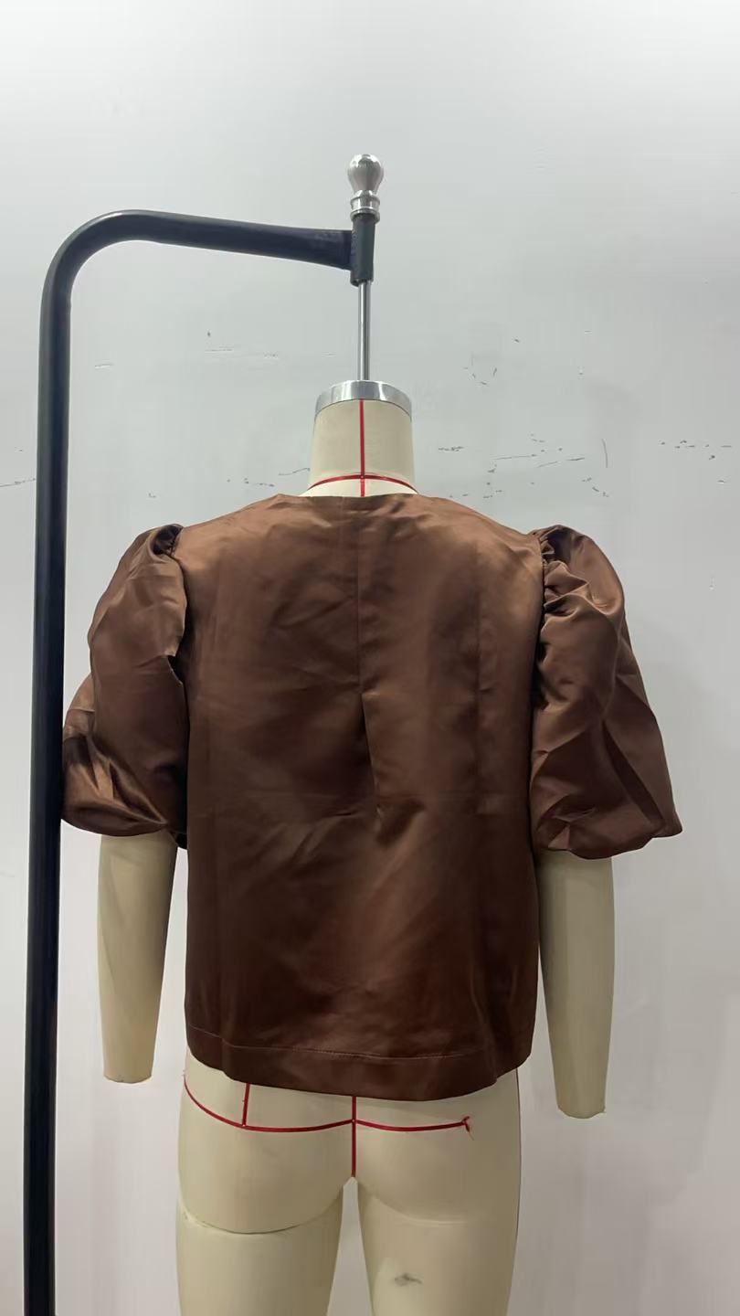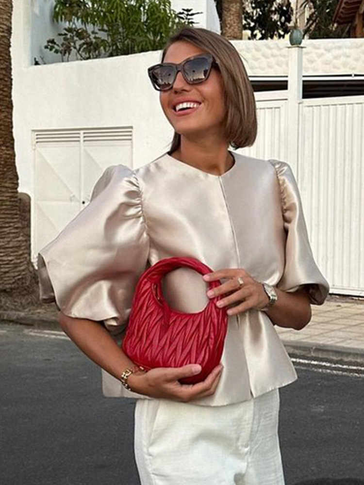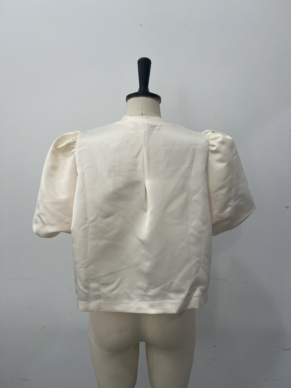 재고-유럽과 미국 국경 2024 새로운 패션 새틴 버블 소매 짧은 느슨한 프랑스 간단한 셔츠