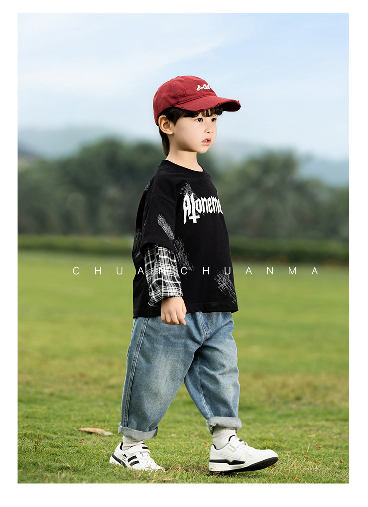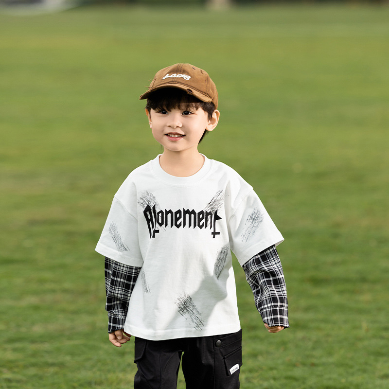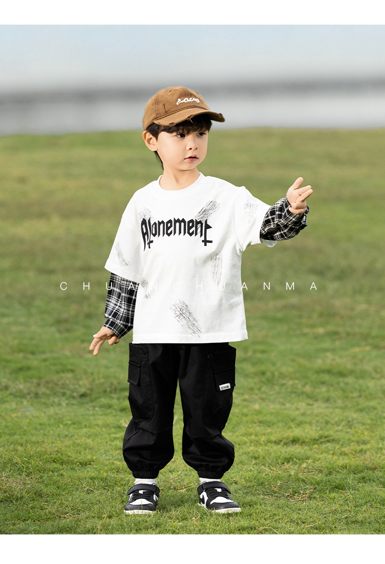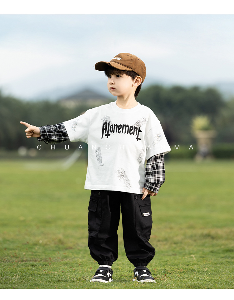 바람의 계곡 2025 봄 새 아동복 어린이 한국 가짜 2 조각 격자 티셔츠 소년의 트렌디 한 멋진 편지 기지