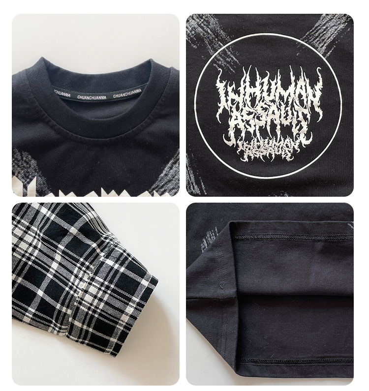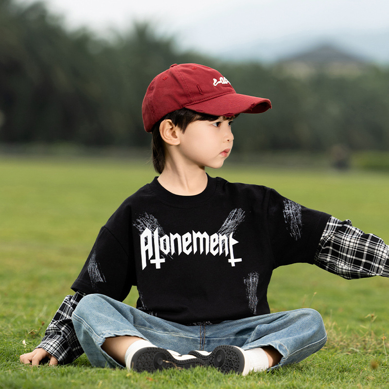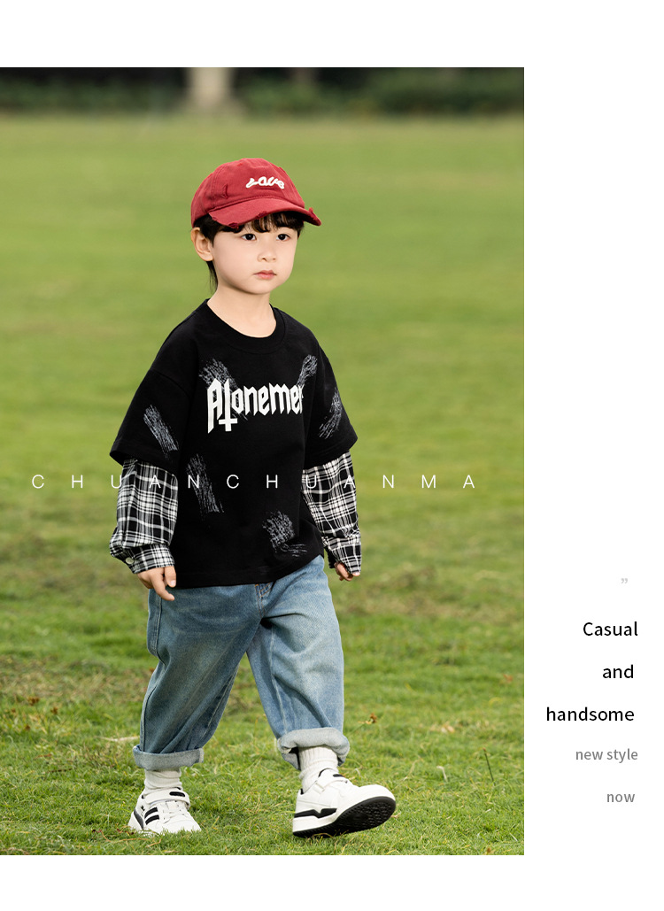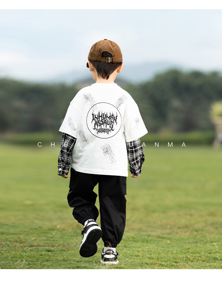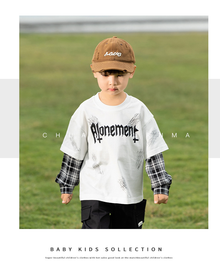 바람의 계곡 2025 봄 새 아동복 어린이 한국 가짜 2 조각 격자 티셔츠 소년의 트렌디 한 멋진 편지 기지