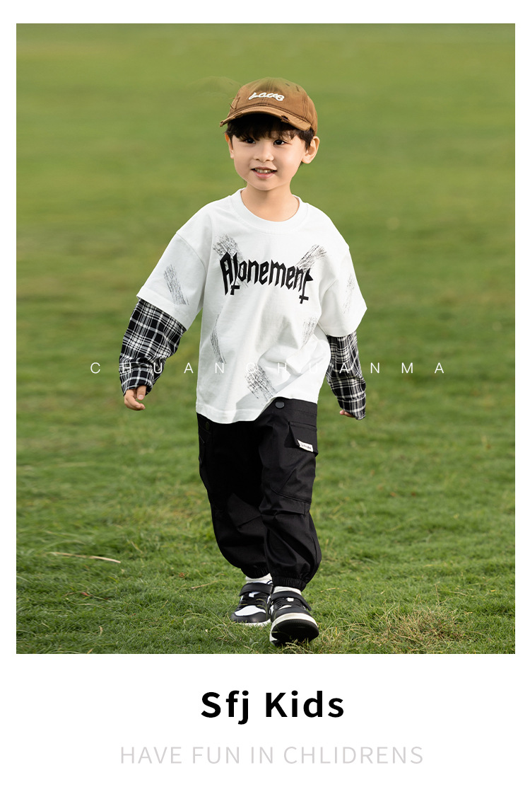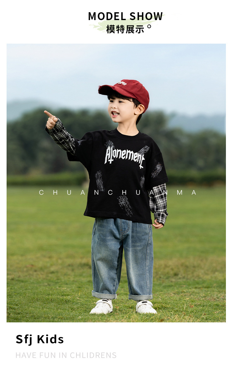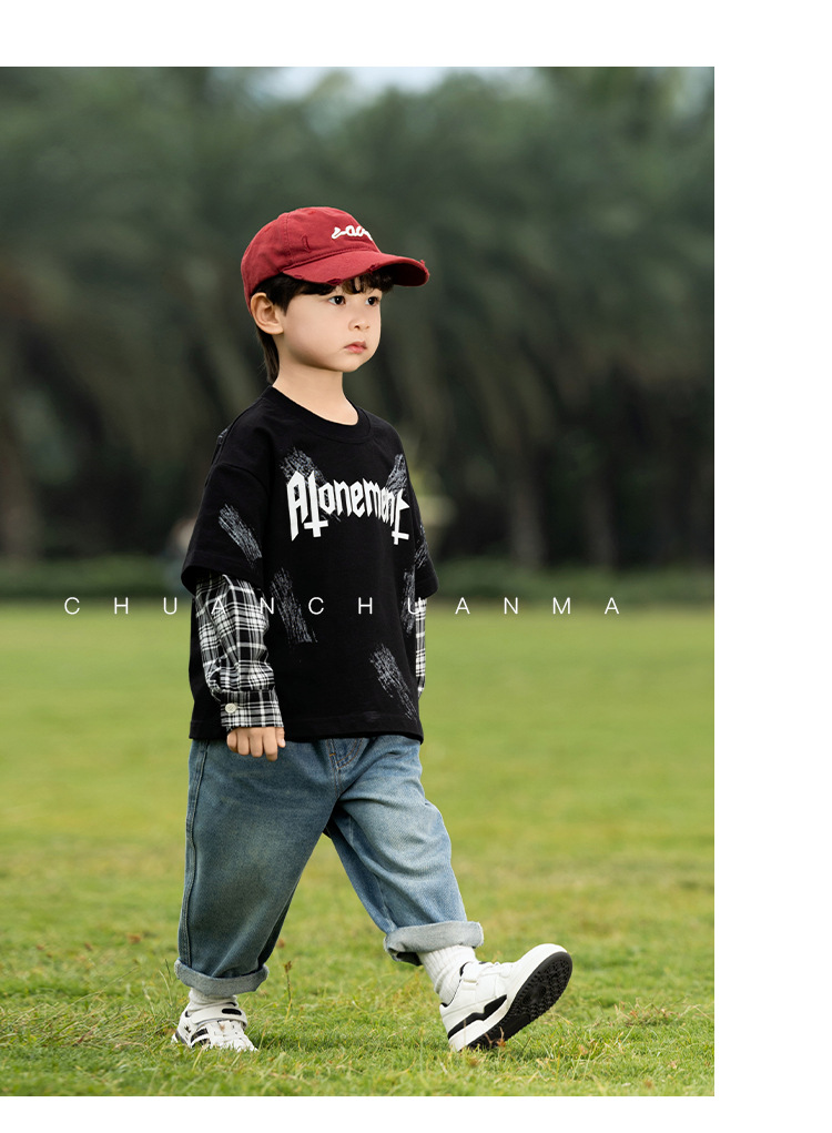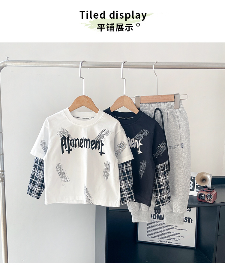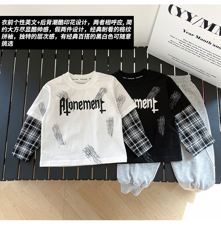 바람의 계곡 2025 봄 새 아동복 어린이 한국 가짜 2 조각 격자 티셔츠 소년의 트렌디 한 멋진 편지 기지스토어 가기