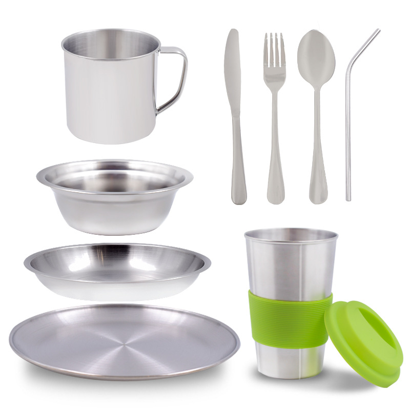 도매 캠핑 식기 세트 11pcs 야외 캠핑 바베큐 여행 용품 스테인레스 스틸 그릇 젓가락 접시 물 컵스토어 가기