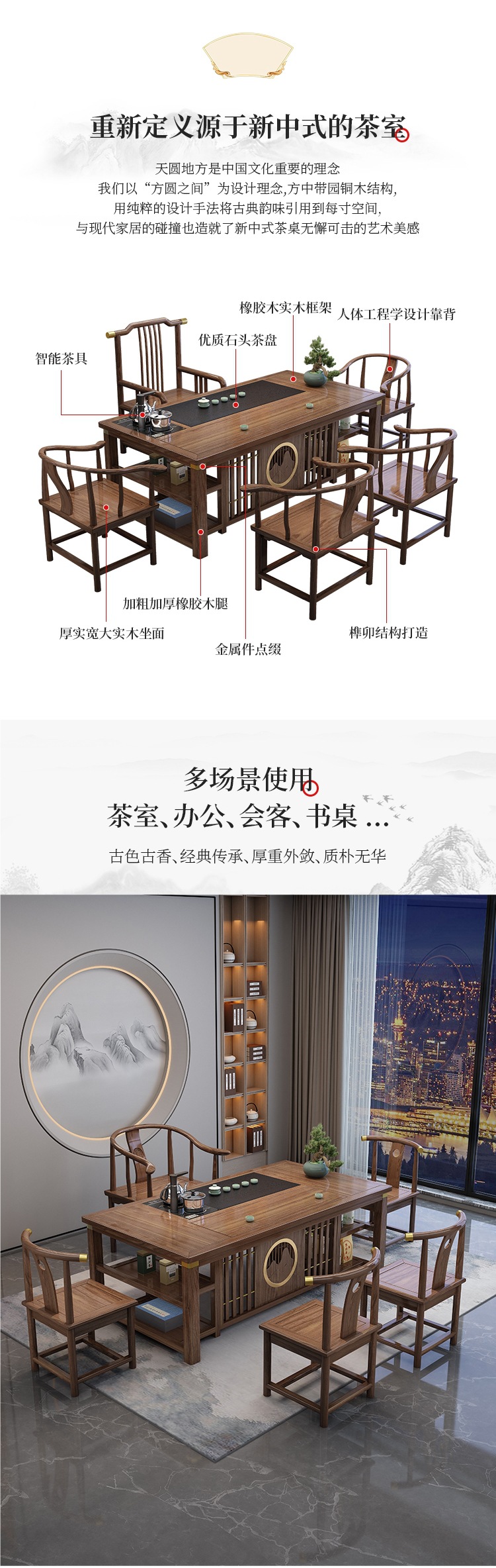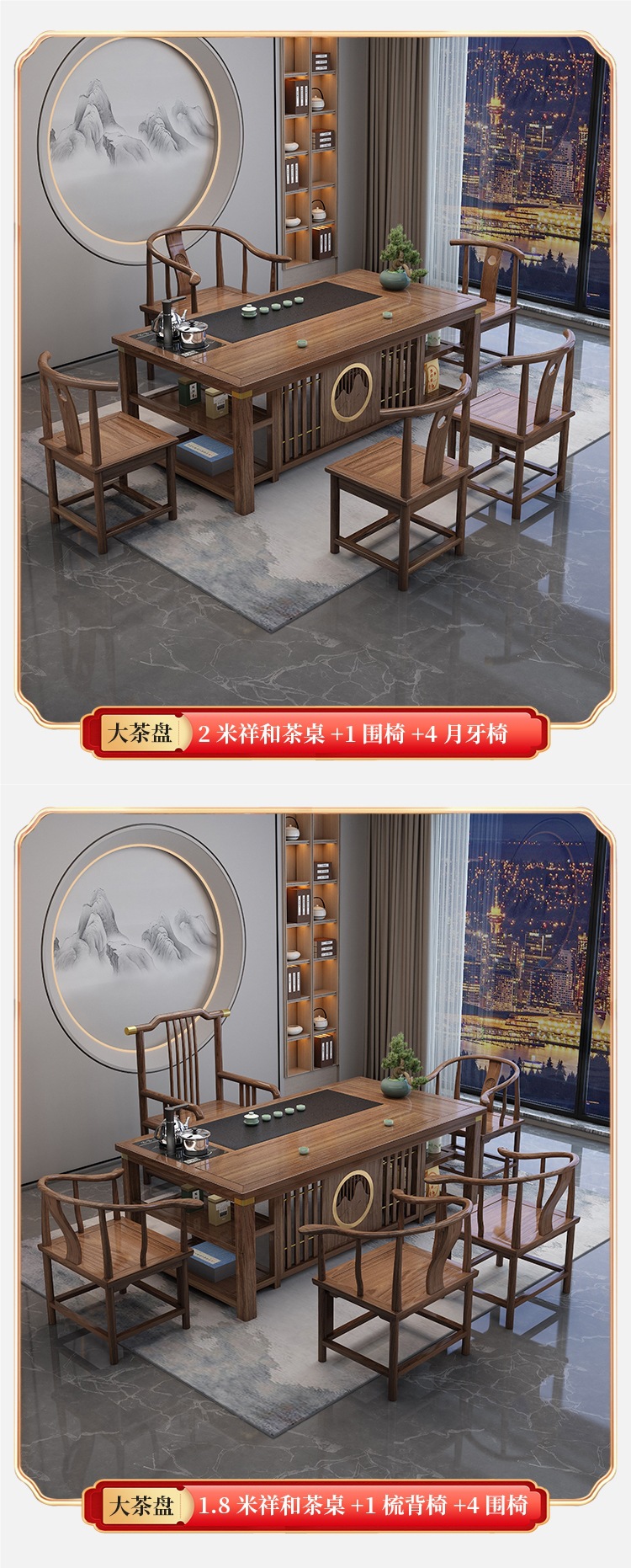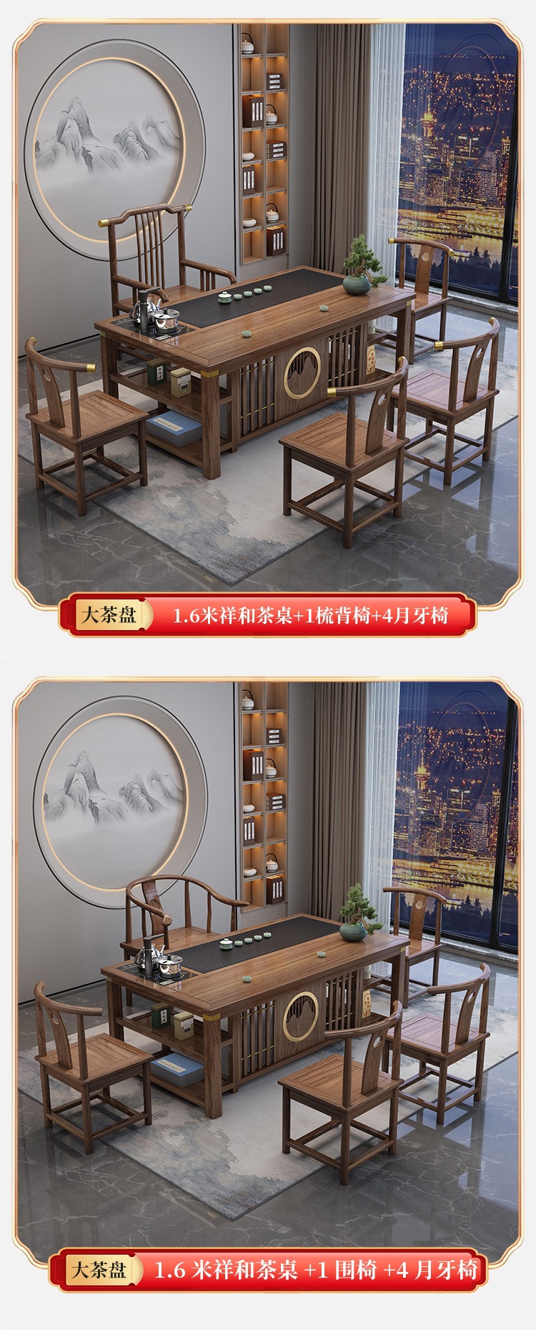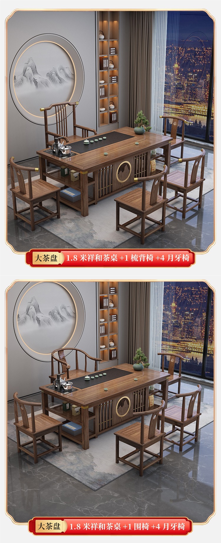 • 1.8m Xianghe + 빗 등받이 의자 1개, 구리 슬리브가 있는 초승달 의자 4개, 중간 돌 접시/이중 보관함