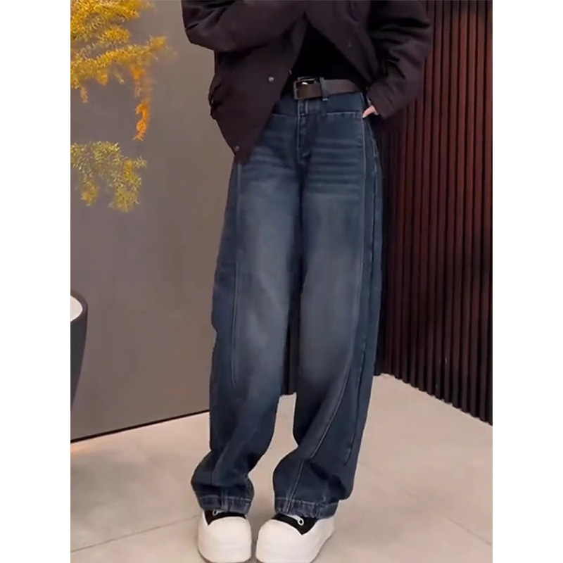 미국 레트로 스타일 하이웨이스트 와이드 레그 청바지 여성용 가을 겨울 신상품 큰 사이즈 배형 체형 플러스 사이즈 커버 바지스토어 가기
