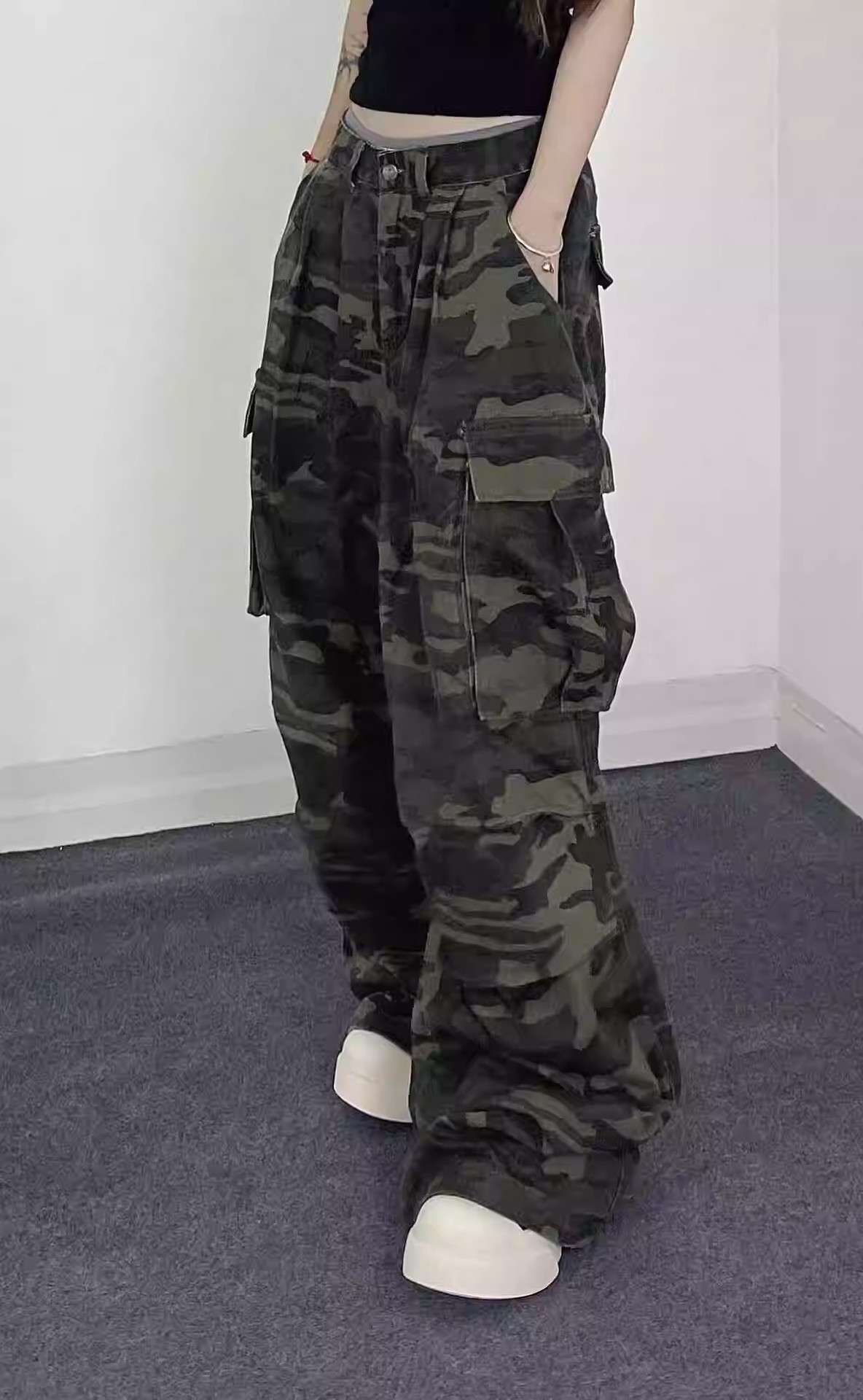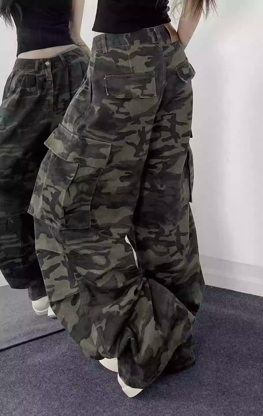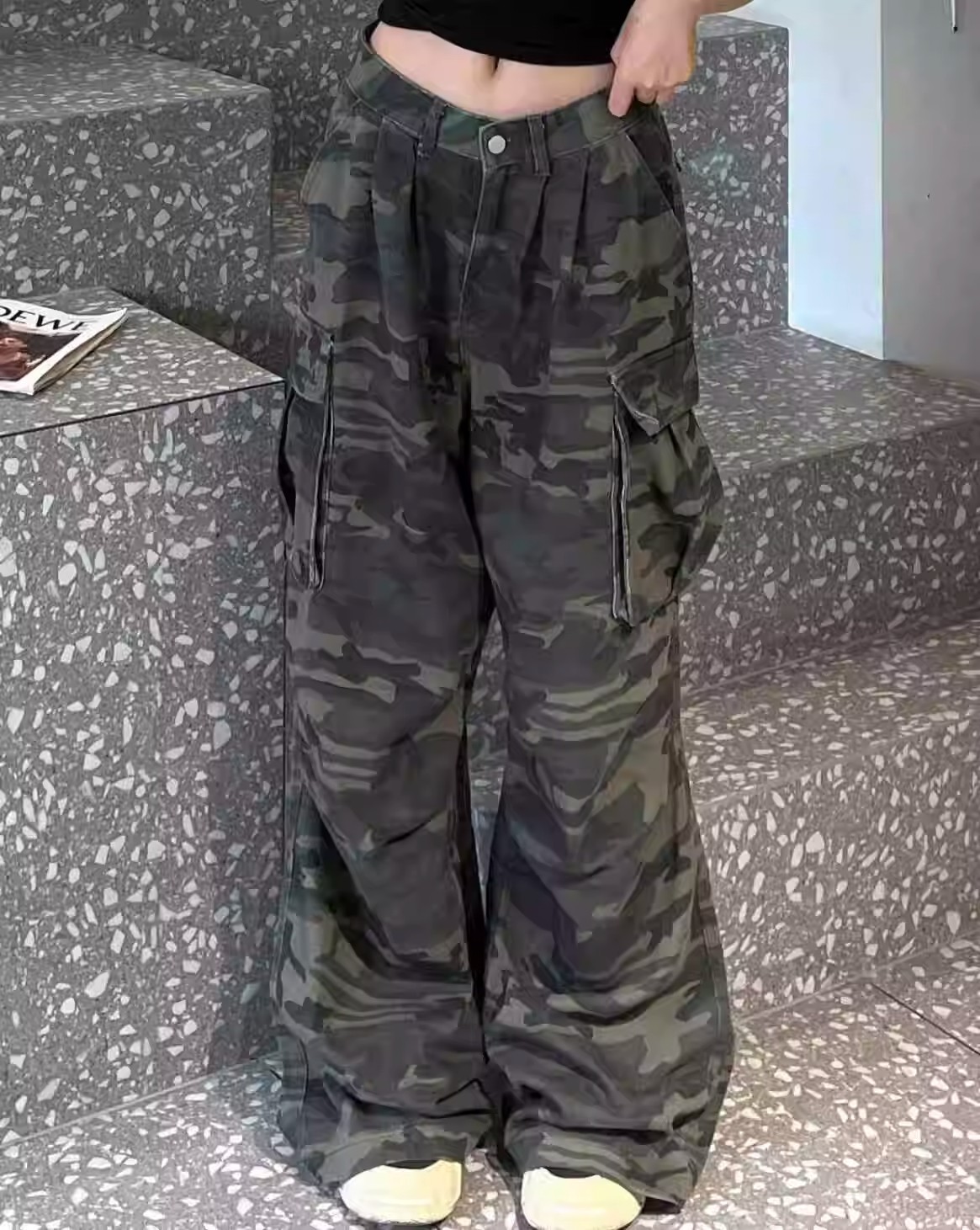 미국 복고풍 위장 작업복 캐주얼 바지 여성의 봄 폐기물 지구 스타일 거리 뜨거운 소녀 느슨한 직선 다리 넓은 다리 유행 바지