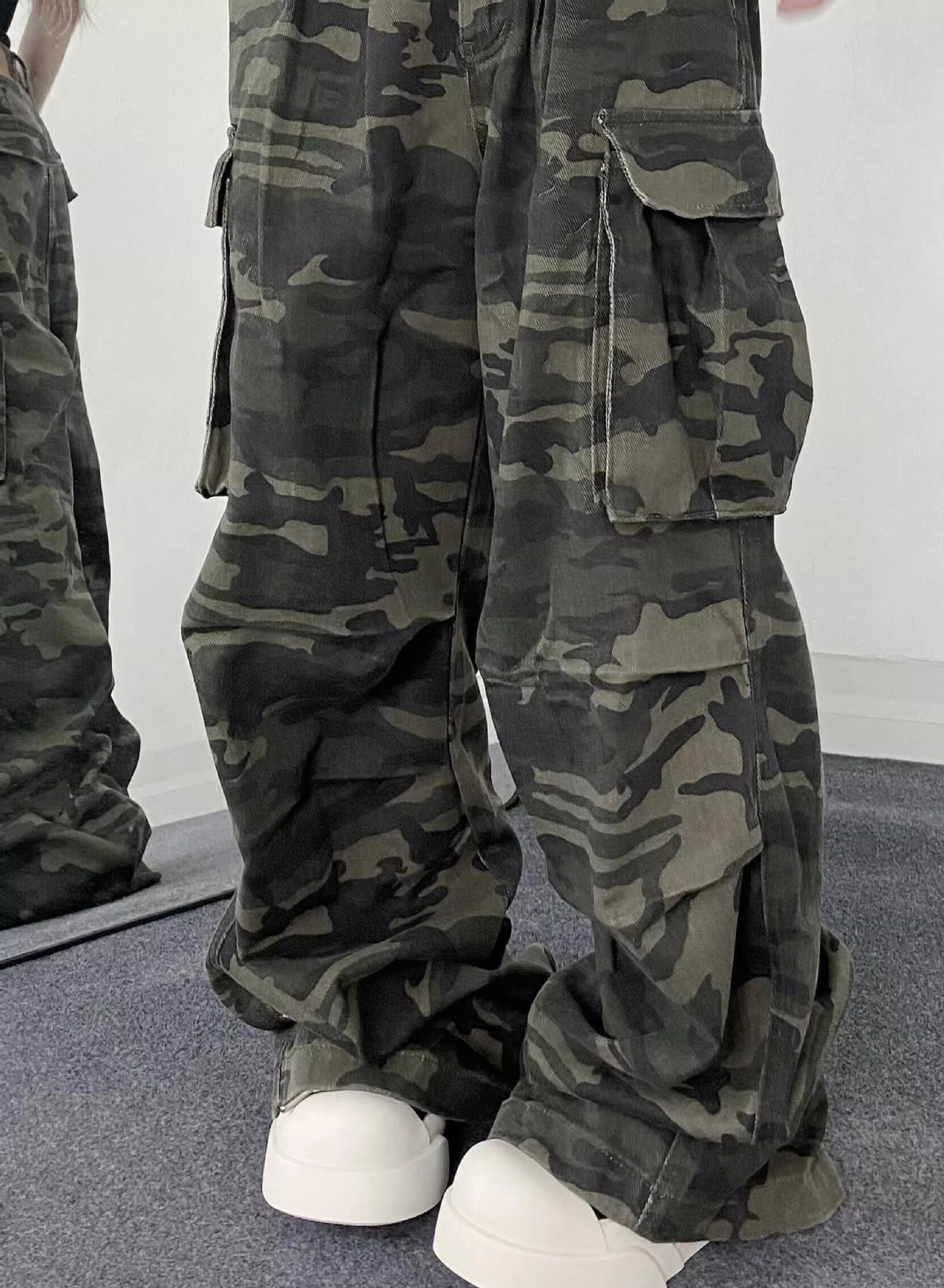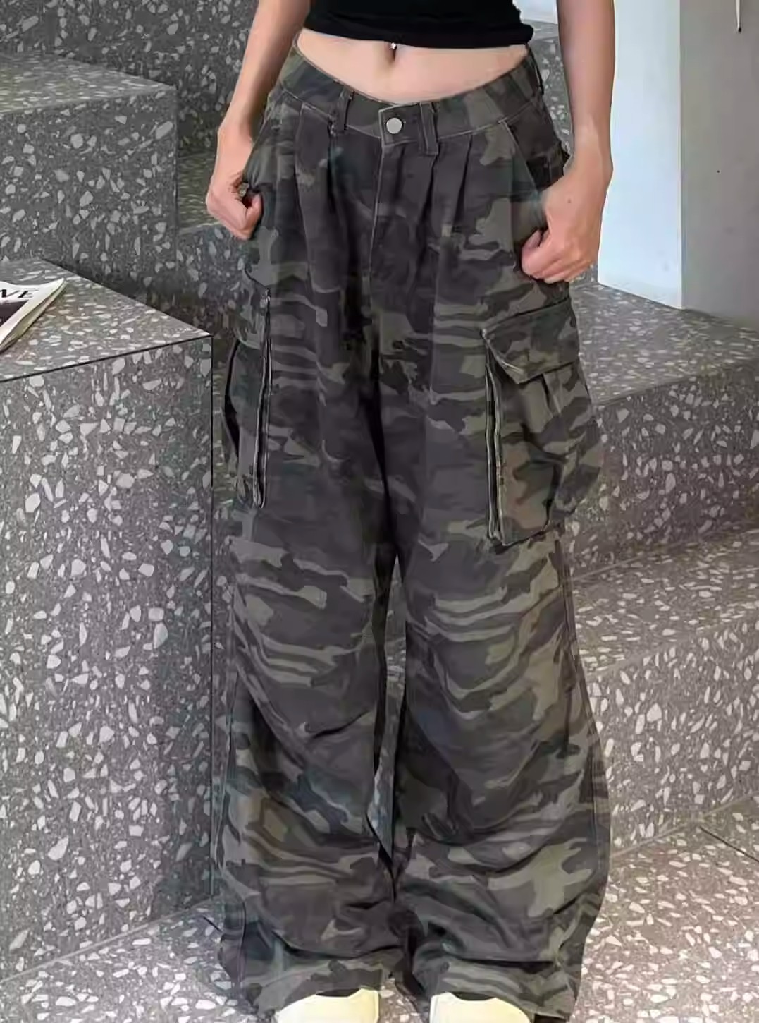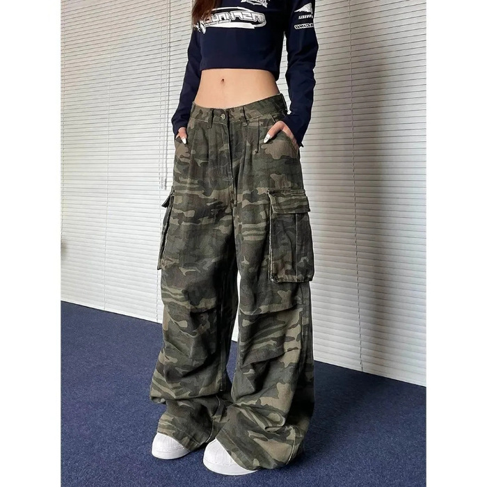 미국 복고풍 위장 작업복 캐주얼 바지 여성의 봄 폐기물 지구 스타일 거리 뜨거운 소녀 느슨한 직선 다리 넓은 다리 유행 바지