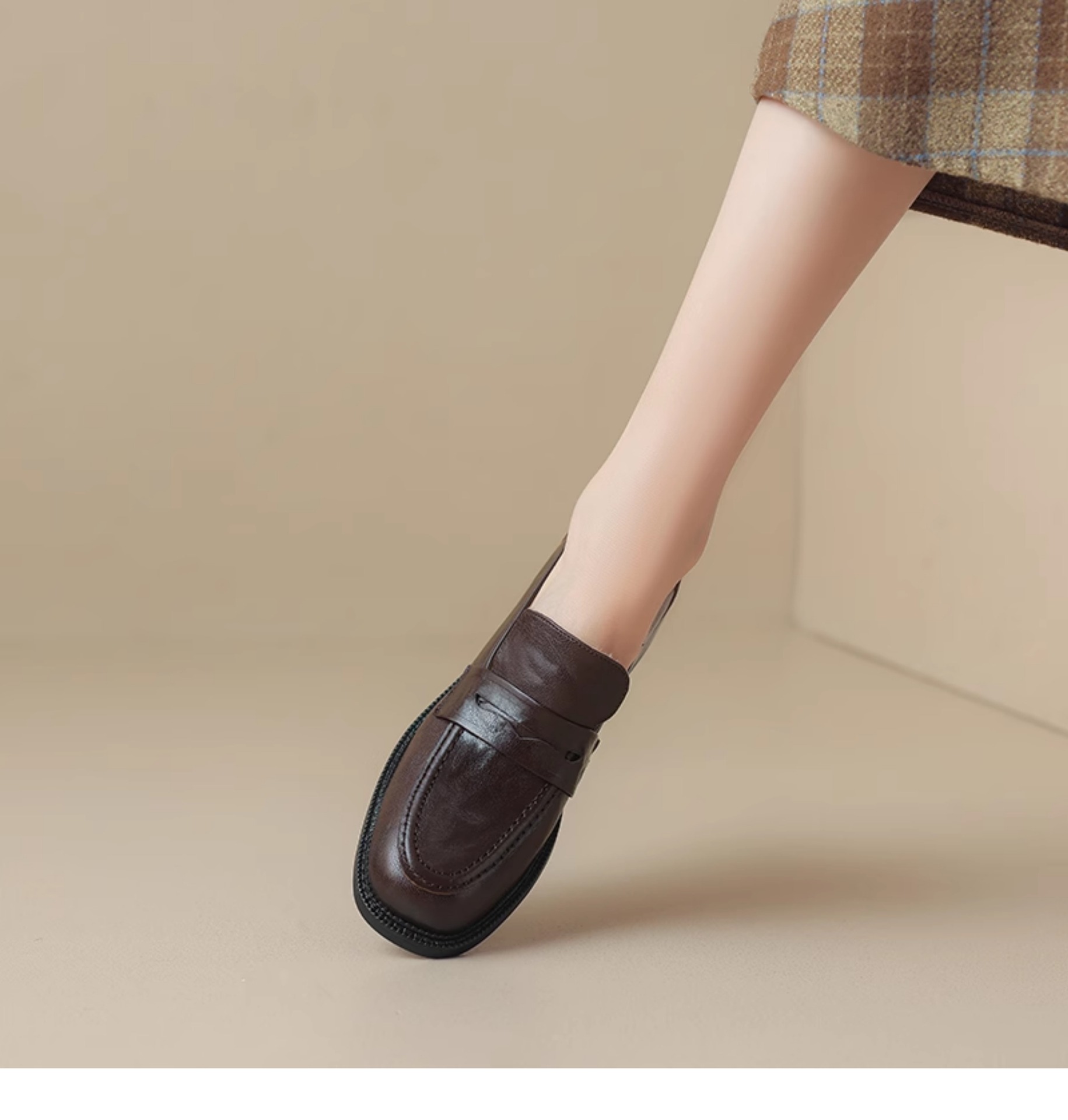 거친 뒤꿈치 작은 가죽 신발 2024 새로운 가을과 겨울 복고풍 다목적 로퍼 미드 힐 라운드 토 영국 스타일의 가죽 싱글 레이어 신발 여성용