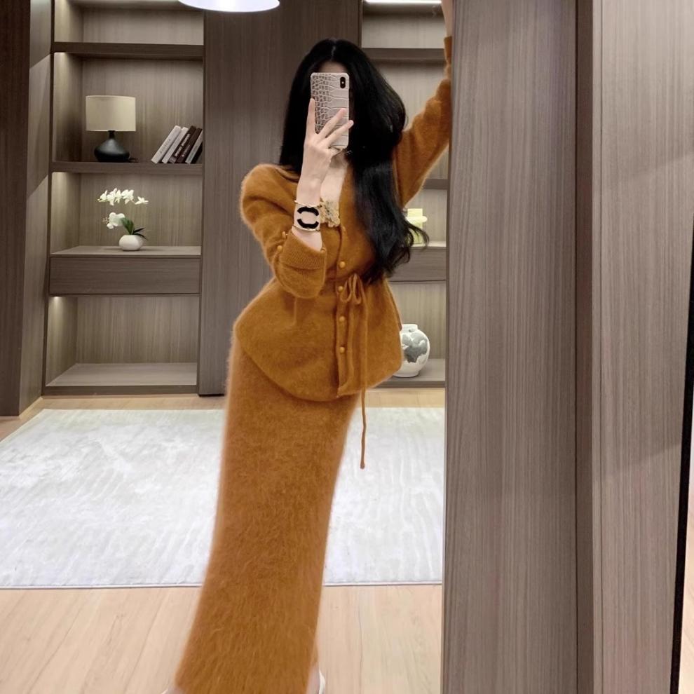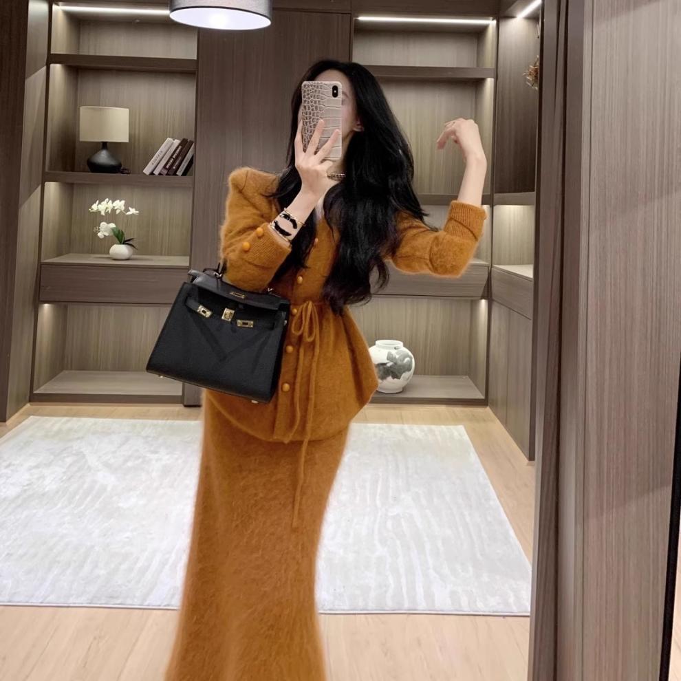 초겨울 착용 하이 엔드 스웨터 니트 힙 원피스 작은 향수 스타일 외국 스타일 투피스 여성의 새로운 세트