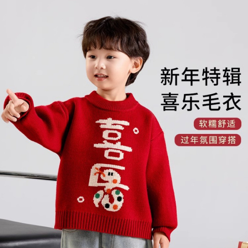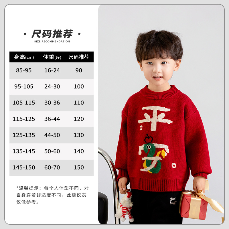 어린이 착용 겨울 소년 스웨터 2025 새로운 스타일 어린이 새해 안전하고 어린이와 소녀를위한 해피 레드 니트 스웨터스토어 가기