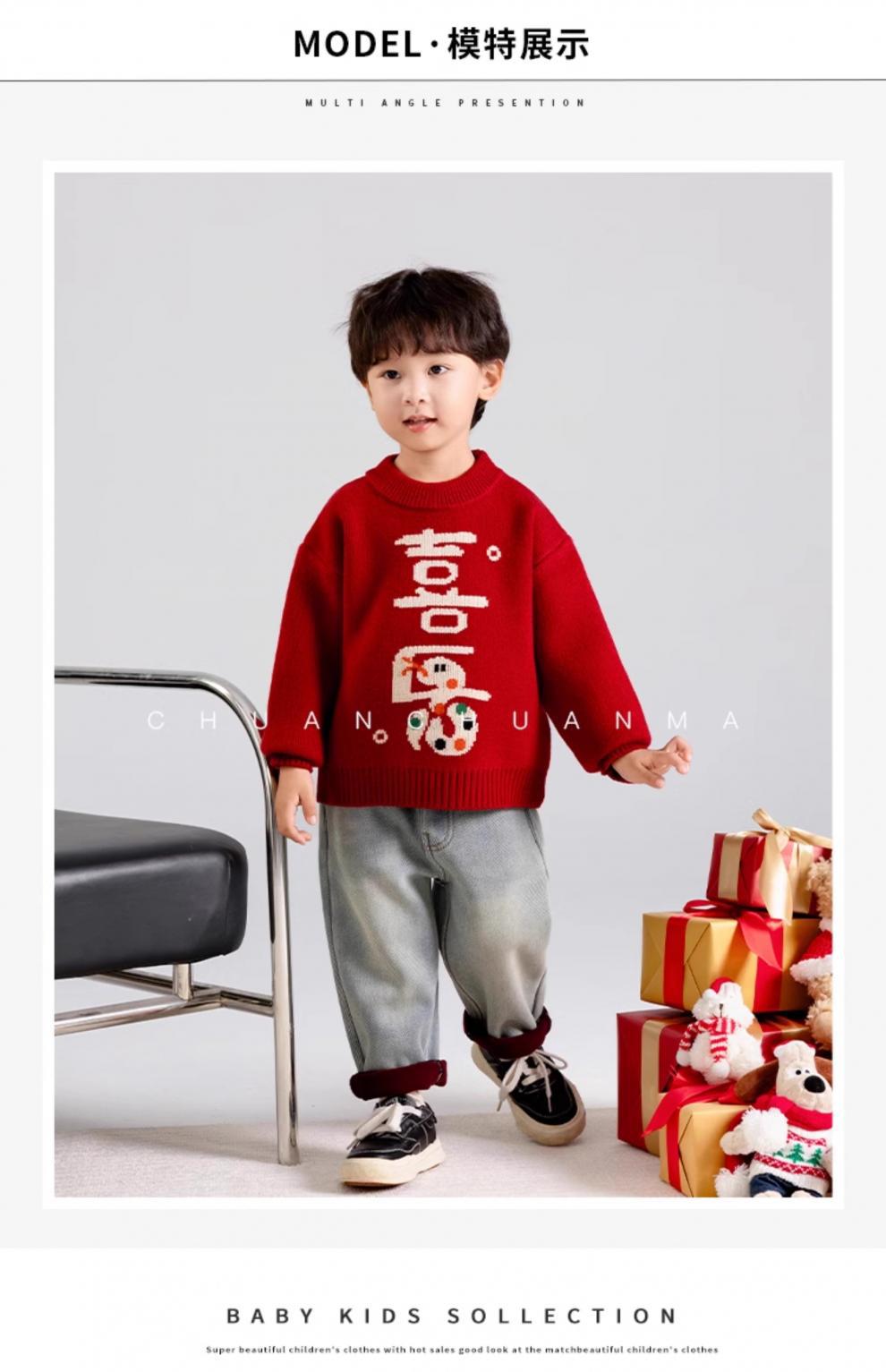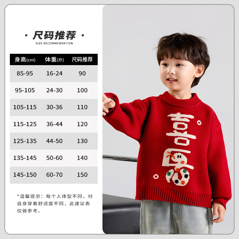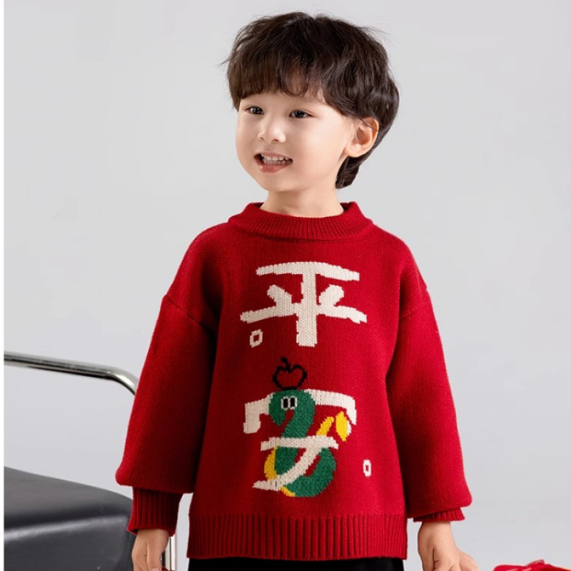 어린이 착용 겨울 소년 스웨터 2025 새로운 스타일 어린이 새해 안전하고 어린이와 소녀를위한 해피 레드 니트 스웨터