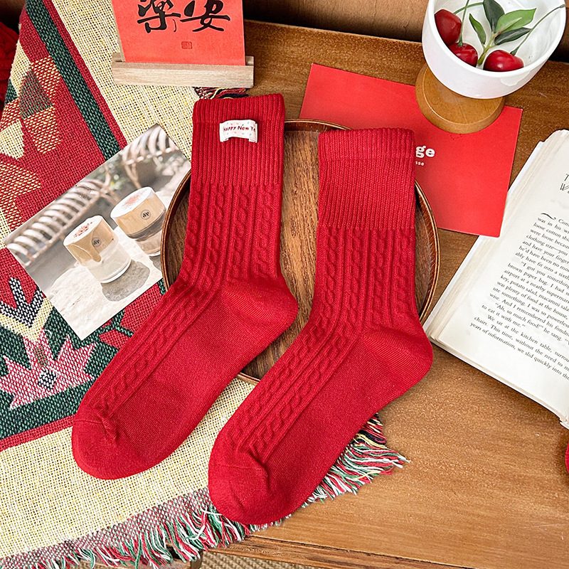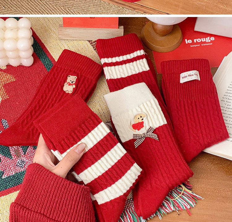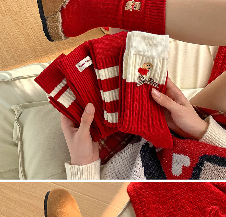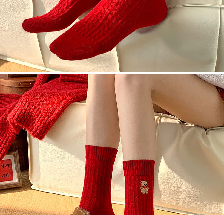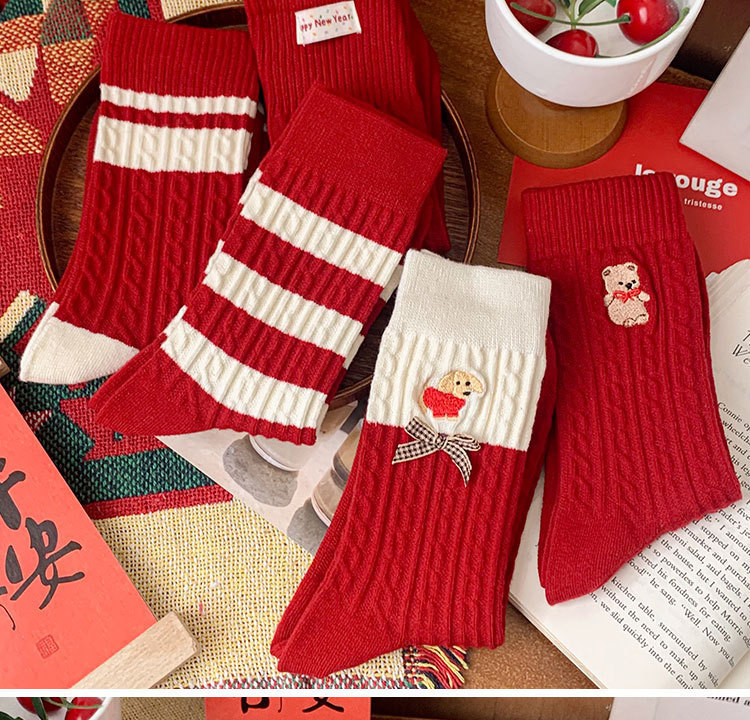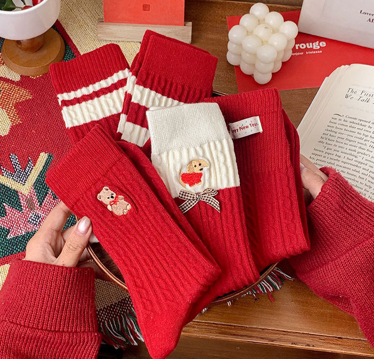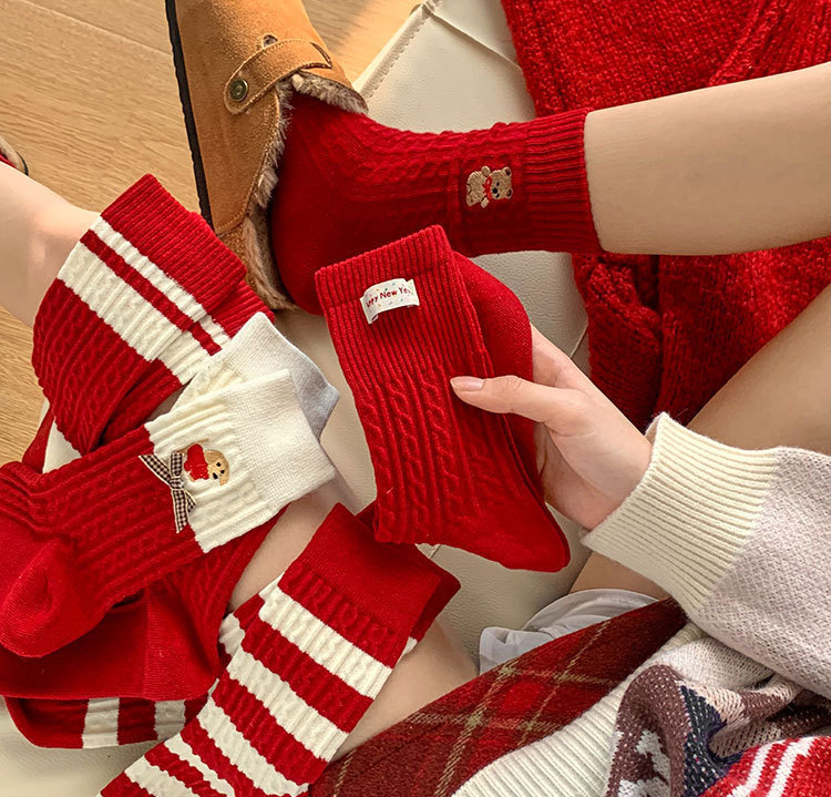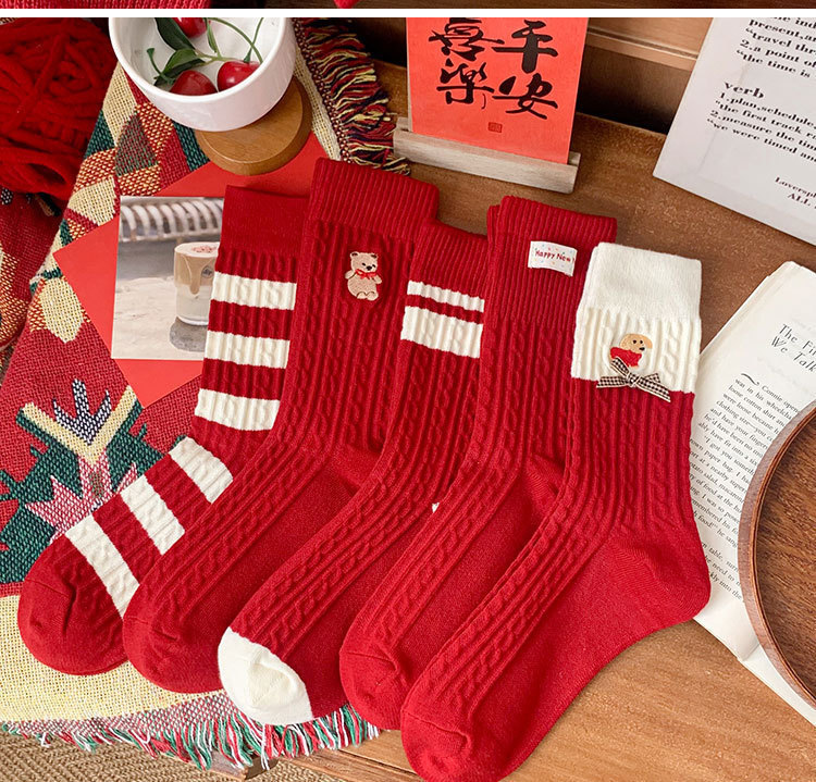 레드 양말 여성의 새해 양말 미드 튜브 코튼 양말 Ins 트렌디 자수 베어 천 라벨 새해 트위스트 레드 양말