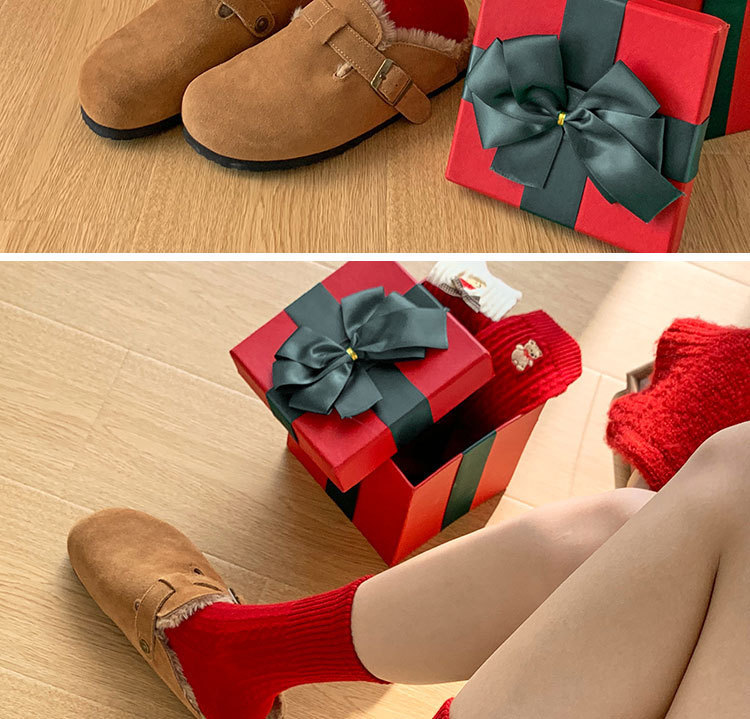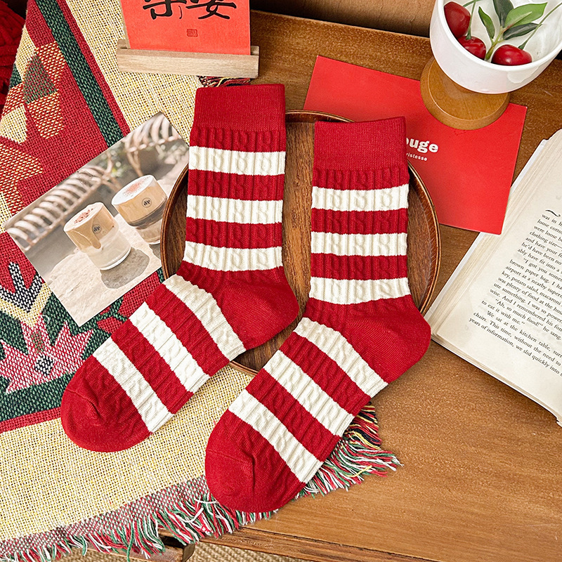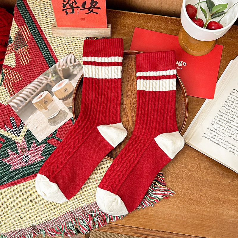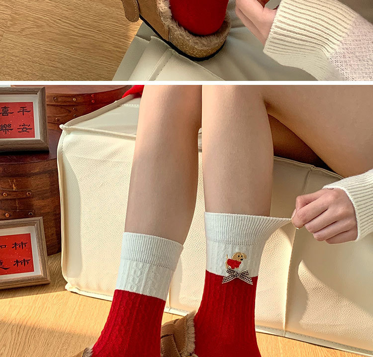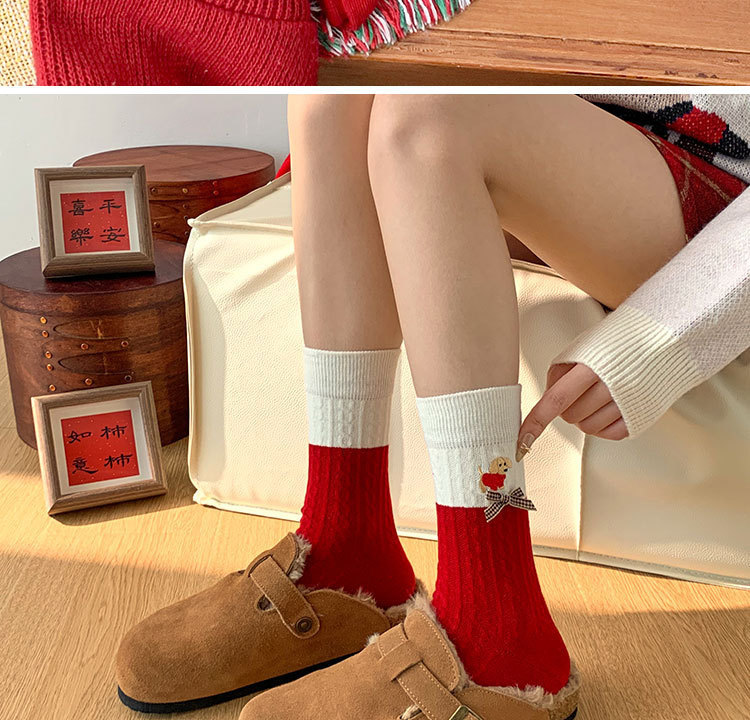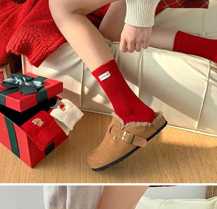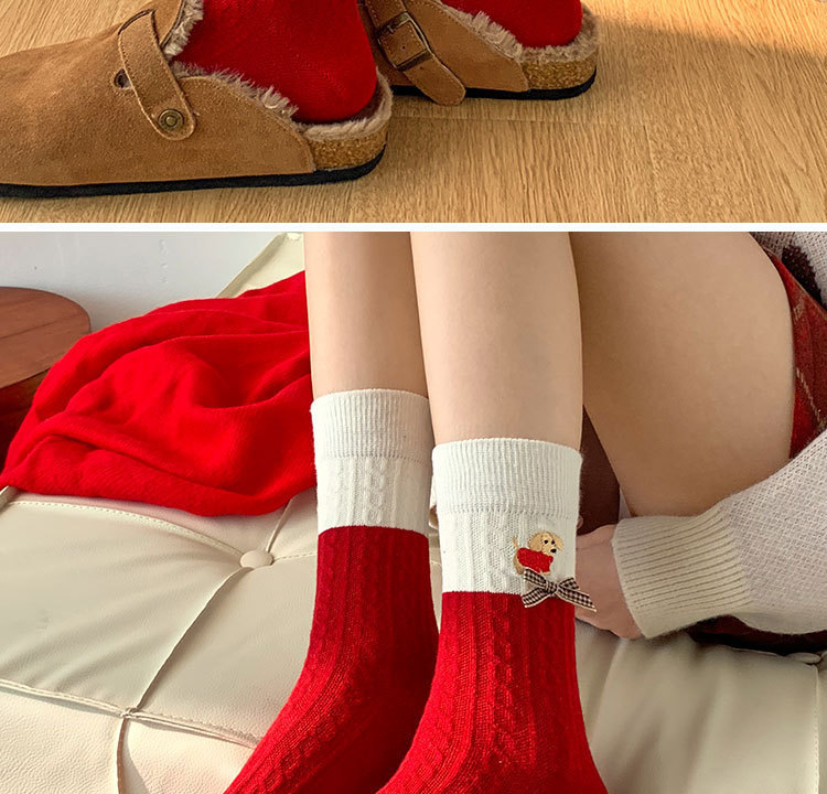 레드 양말 여성의 새해 양말 미드 튜브 코튼 양말 Ins 트렌디 자수 베어 천 라벨 새해 트위스트 레드 양말