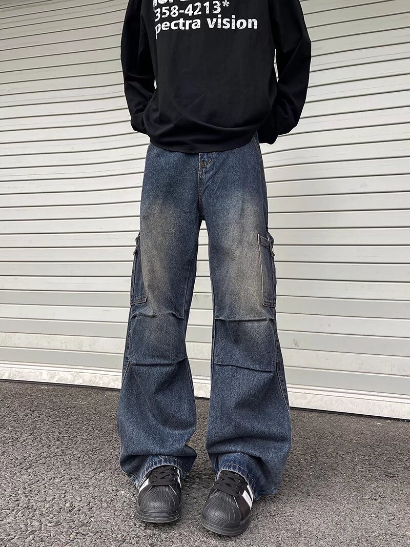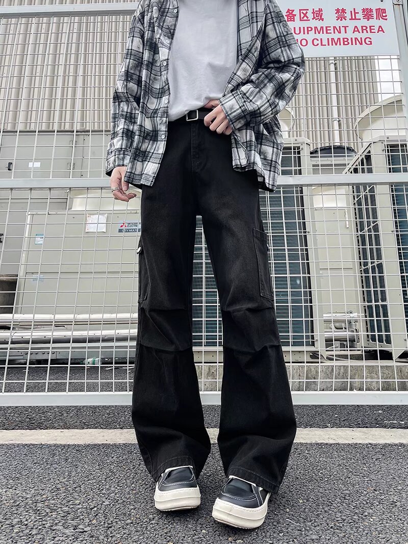 아메리칸 스타일 대형 포켓 오버롤 청바지 남성 봄과 가을 패션 브랜드 청소년 낙하산 캐주얼 바지 느슨한 넓은 다리 바지