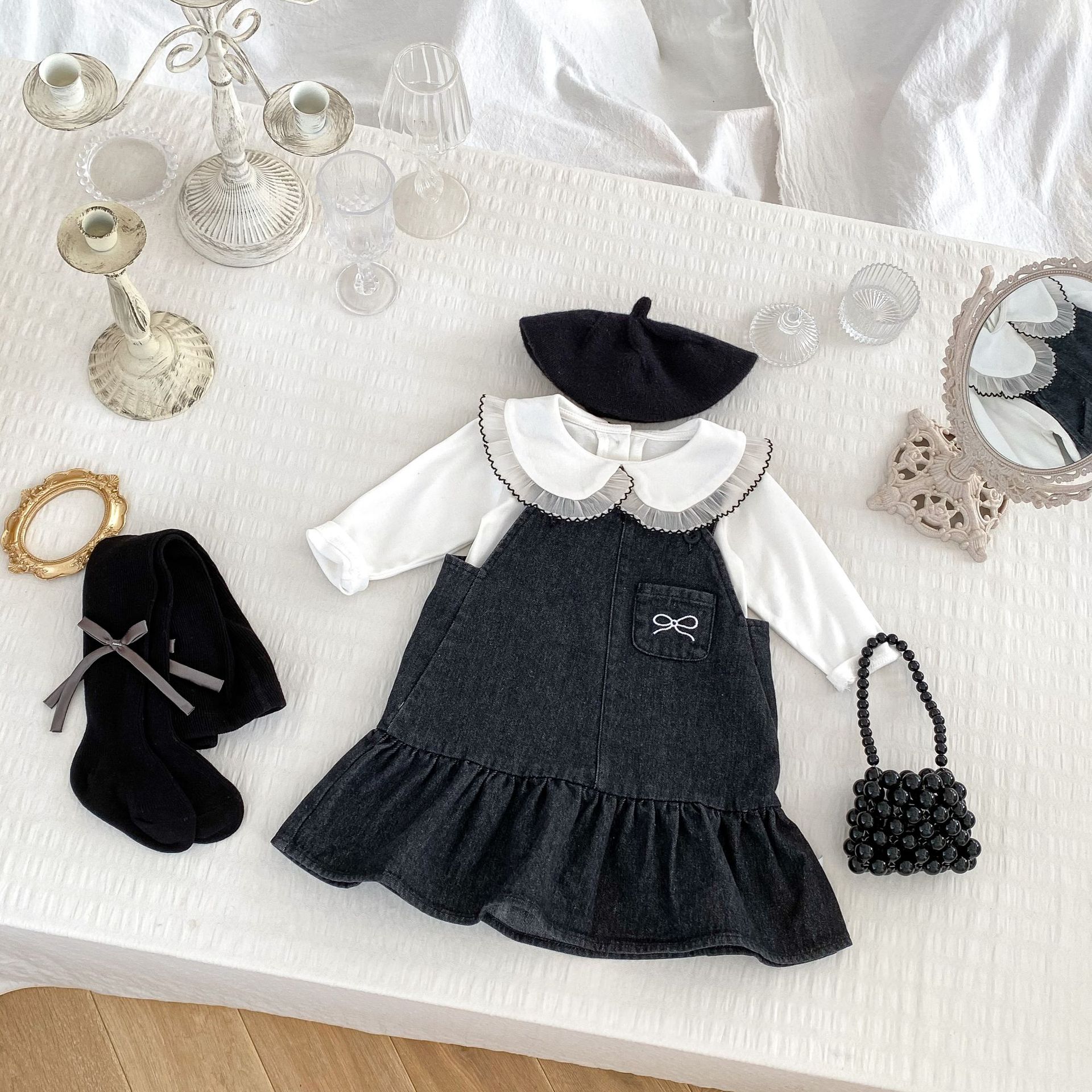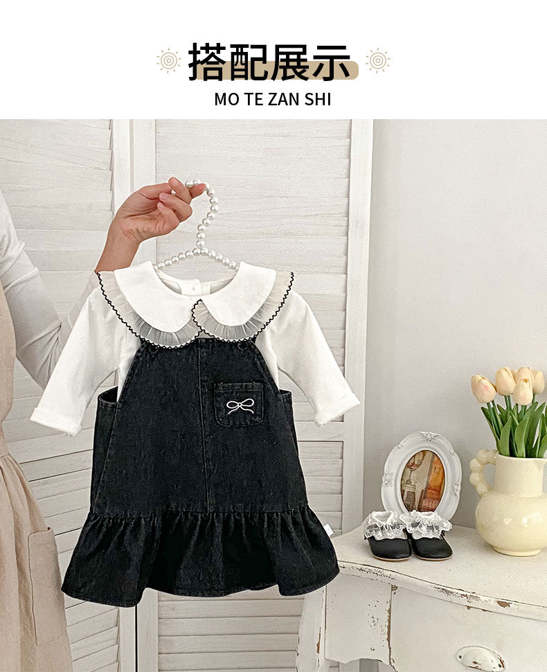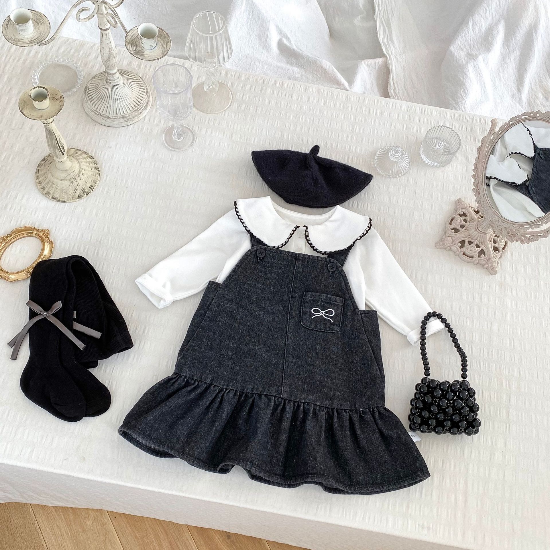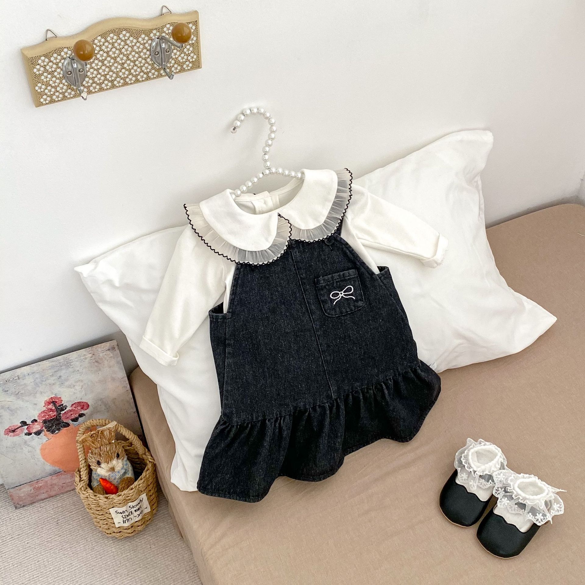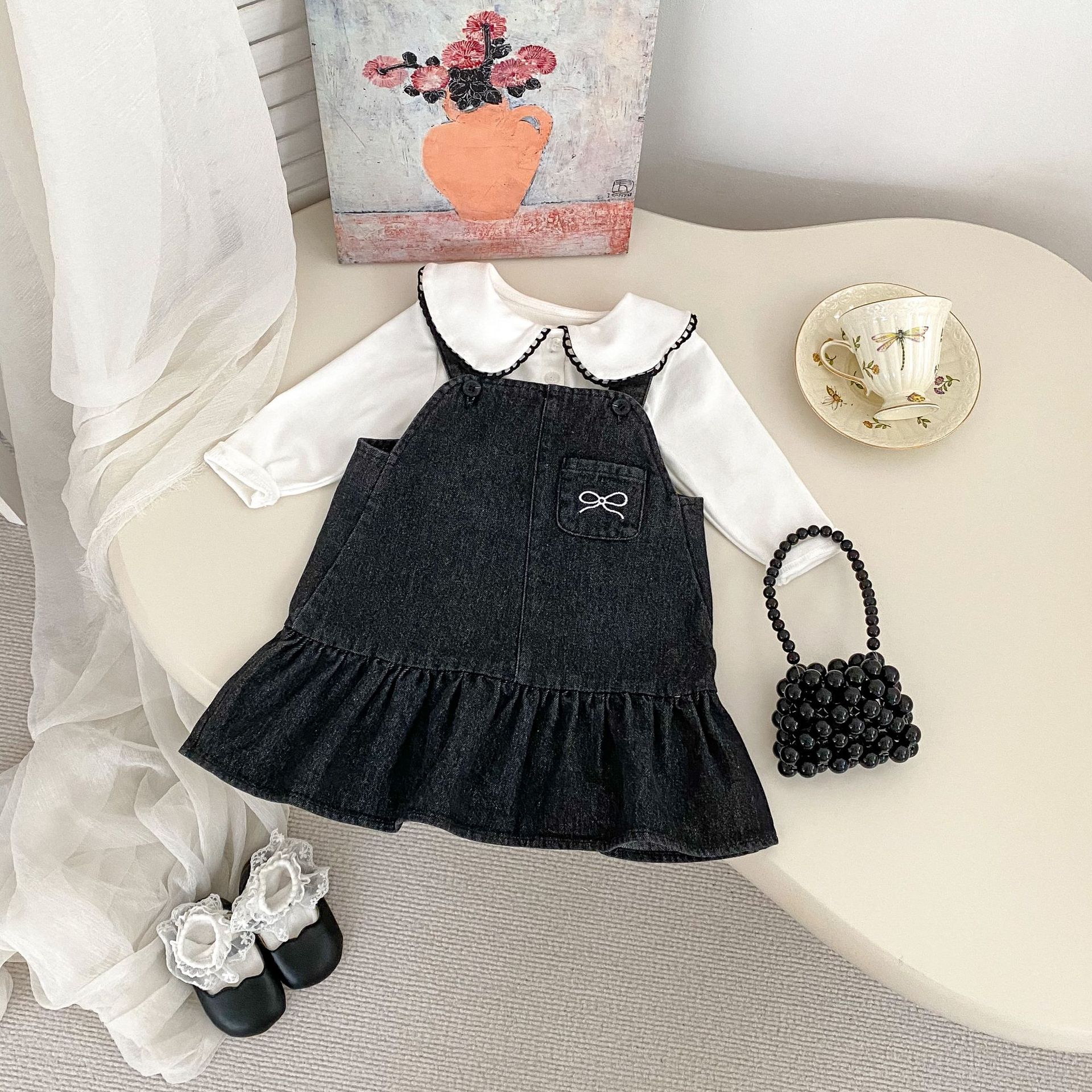 Ins 봄 새로운 아기 소녀 달콤한 간단한 활 데님 스트랩 드레스 인형 칼라 베이스 셔츠 투피스 세트