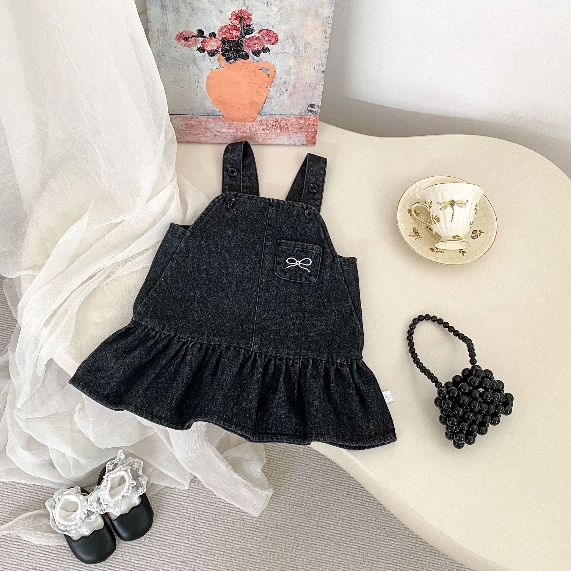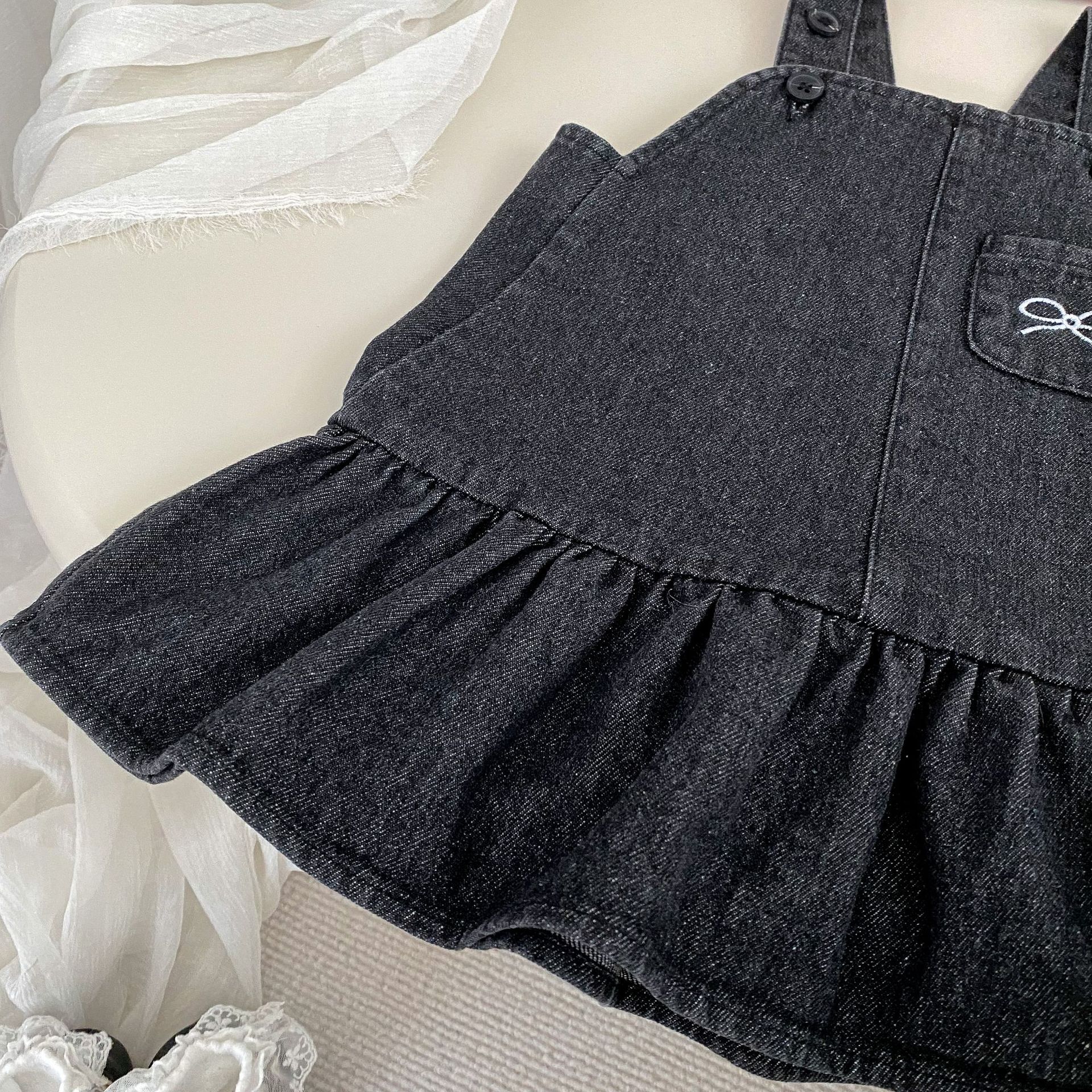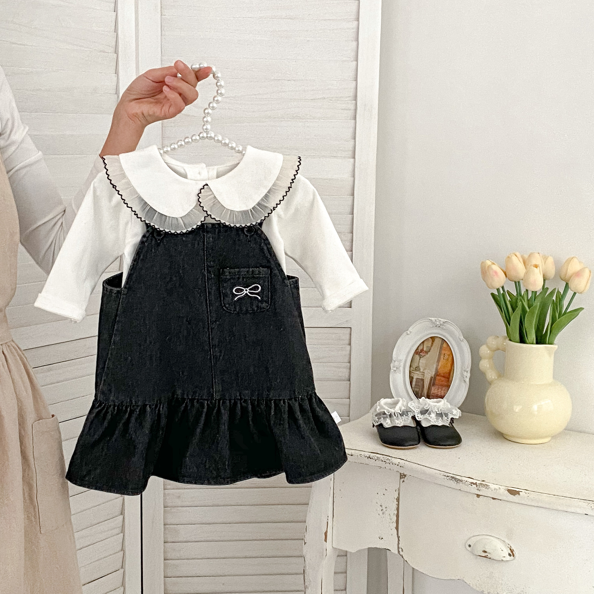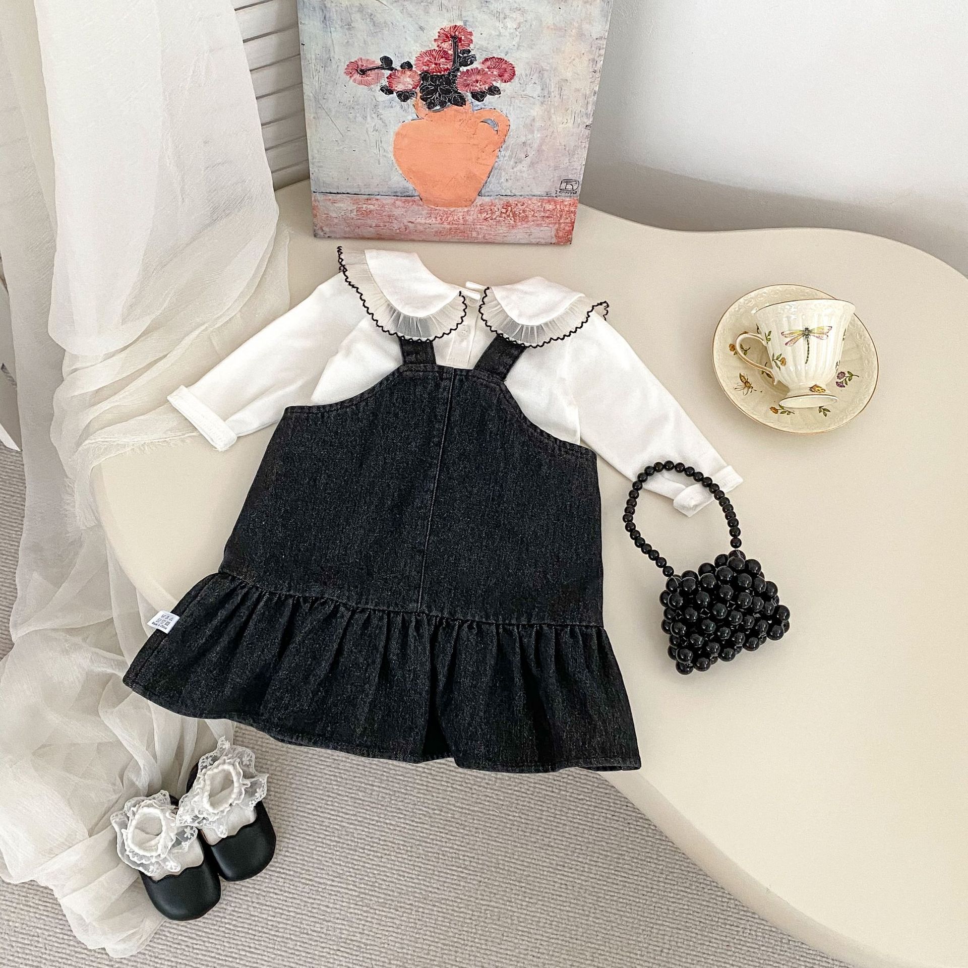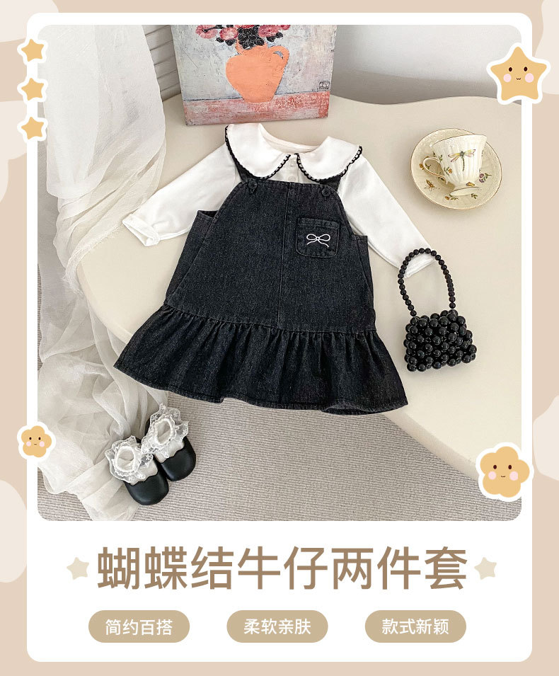 Ins 봄 새로운 아기 소녀 달콤한 간단한 활 데님 스트랩 드레스 인형 칼라 베이스 셔츠 투피스 세트