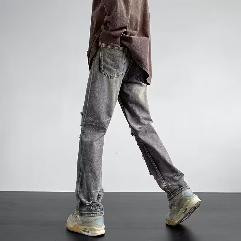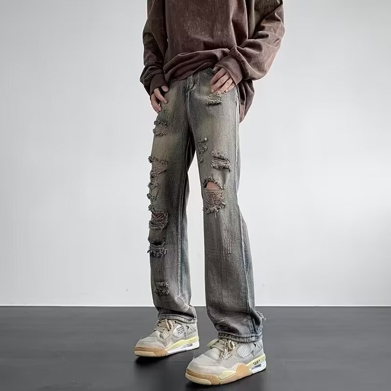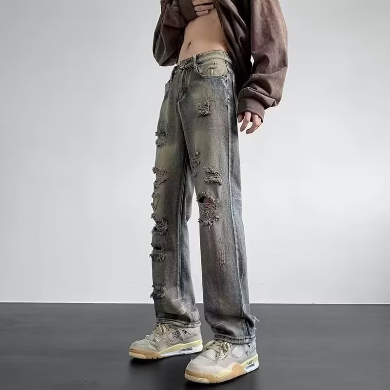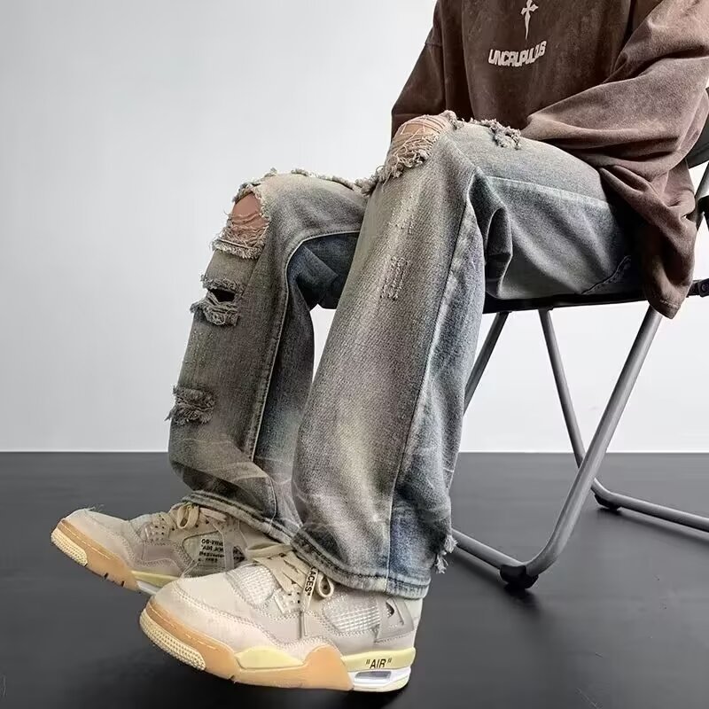 아메리칸 스타일 레트로 리핑 스트레이트 데님 바지 남성과 여성의 세탁 된 올드 하이 스트리트 바이브 스타일 루즈 캐주얼 트렌디 팬츠