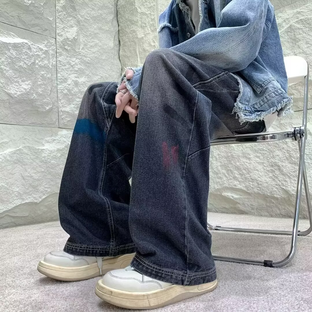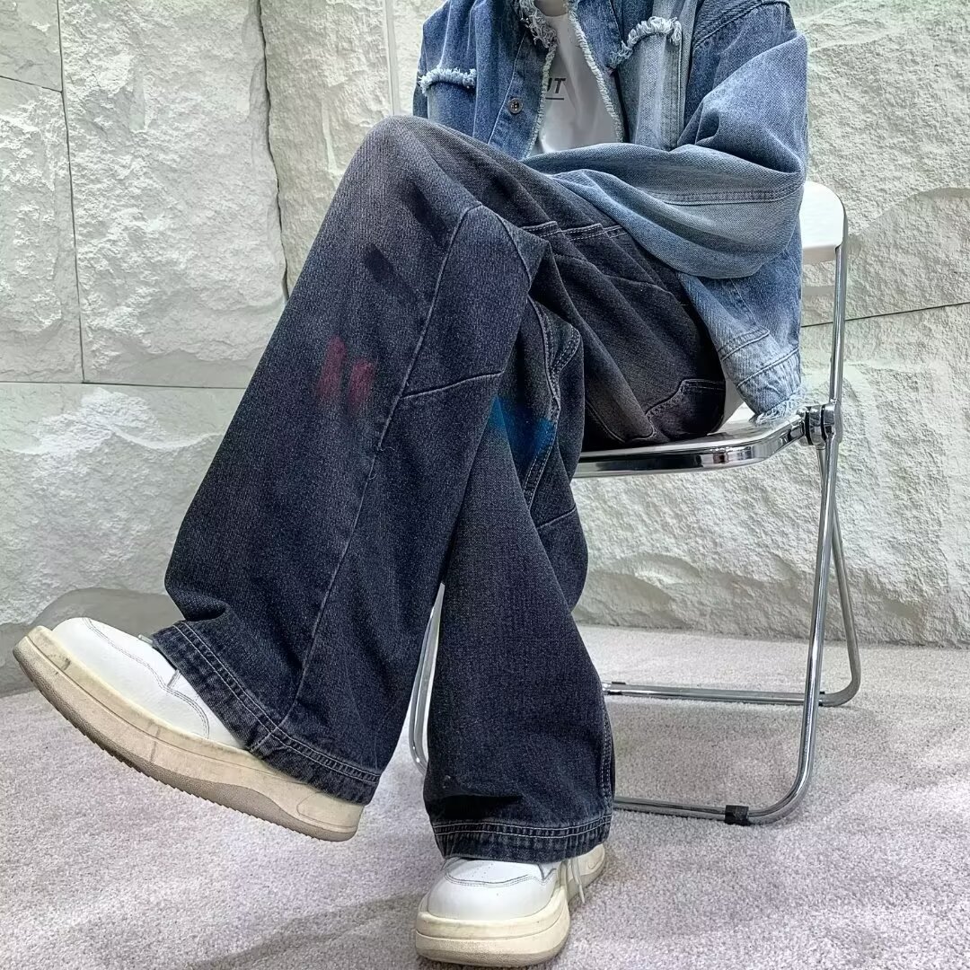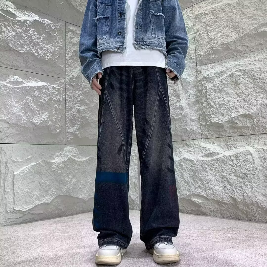 미국 스타일 복고풍 중공업 낙서 청바지 거리 패션 브랜드 스트레이트 와이드 다리 느슨한 남성용 3 차원 바지스토어 가기