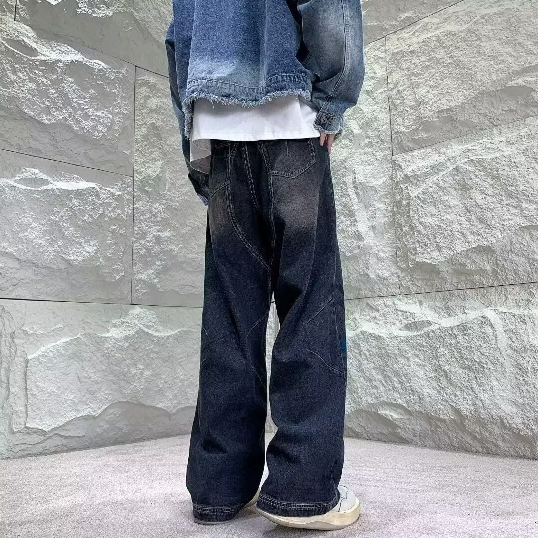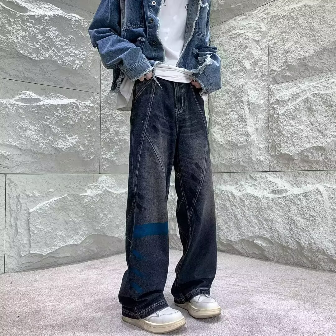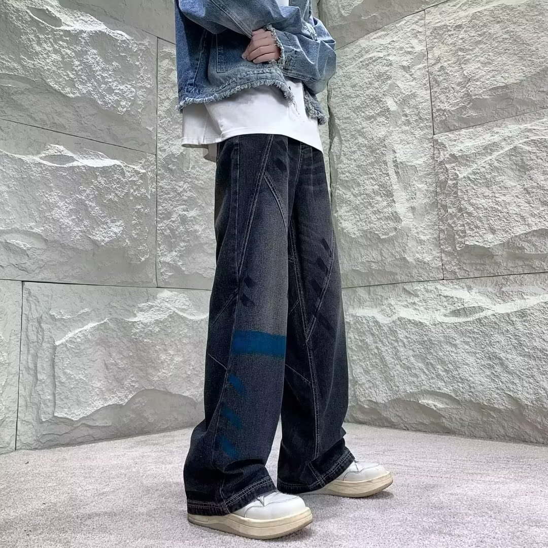 미국 스타일 복고풍 중공업 낙서 청바지 거리 패션 브랜드 스트레이트 와이드 다리 느슨한 남성용 3 차원 바지스토어 가기