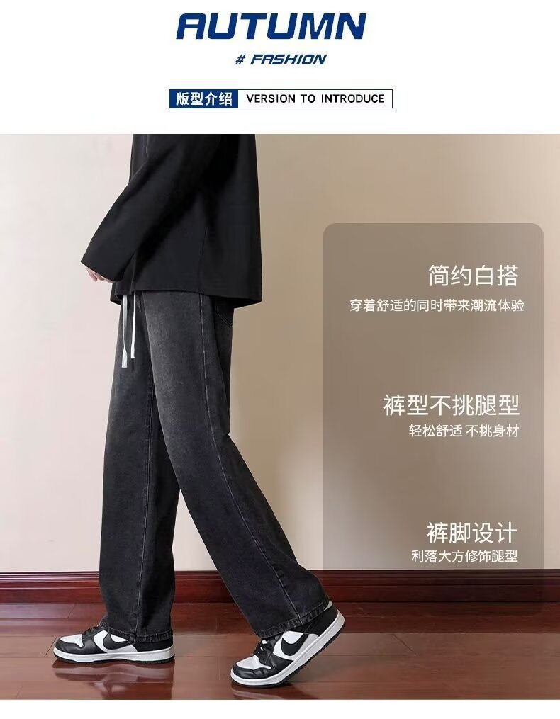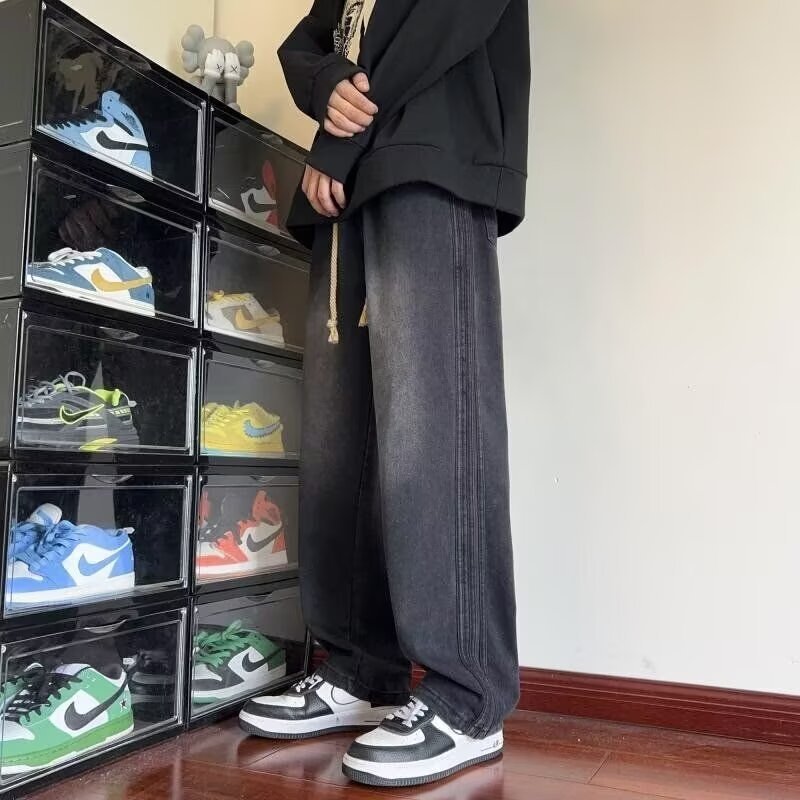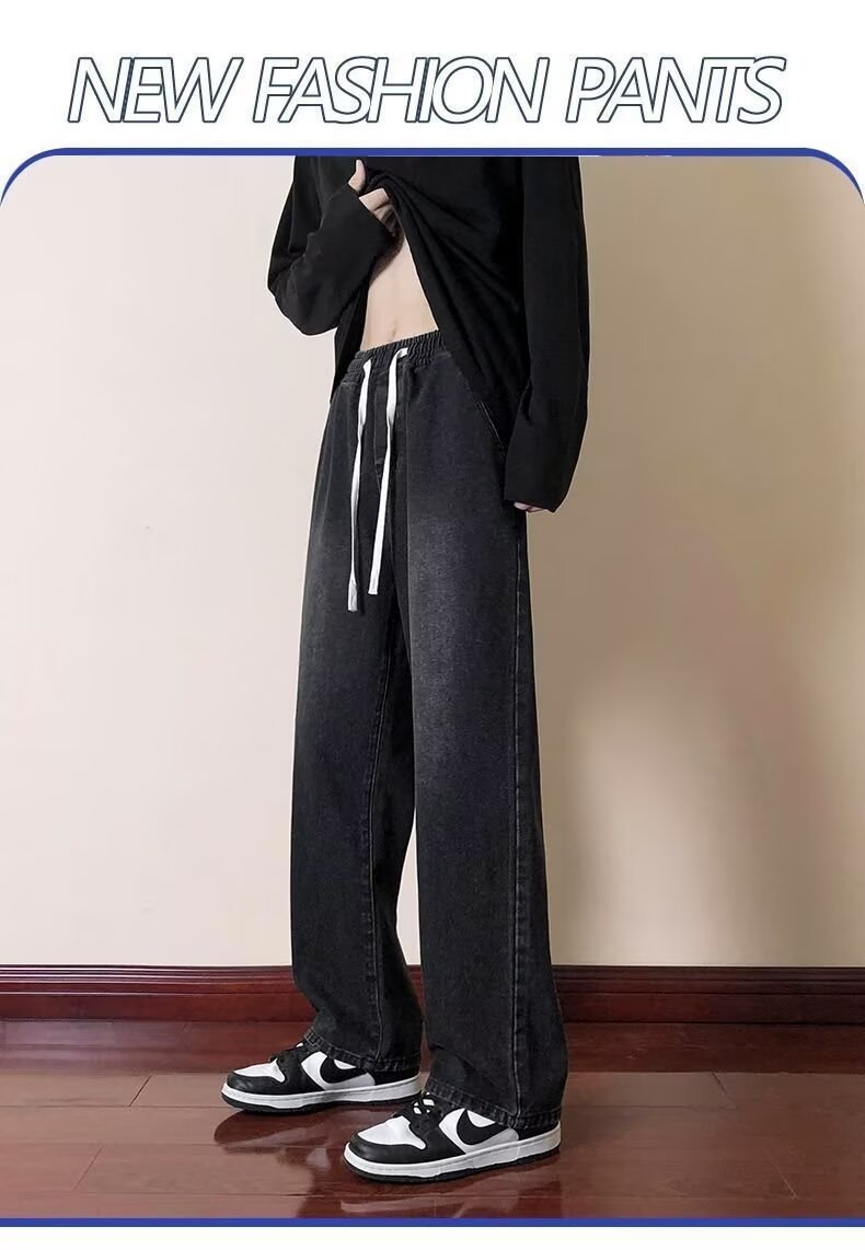 빈티지 청바지 남성용 봄과 가을 새로운 느슨한 스트레이트 바지 미국 하이 스트리트 드로우 스트링 와이드 레그 캐주얼 롱 팬츠스토어 가기