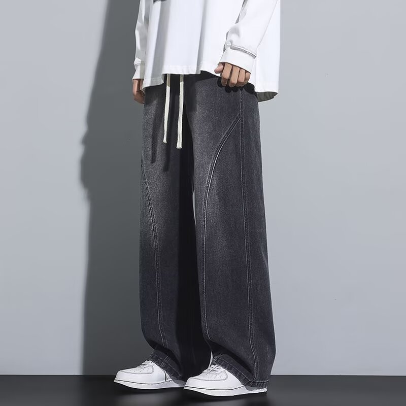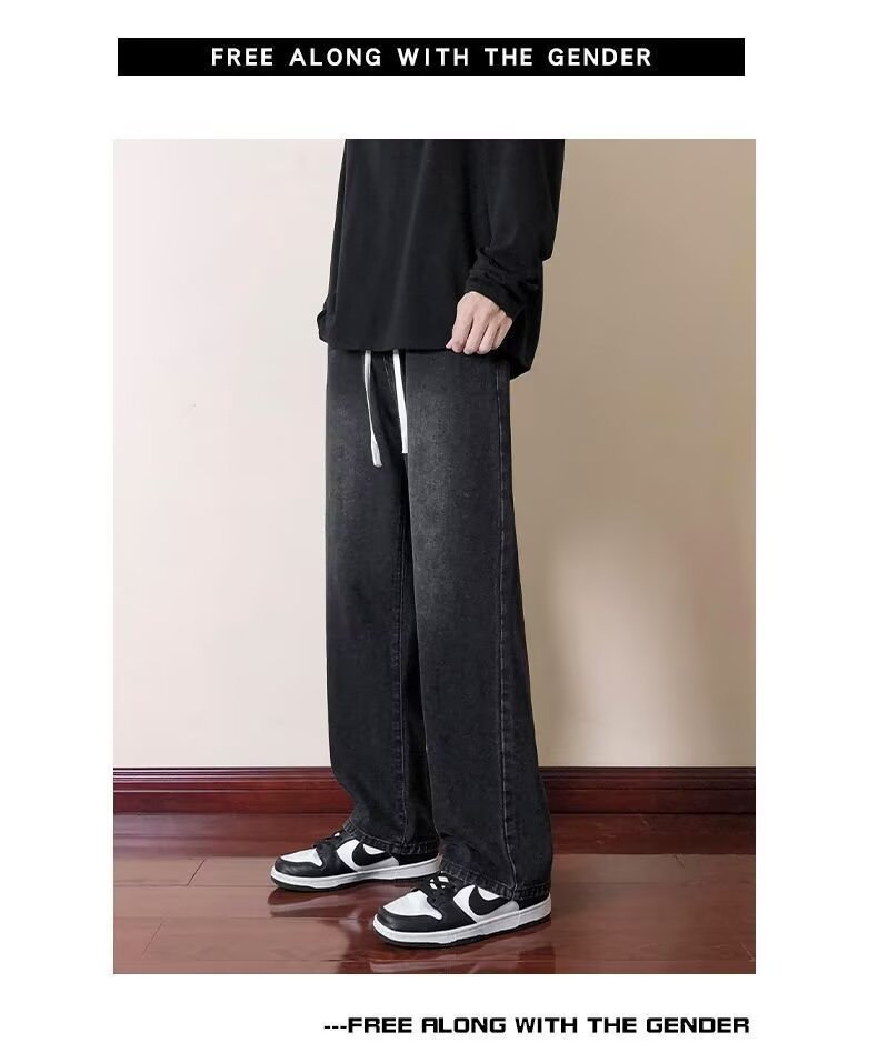 빈티지 청바지 남성용 봄과 가을 새로운 느슨한 스트레이트 바지 미국 하이 스트리트 드로우 스트링 와이드 레그 캐주얼 롱 팬츠