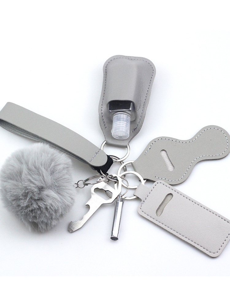 아마존 보석 야외 휘파람 7 피스 키 체인 패션 가죽 손 소독제 가죽 커버 모피 볼 키 링