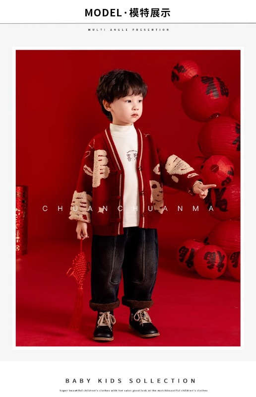 소년 빨간 스웨터 카디건 니트 스웨터 재킷 가을과 겨울 2025 새로운 어린이 두꺼운 새해 의류 신년 의류 패션스토어 가기